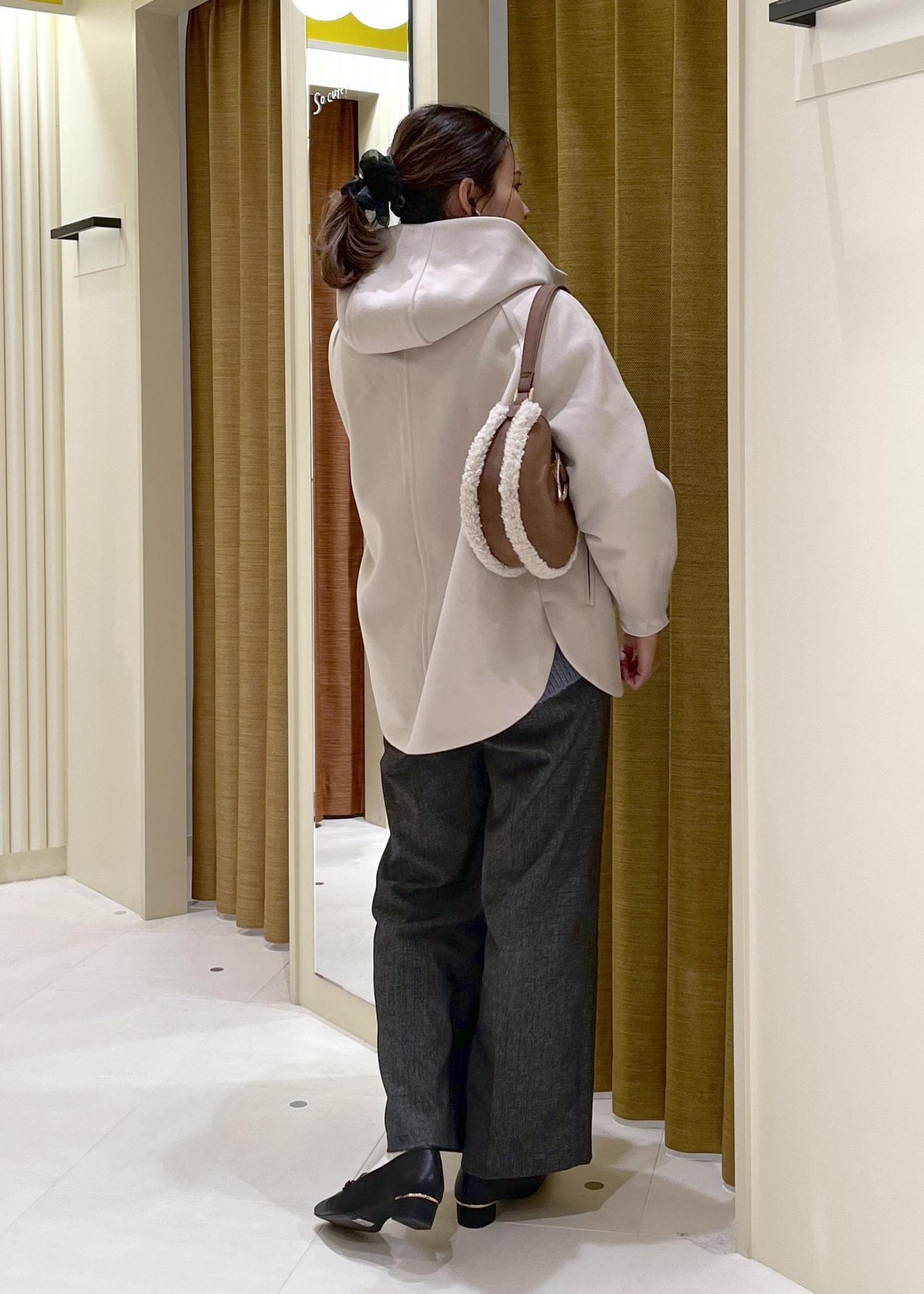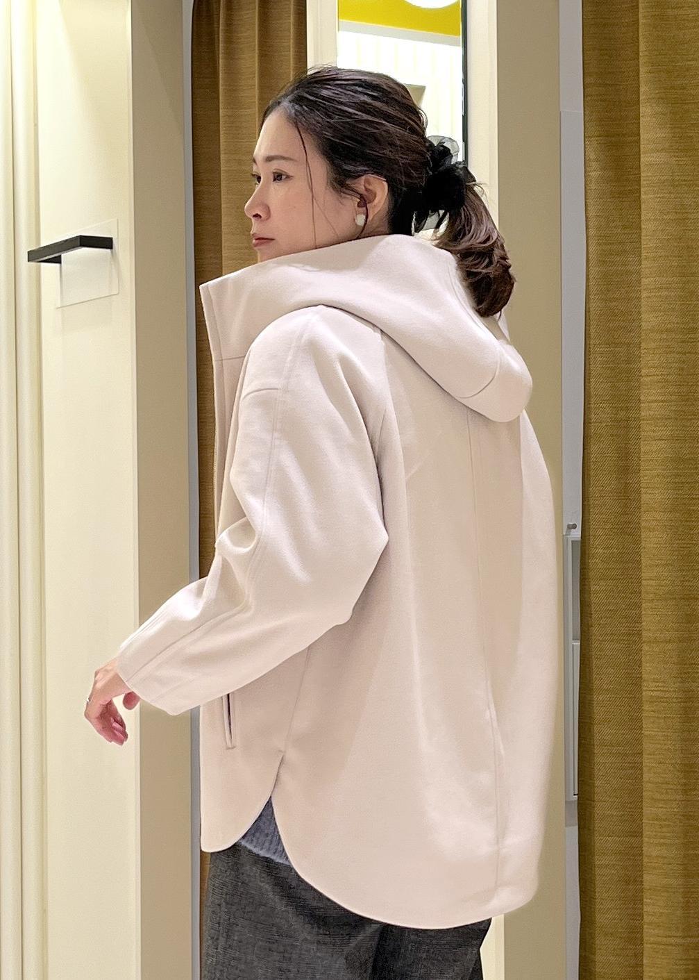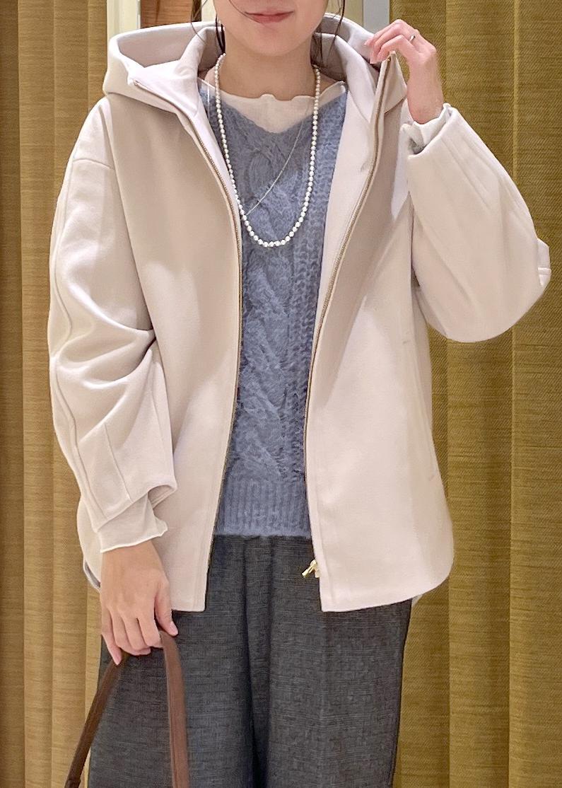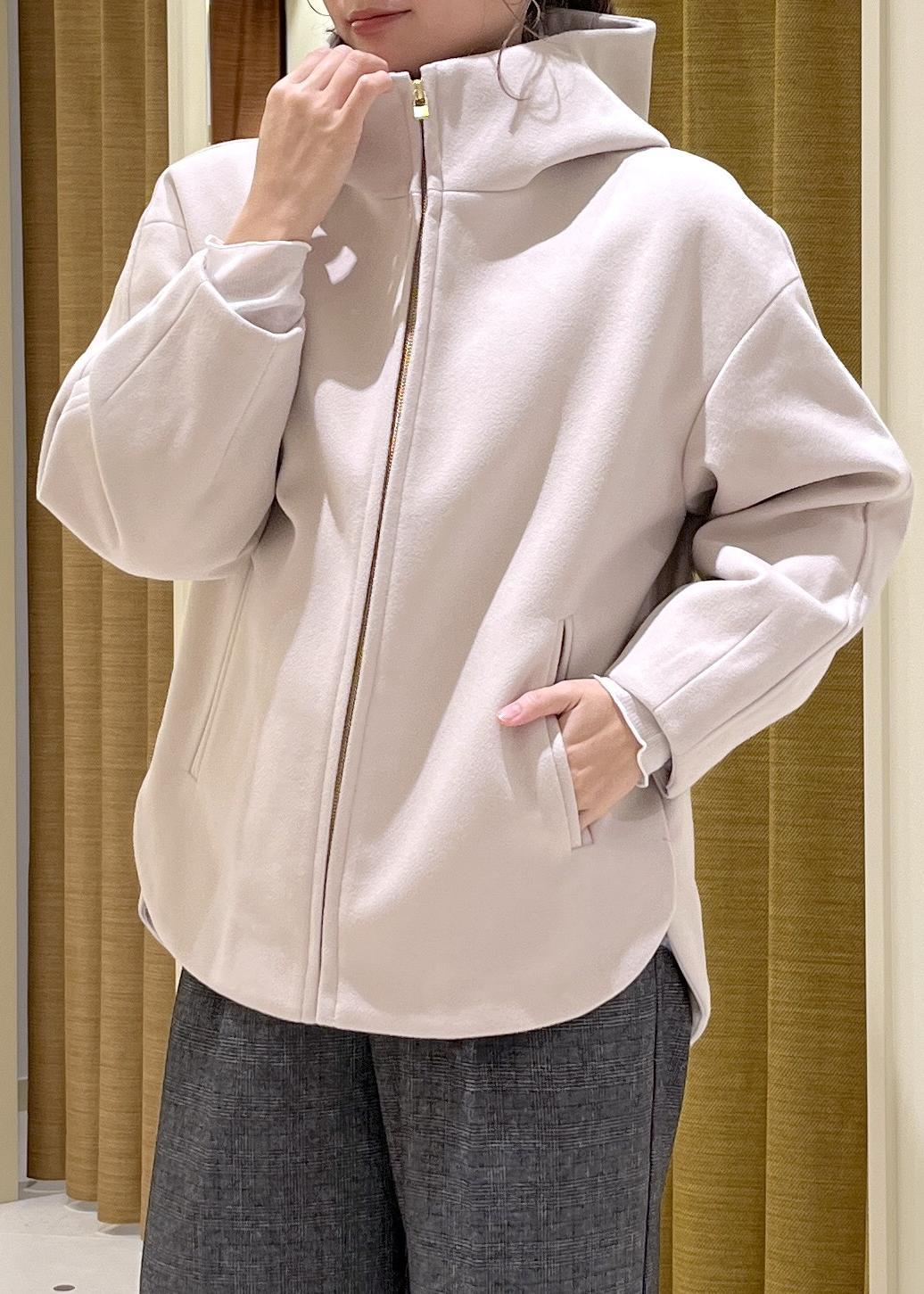 きれいめアイテムやカジュアルなアイテムどちらにも合わせやすいフーディデザインのアウター。