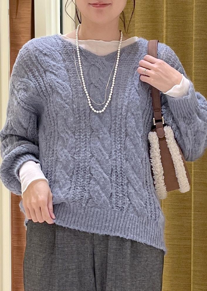 ROPÉ PICNICゆるケーブル編みVネックニットブルー系 / F¥5,489レビューざっくり編み地のニット。お尻に少しかかるくらい長さがあります。