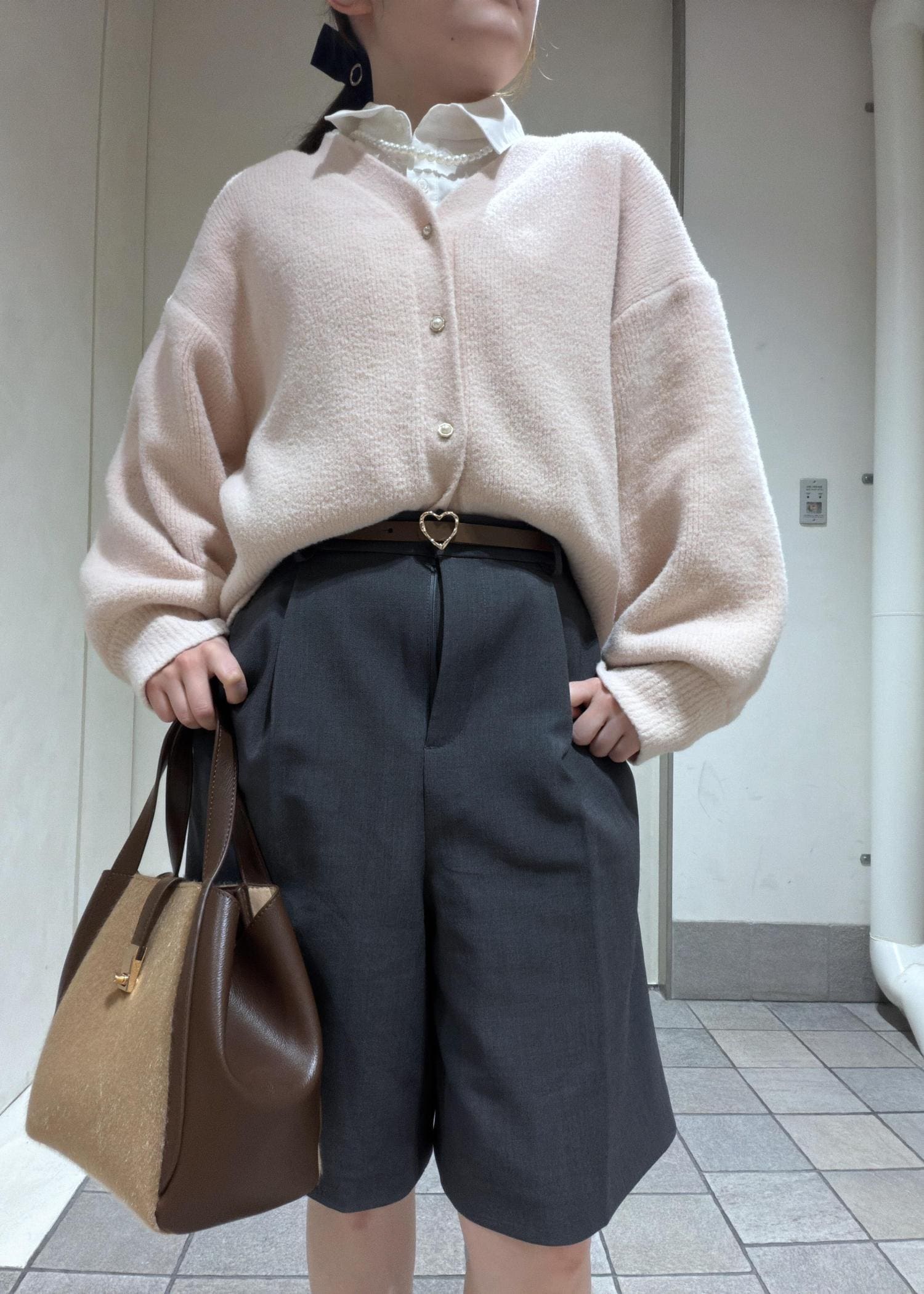 ピンクのカーディガン×グレーのハーフパンツで、かわいいだけじゃない、大人っぽさも表現。小物をブラウン系で揃えたところもポイントです!