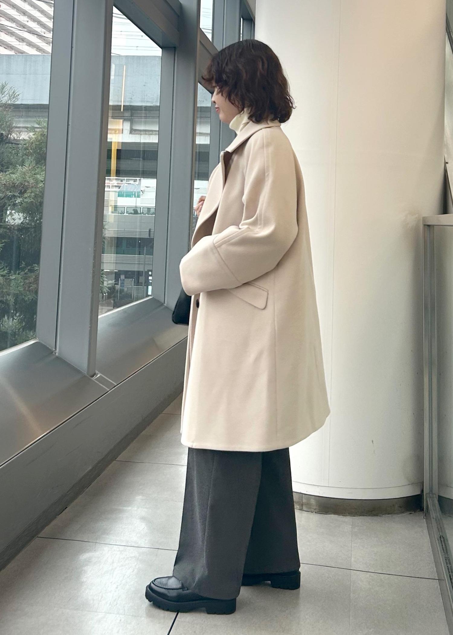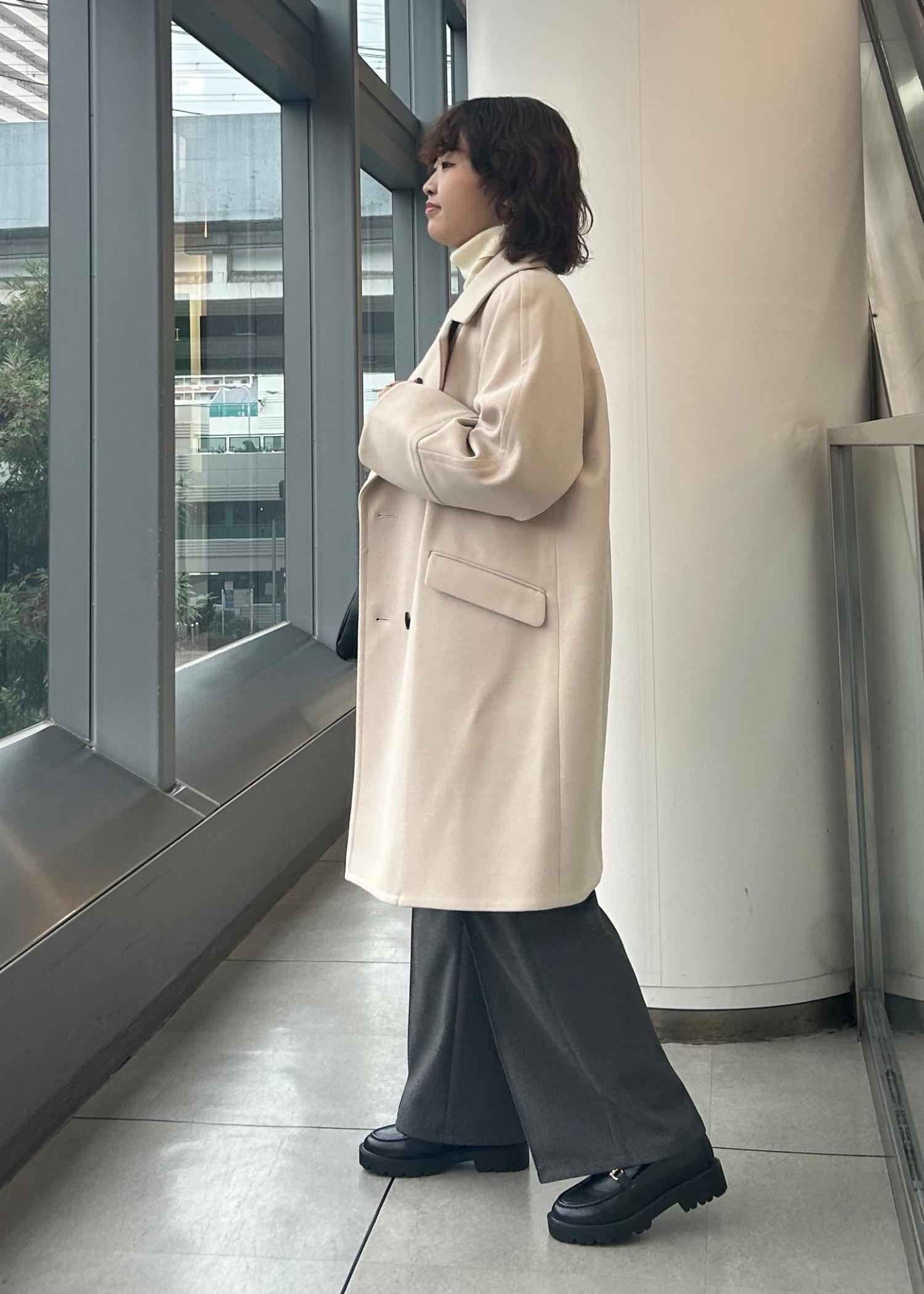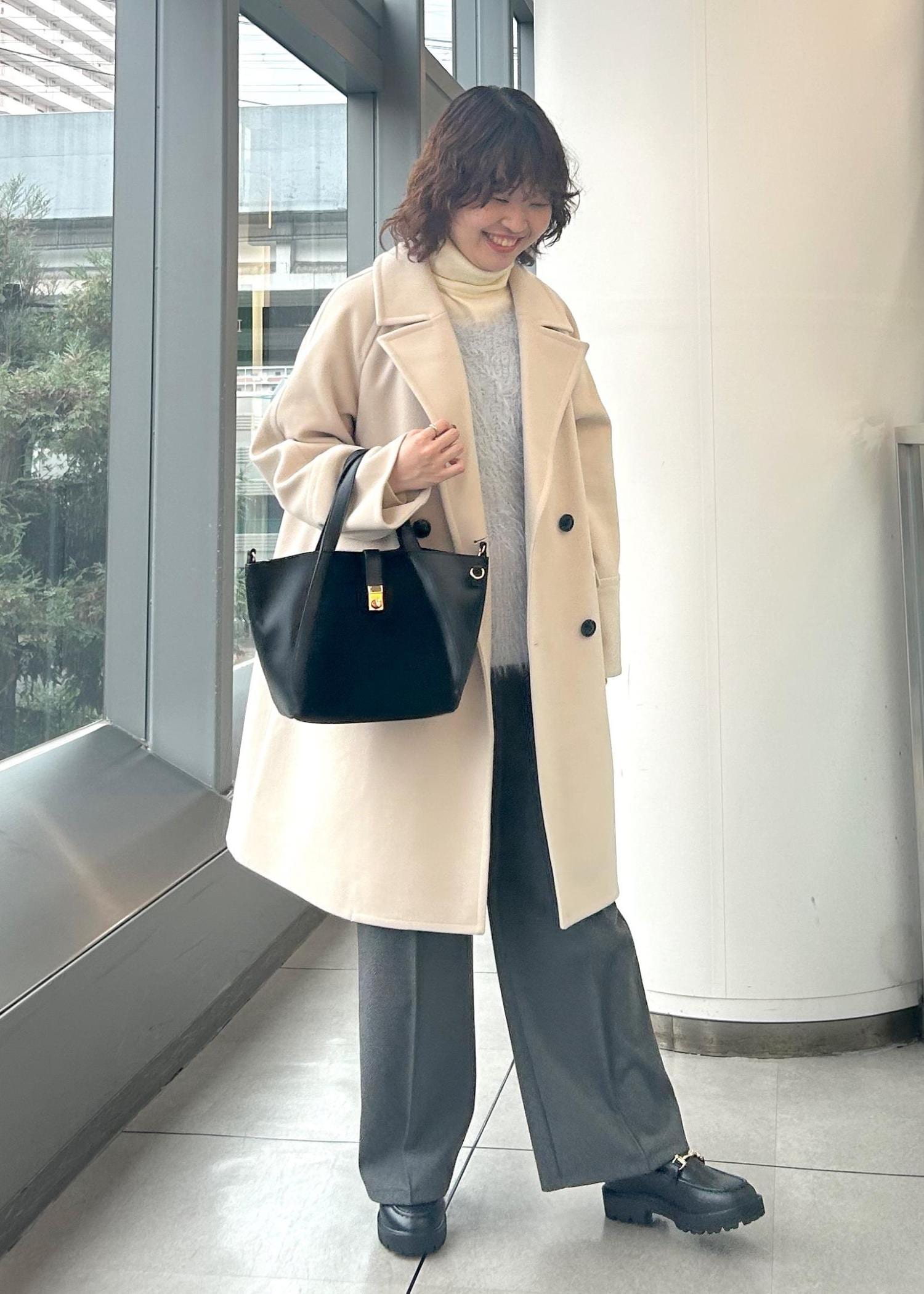 ロングコートとハイネックを白に合わせ、冬らしいコーデをしました。