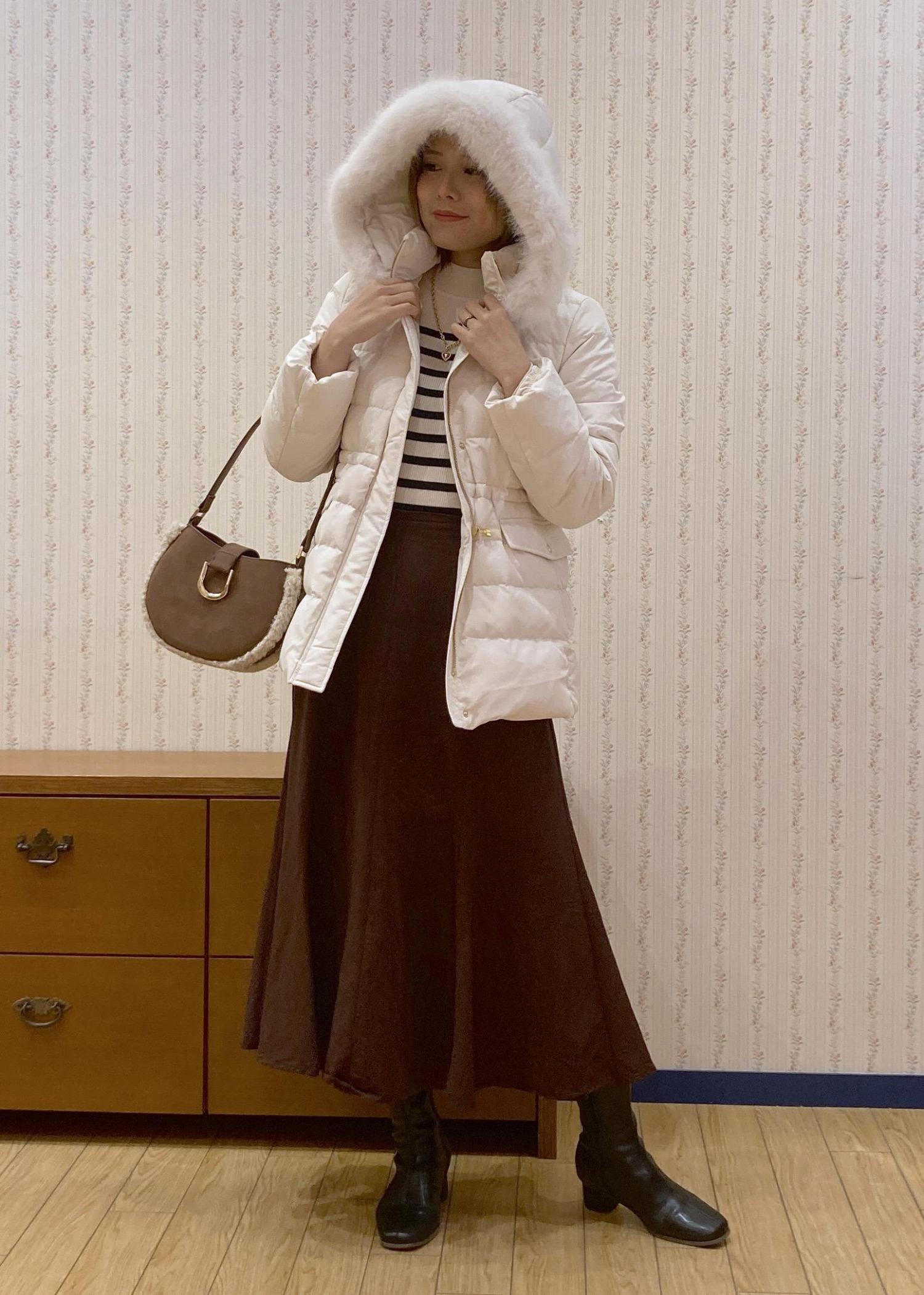 白のミドル丈ダウンコートが主役の冬デートにオススメのキレイめコーディネートです。