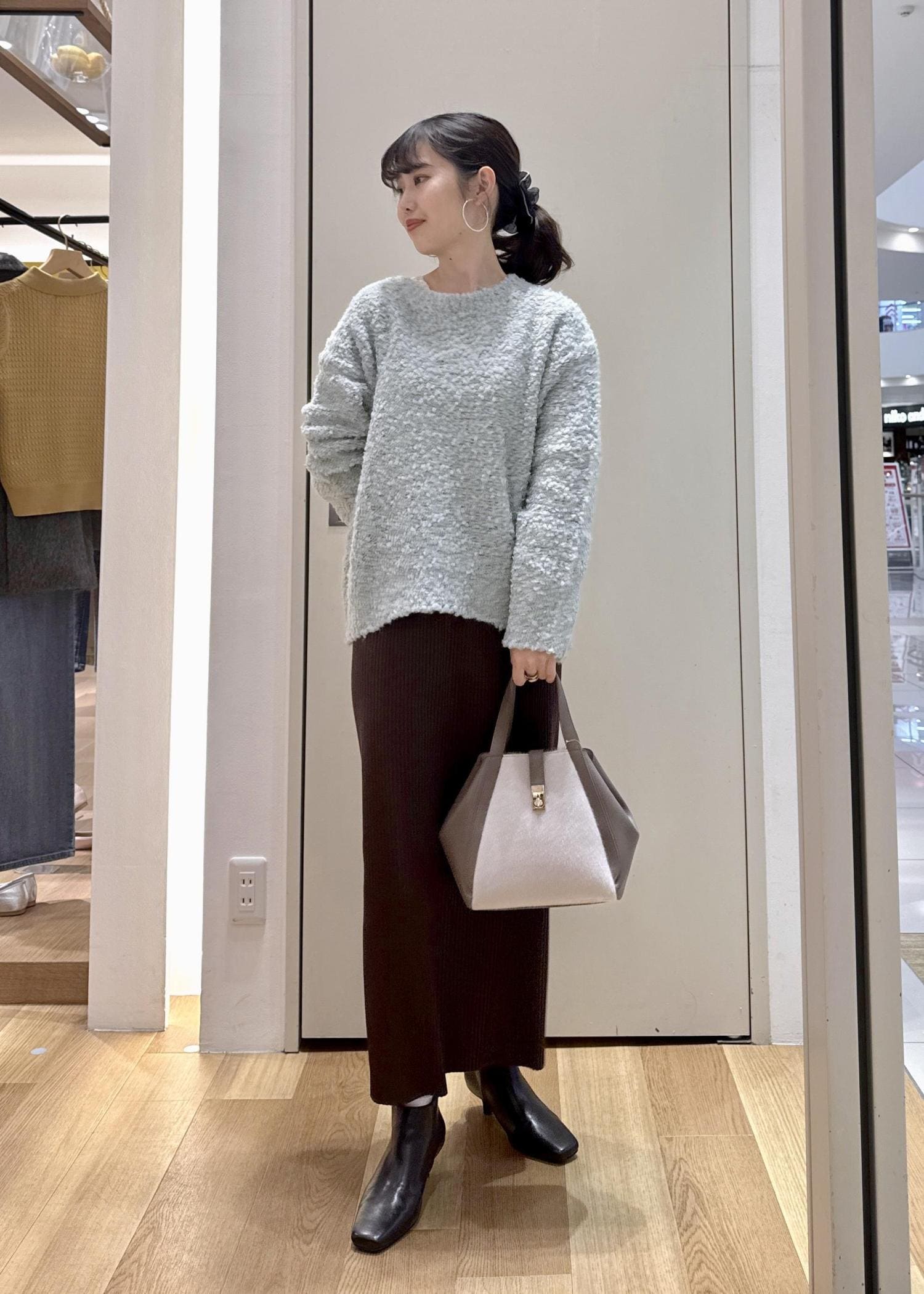 柔らかいミントグリーンのニットに人気のリブタイトスカートと合わせてフェミニンな印象に仕上げました。
