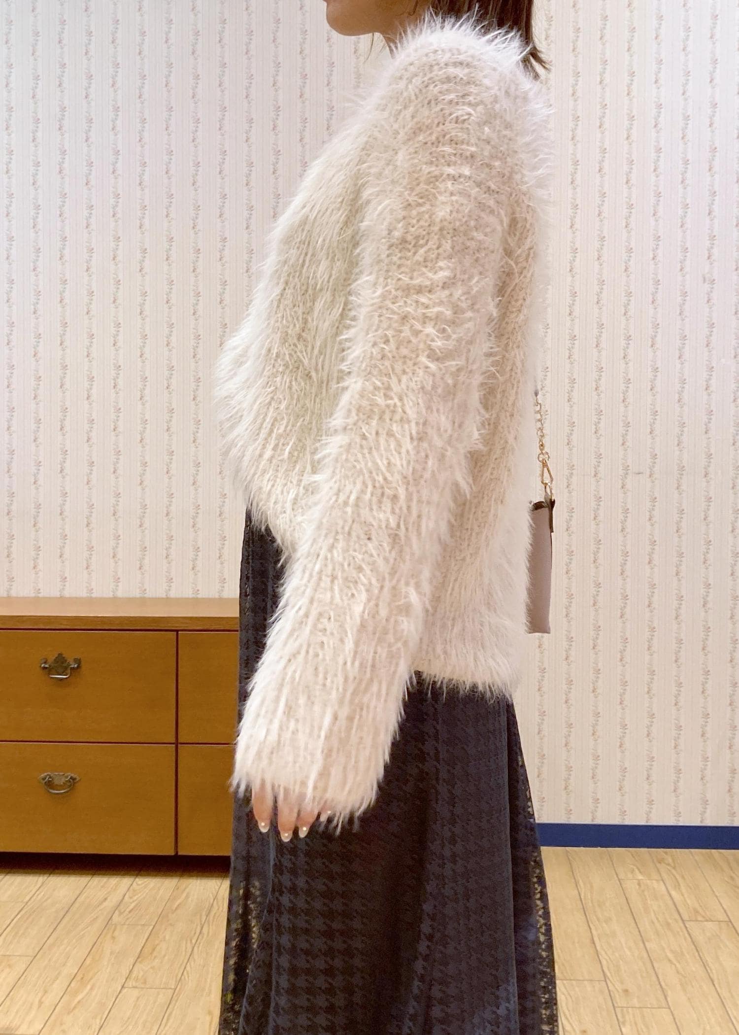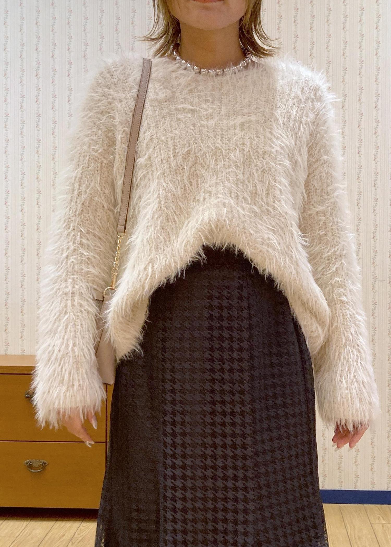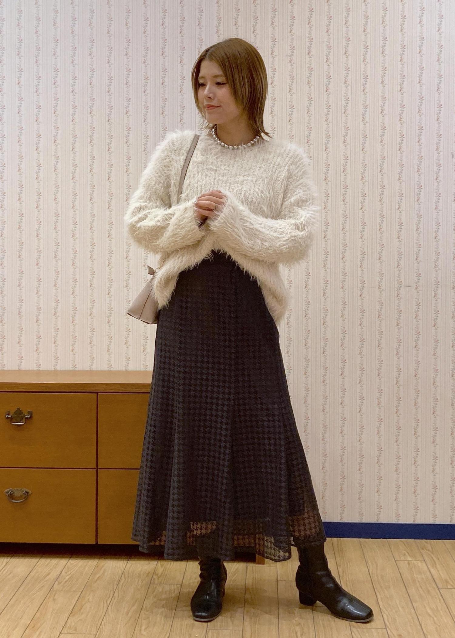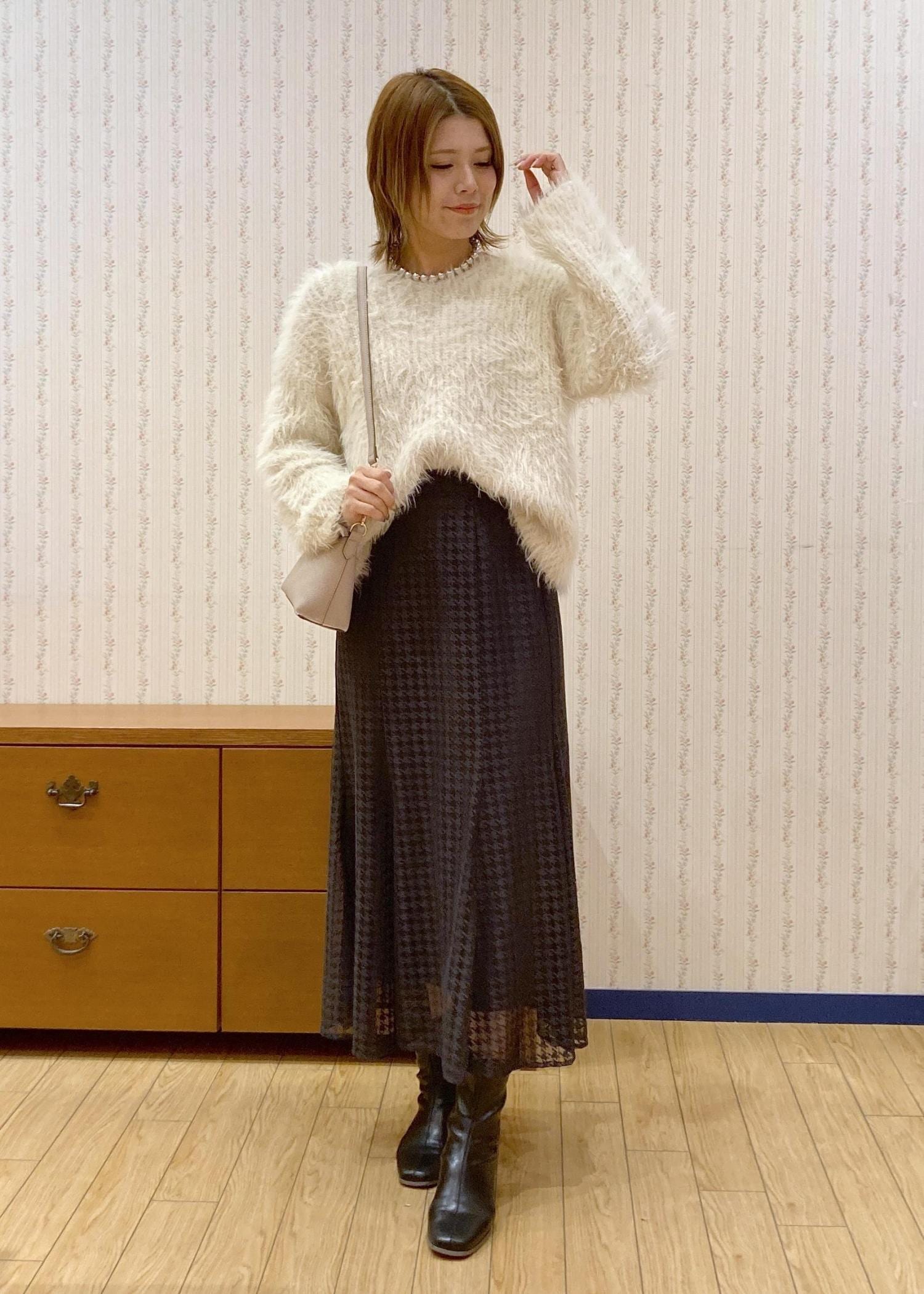 毛足長めのふわふわニットが主役のキレイめフェミニンなデートコーディネートです。