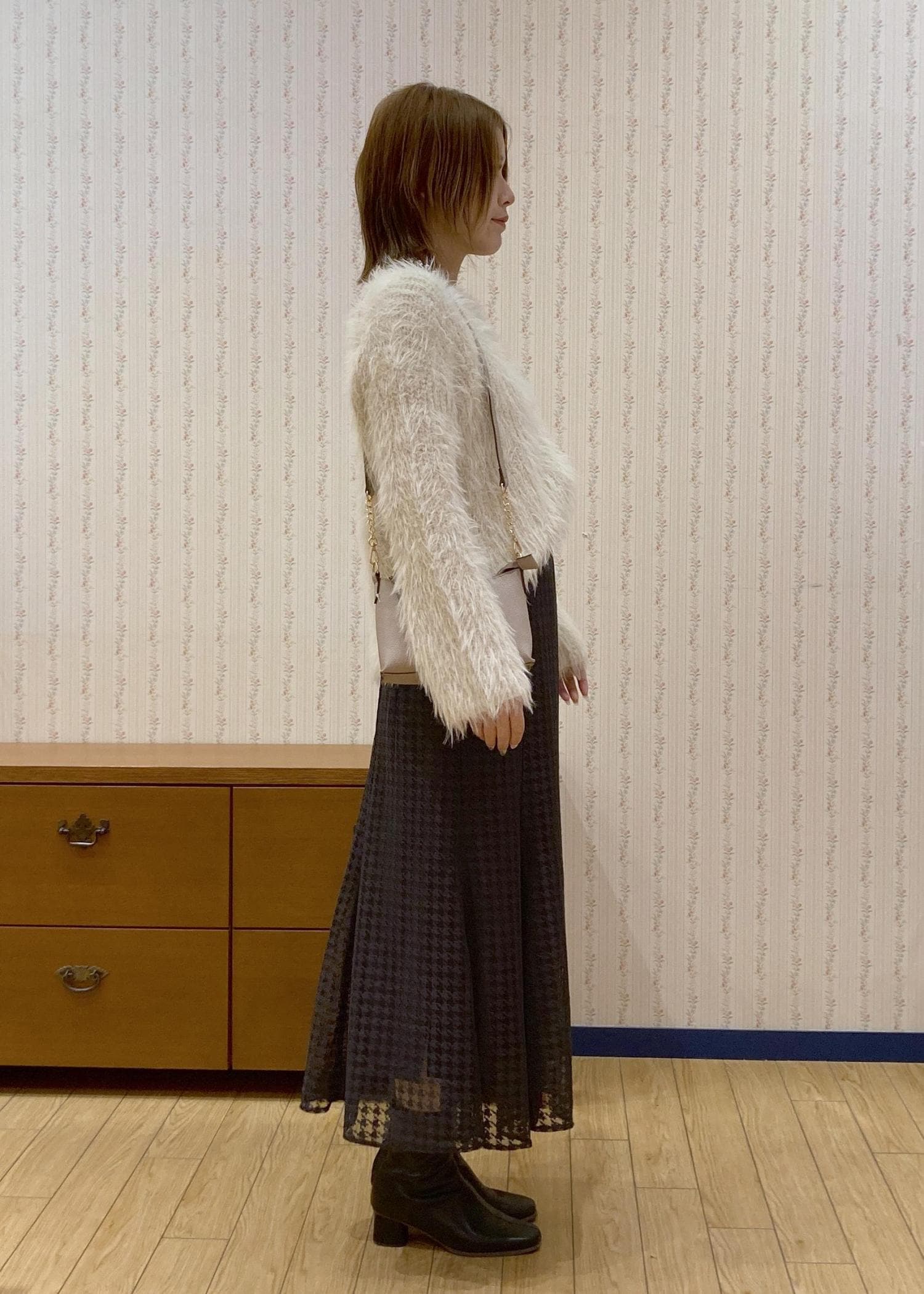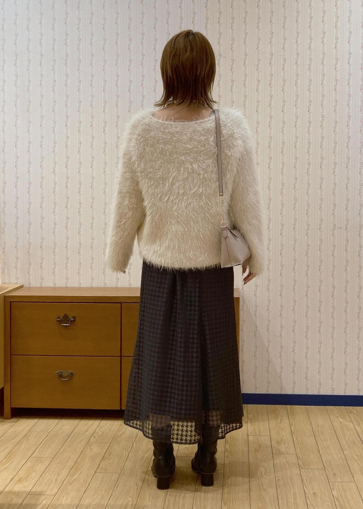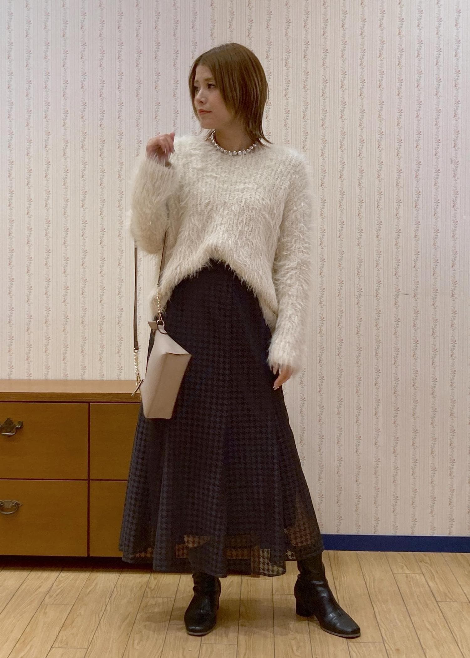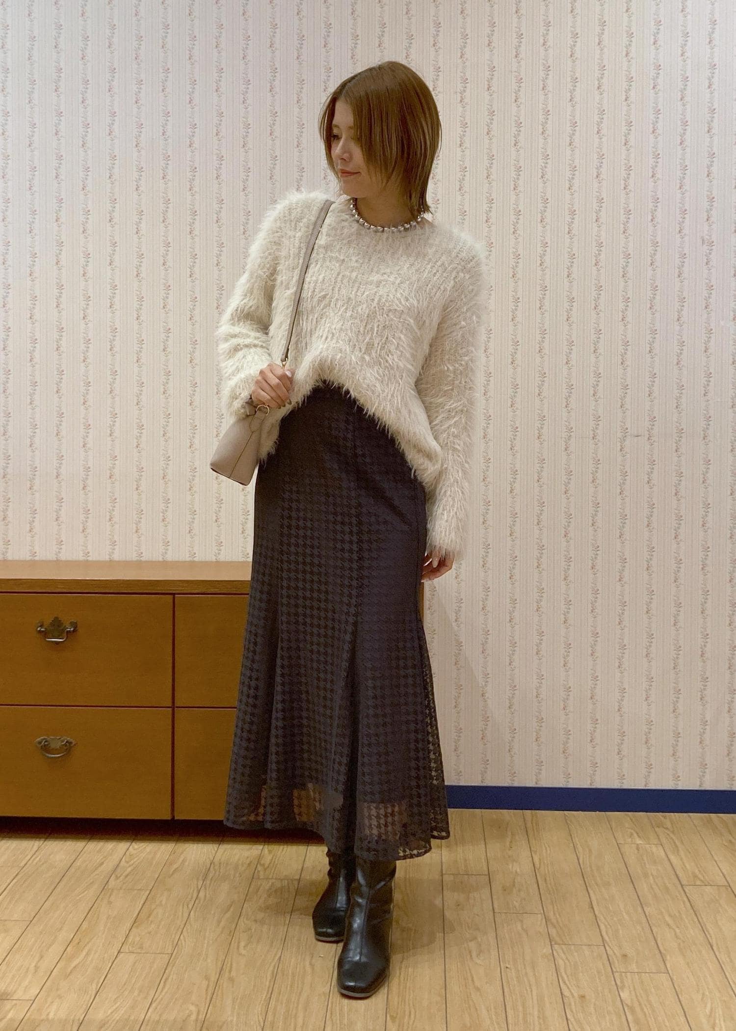 毛足長めのふわふわニットが主役のキレイめフェミニンなデートコーディネートです。