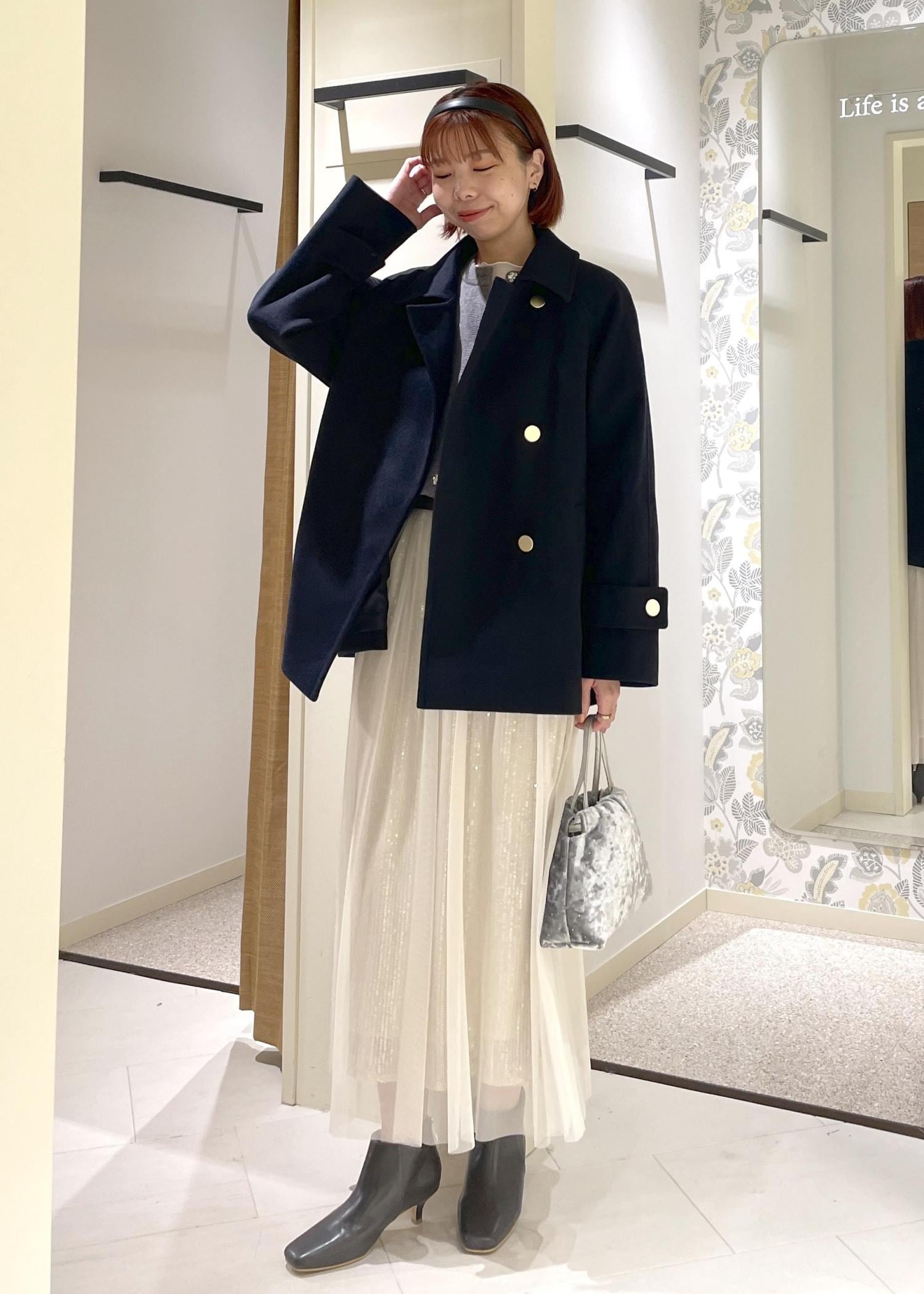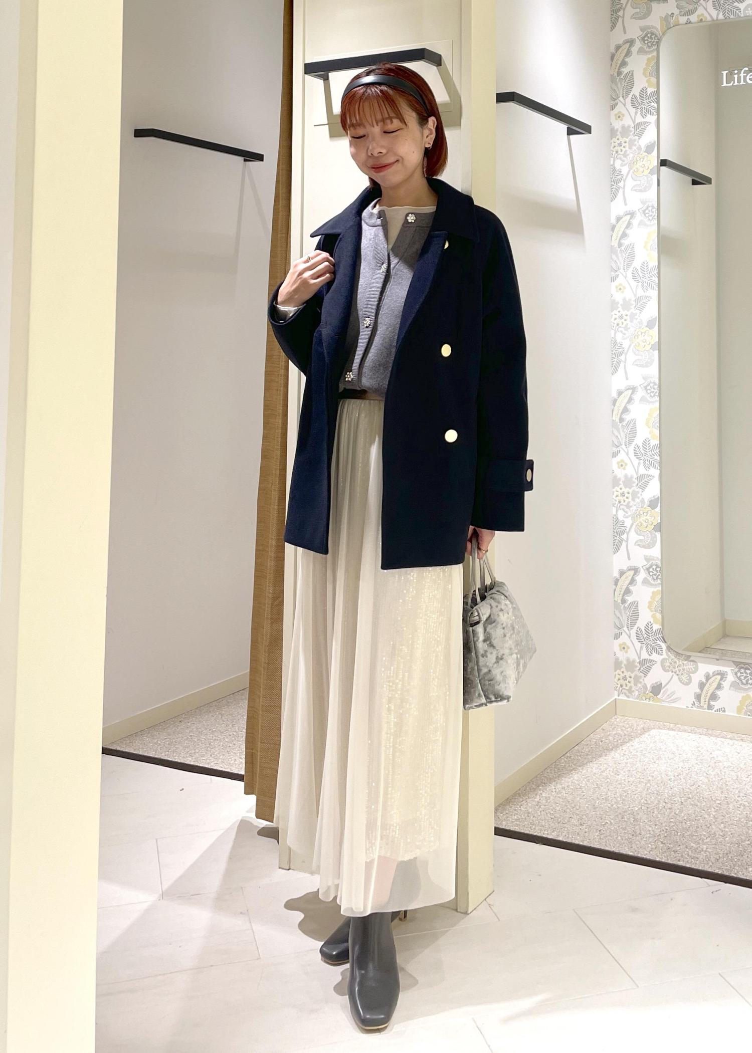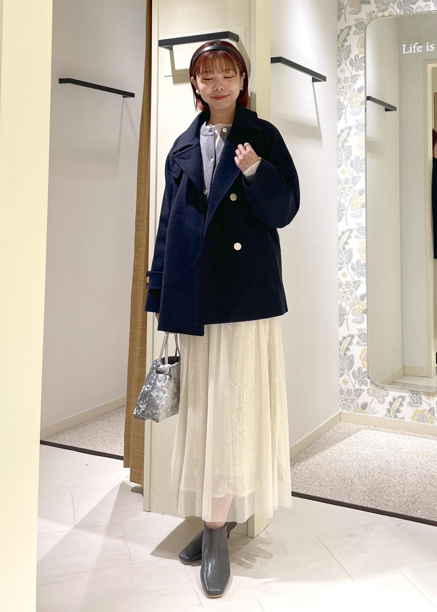 ネイビーの金ボタンコートを羽織ってすっきりと、小物をグレー系でまとめて統一感をプラスしたのがポイントです◎