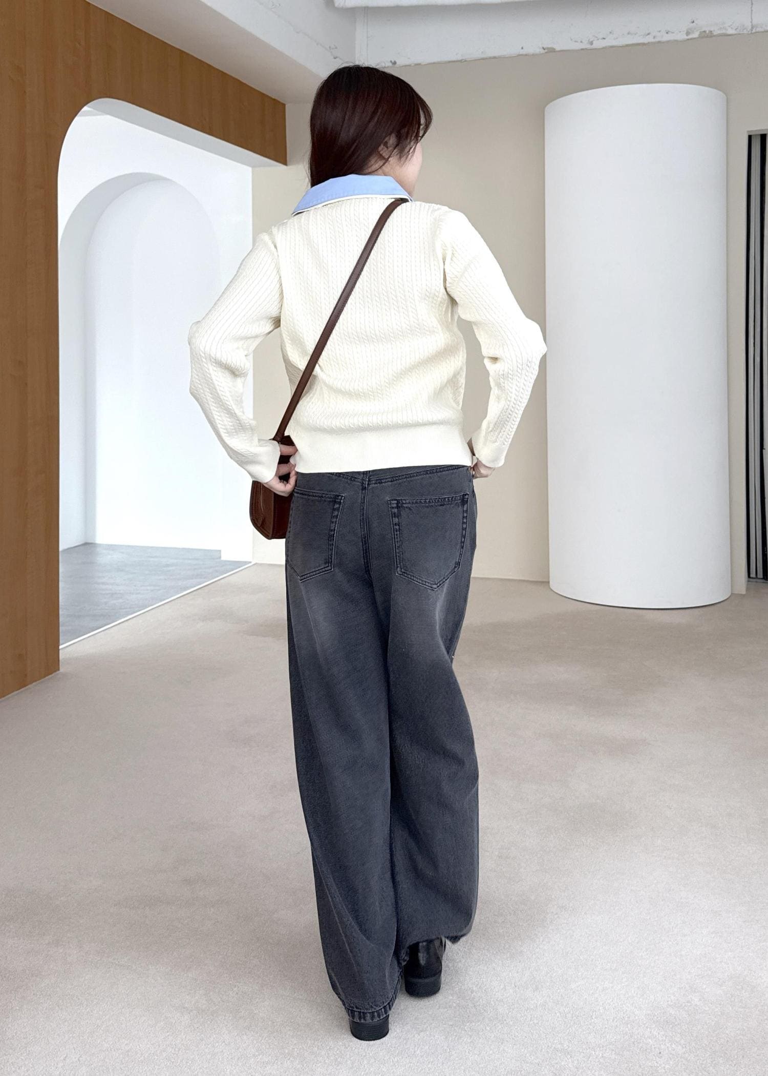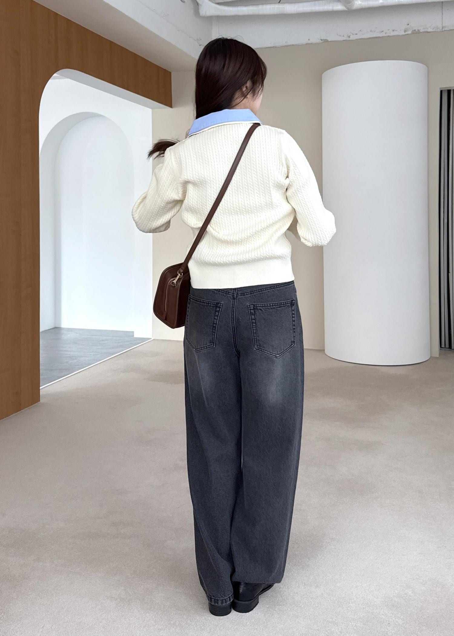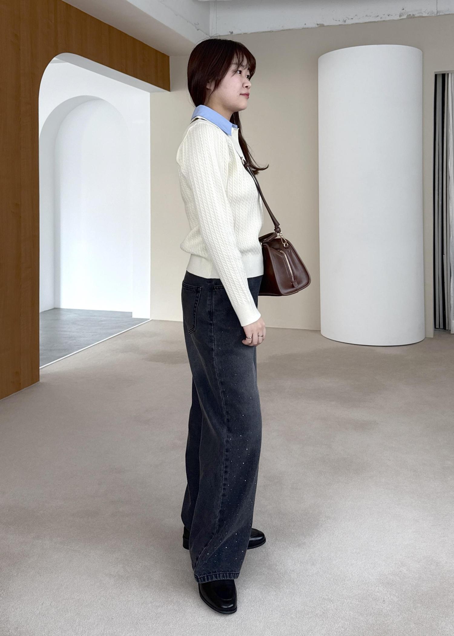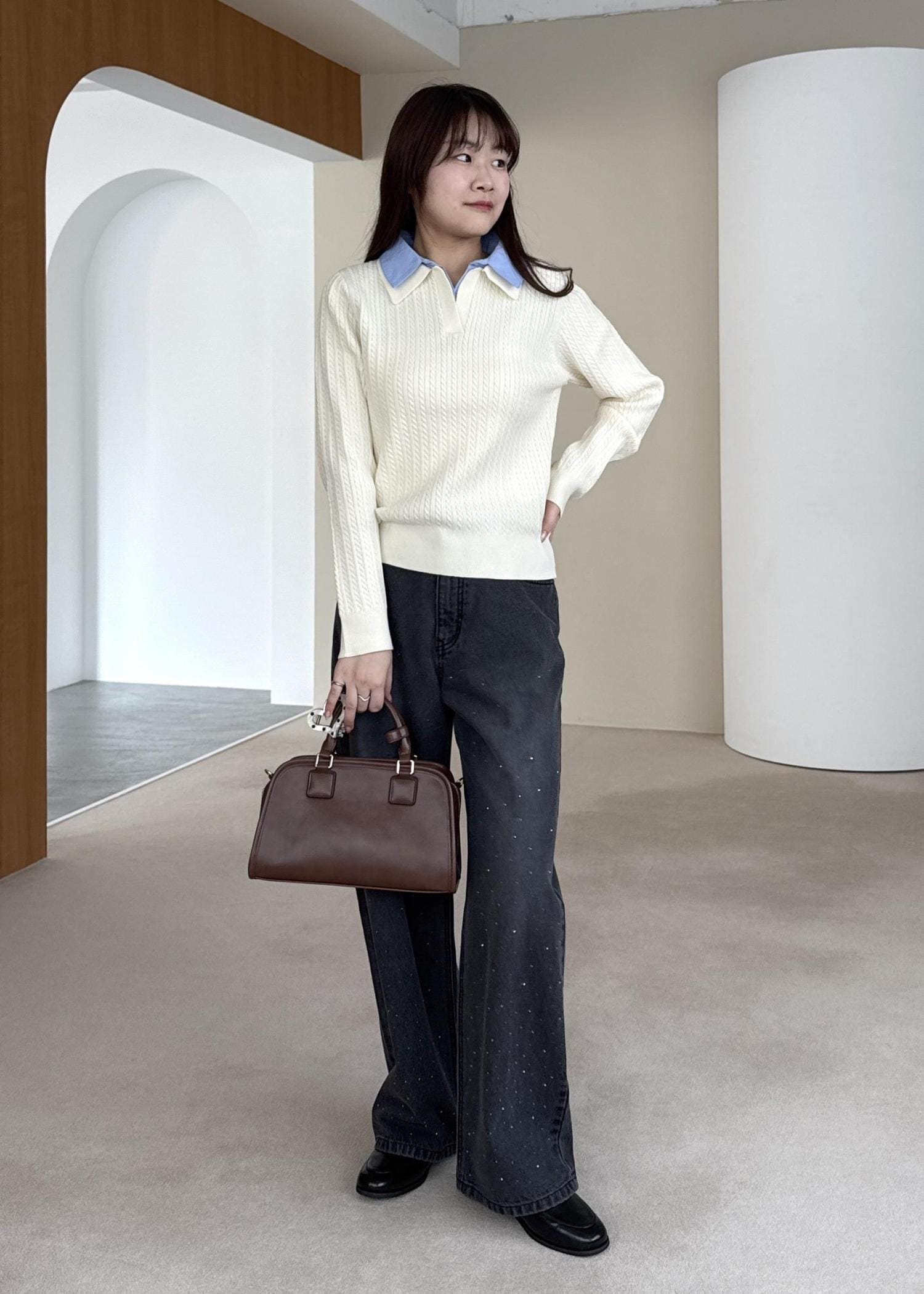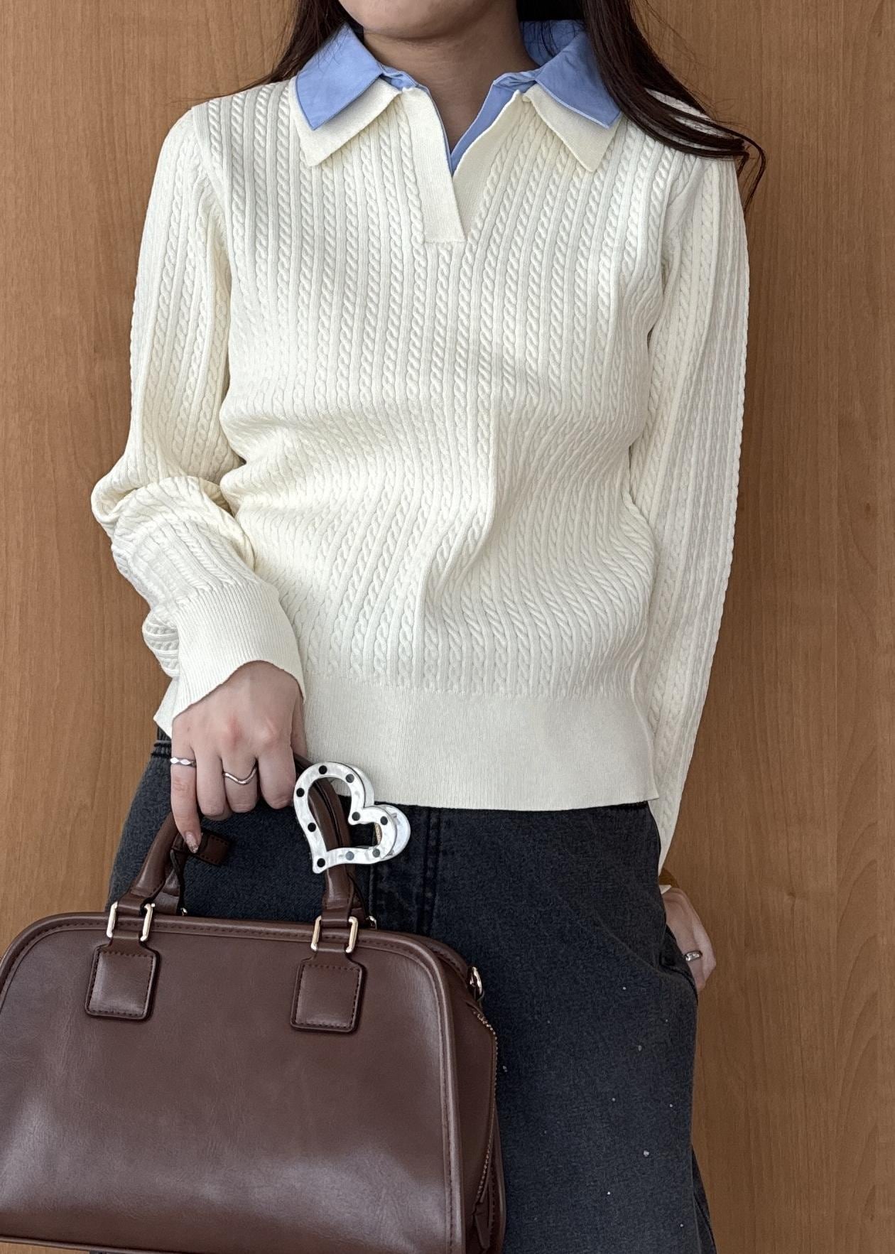 シャツをレイヤードしたように見えるニットは1枚で決まるので、簡単にトレンドのレイヤードコーデが叶います。