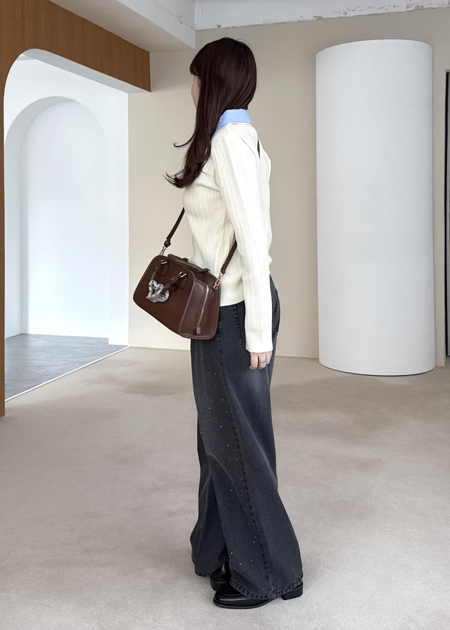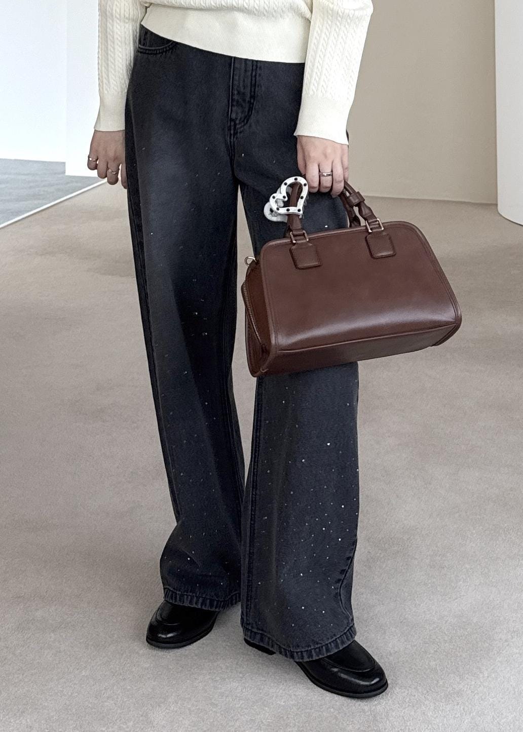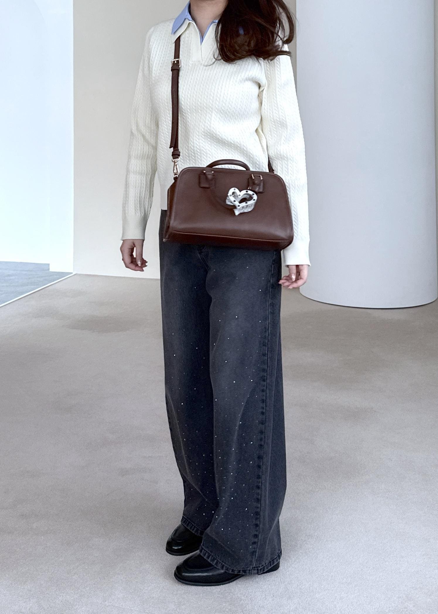 大人見えするボストンバッグに、キラキラデニムを合わせ、遊び心もプラスしました。