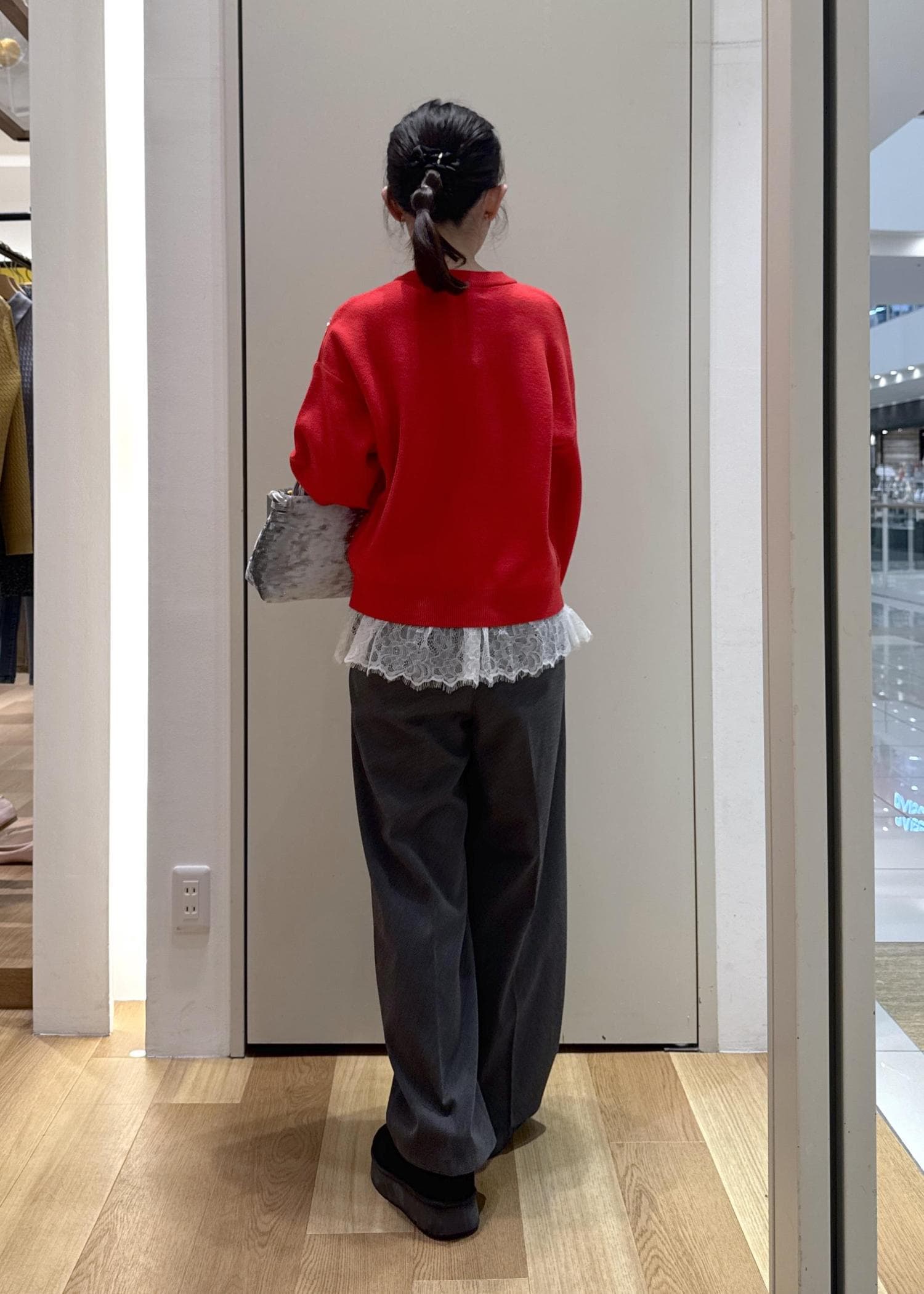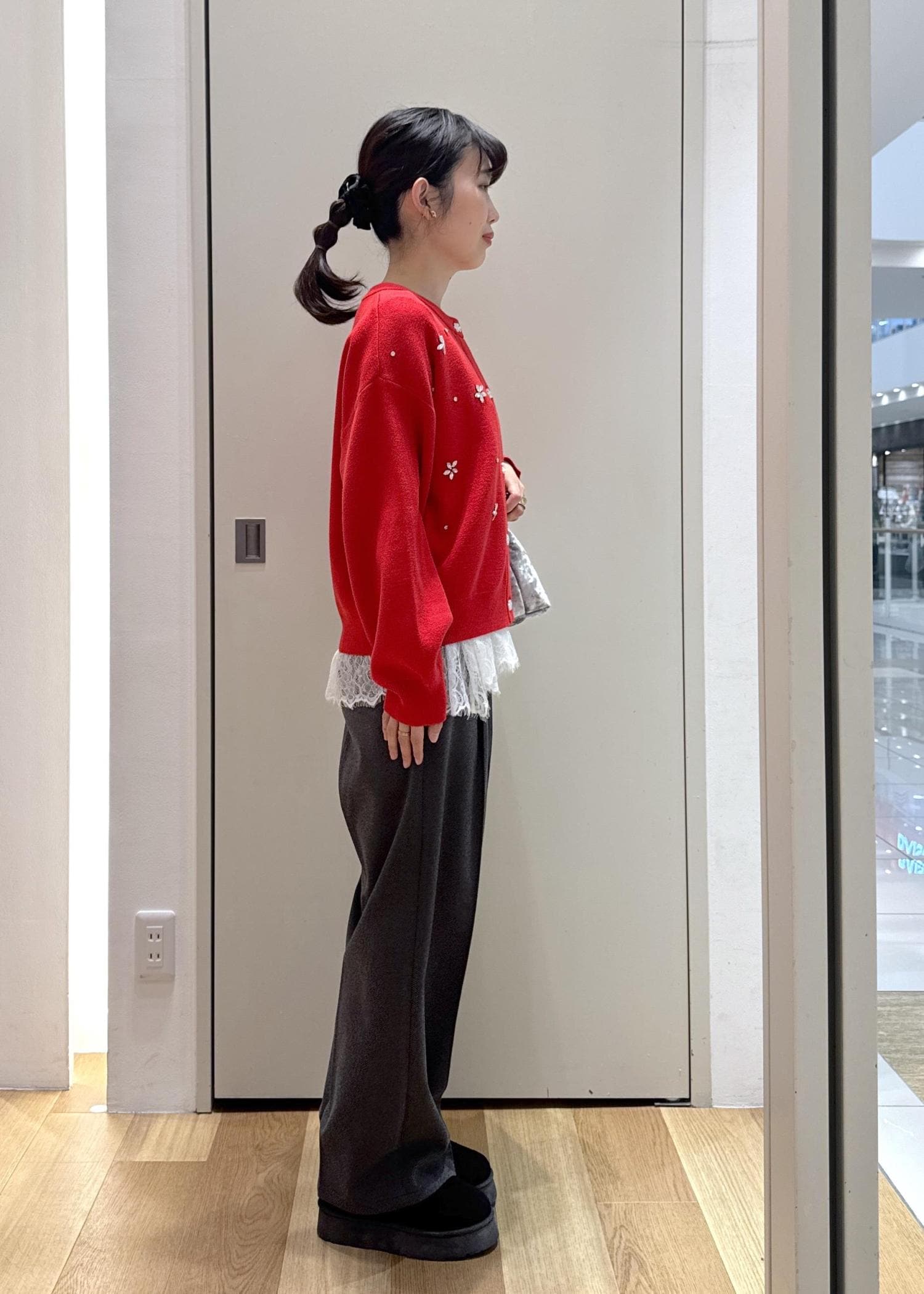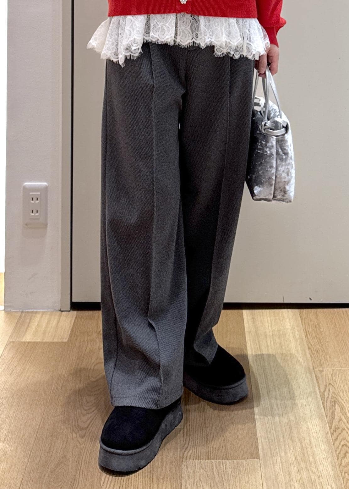 トップスが華やかなので、ボトムスはシンプルなワイドパンツにしてみました。