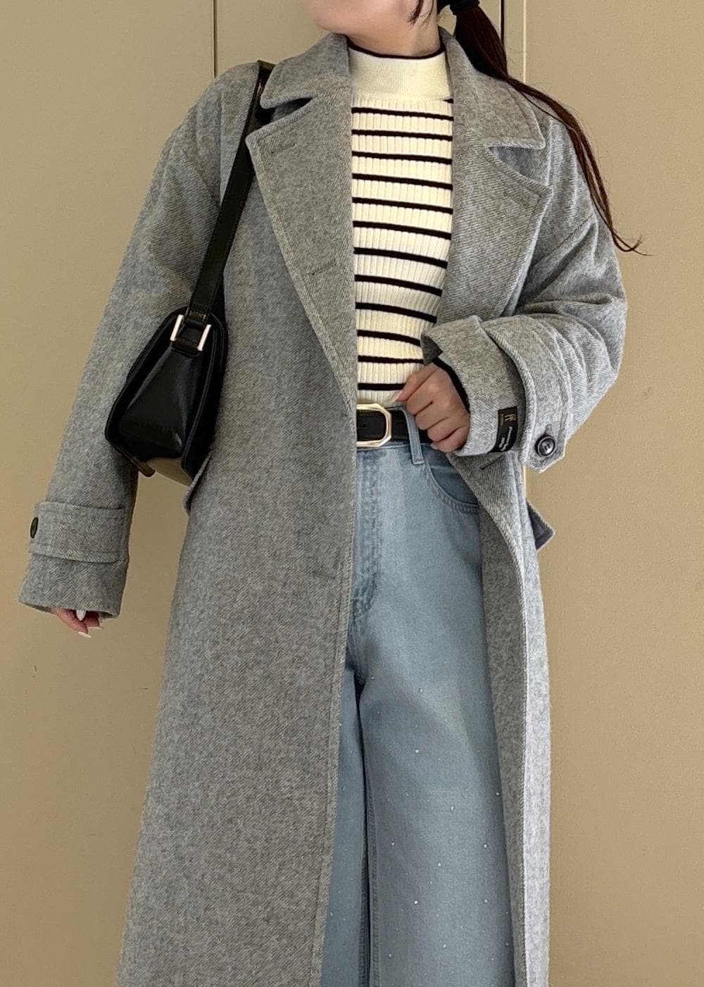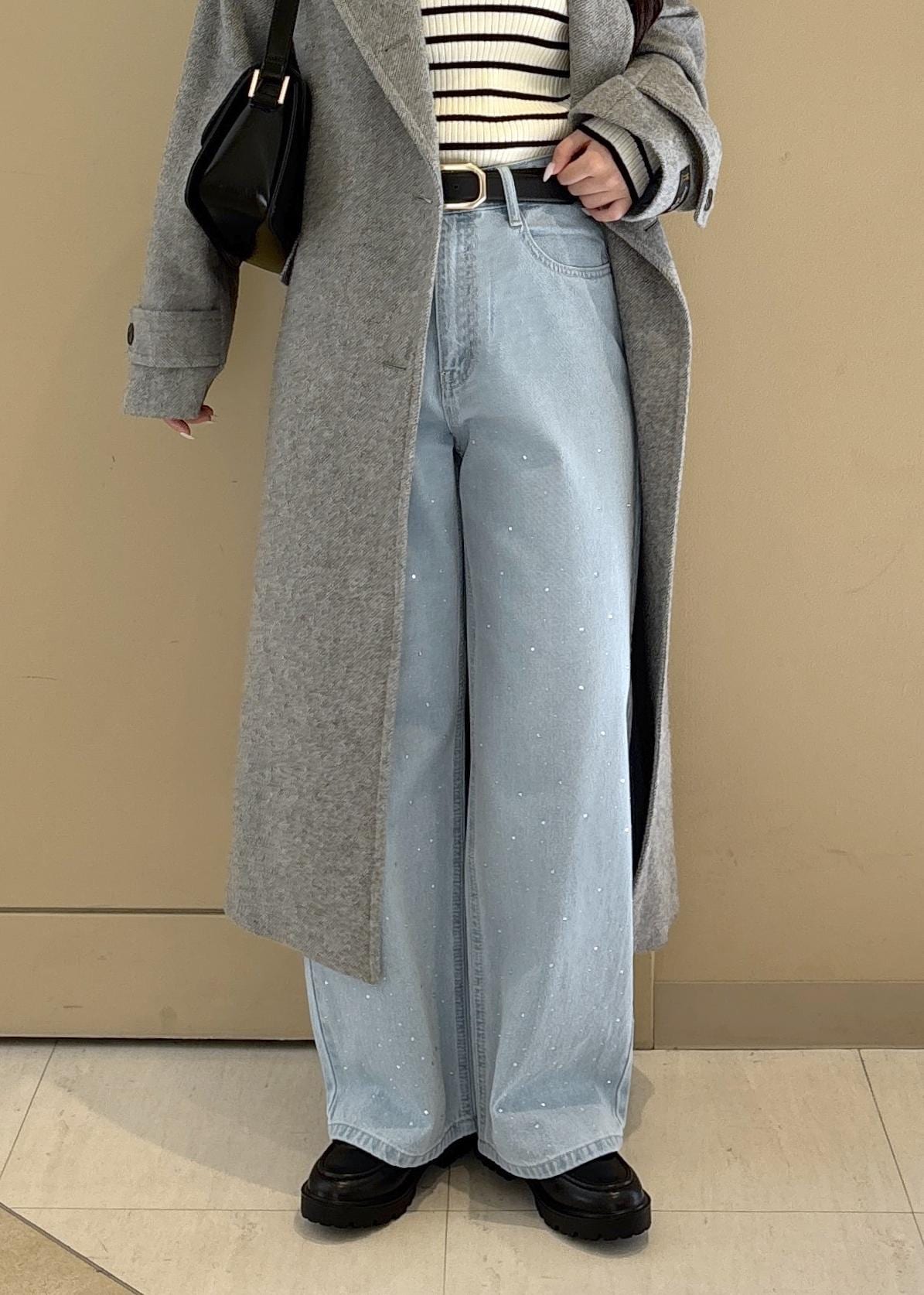 カジュアルな印象のボーダーニット×デニムパンツスタイルにロングコートを羽織り、大人女子も着やすいコーディネートに。デニムはビジューのついたデザインで、程よい華やかさがホリデーシーズンにもオススメのアイテムです。