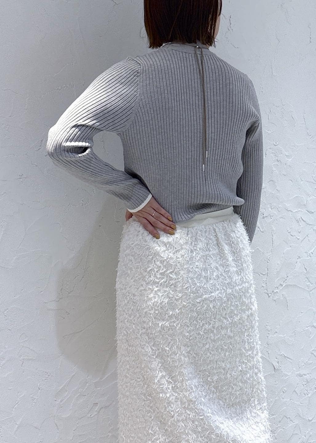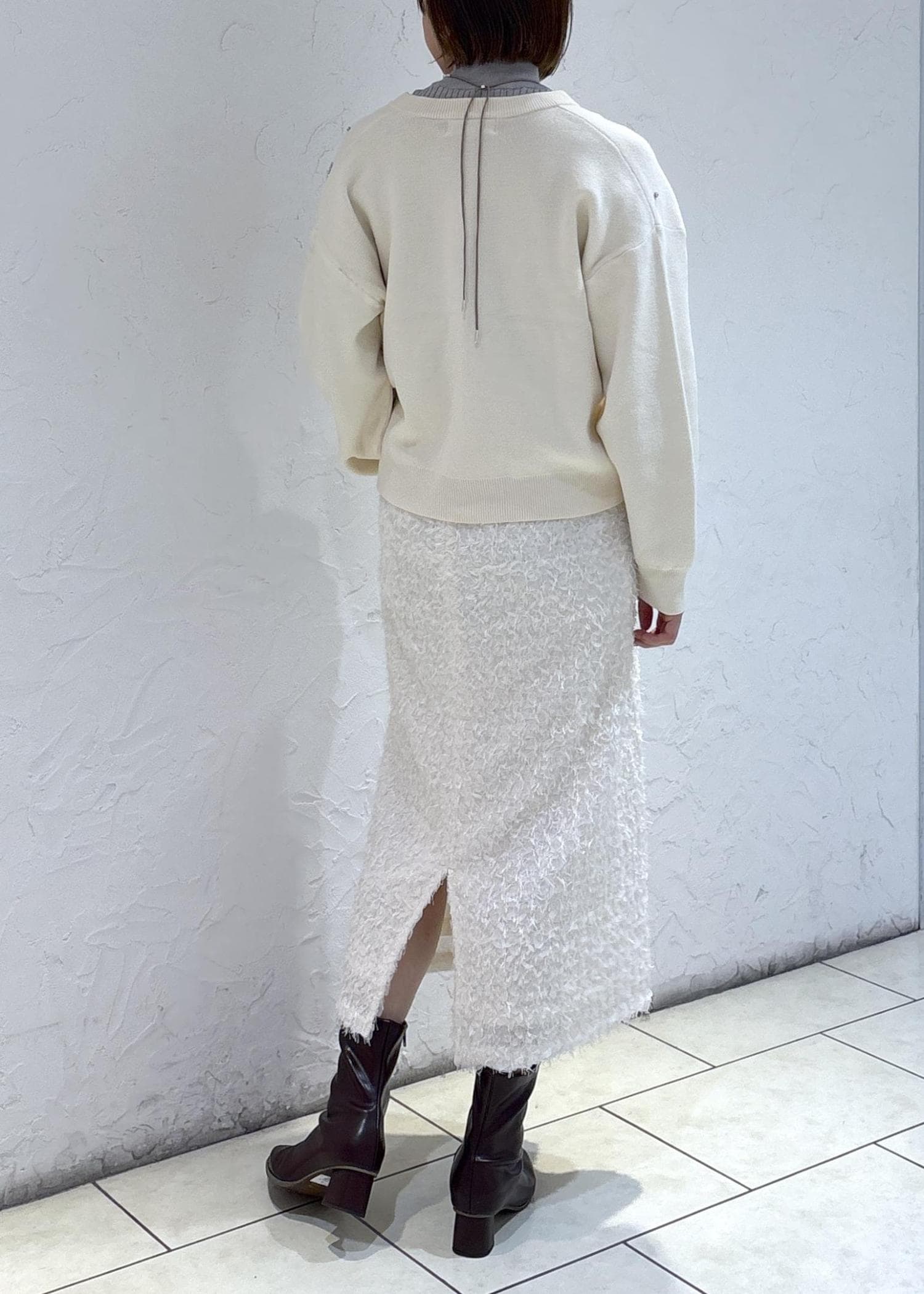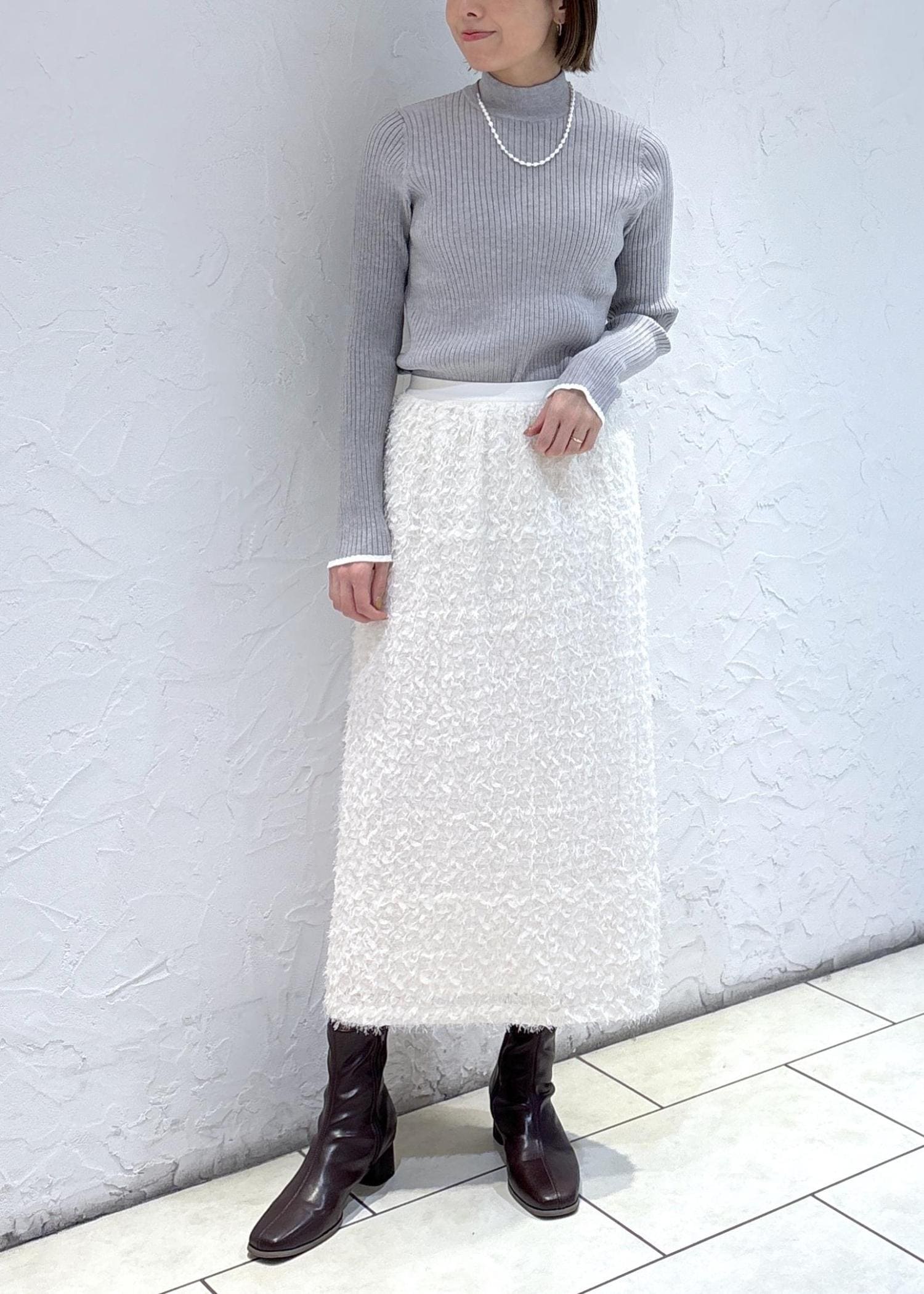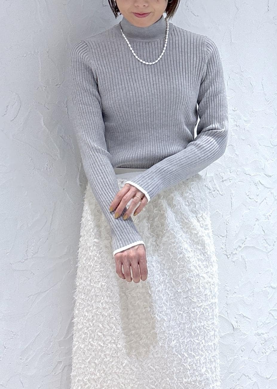 首まわりは鎖骨が隠れるほどなのでタートルネックが苦手な方でも着用しやすいニットです。 -