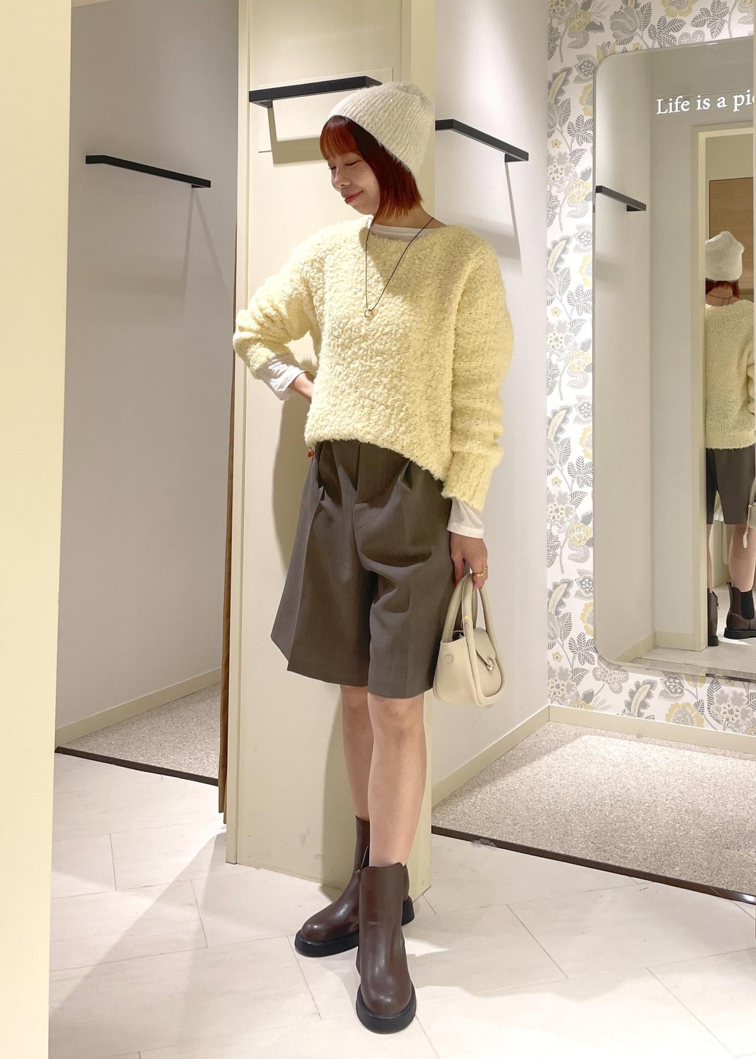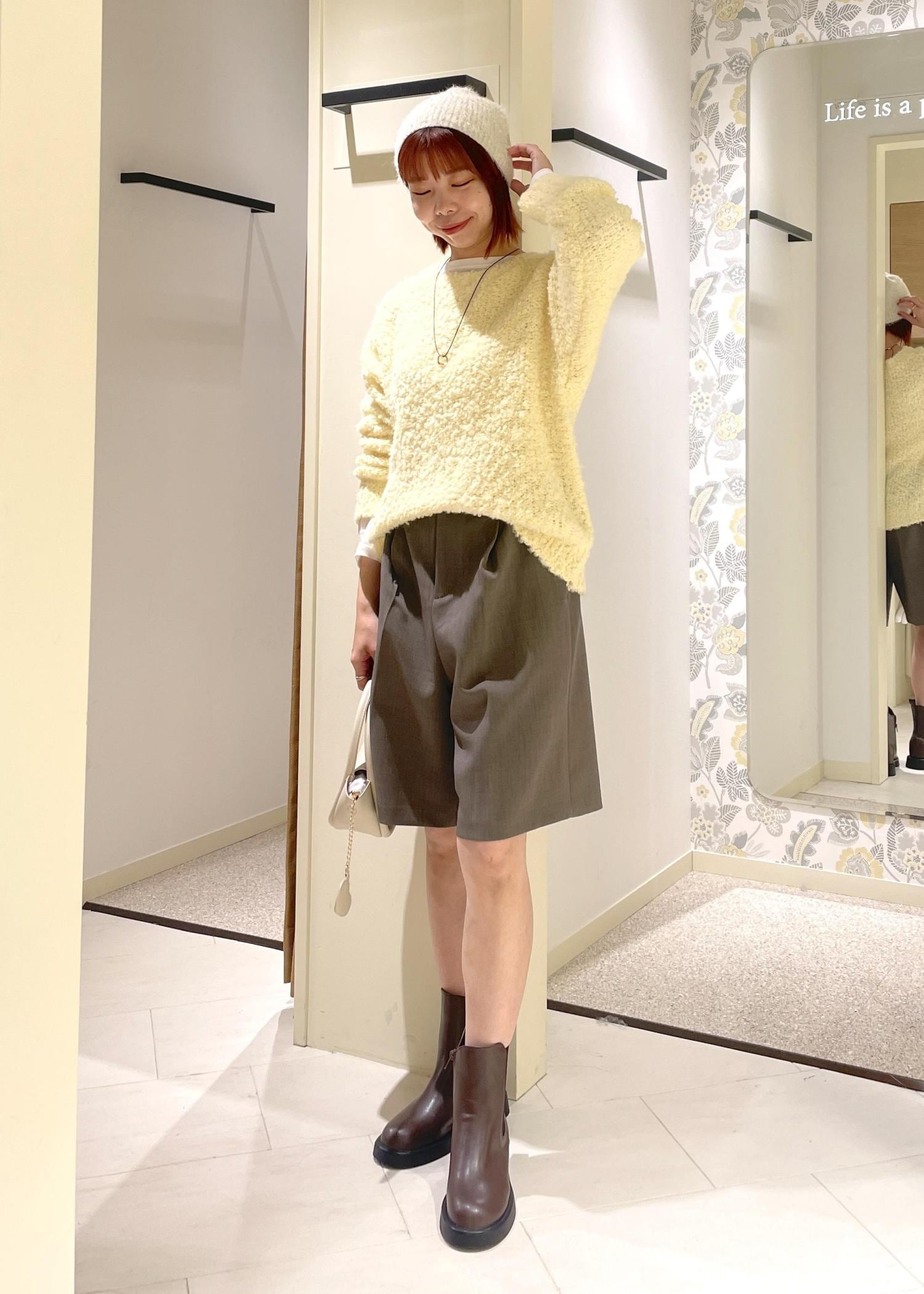 ふわふわとした生地感が可愛らしいイエローのニットに、ハーフパンツを合わせたカジュアルコーデ。