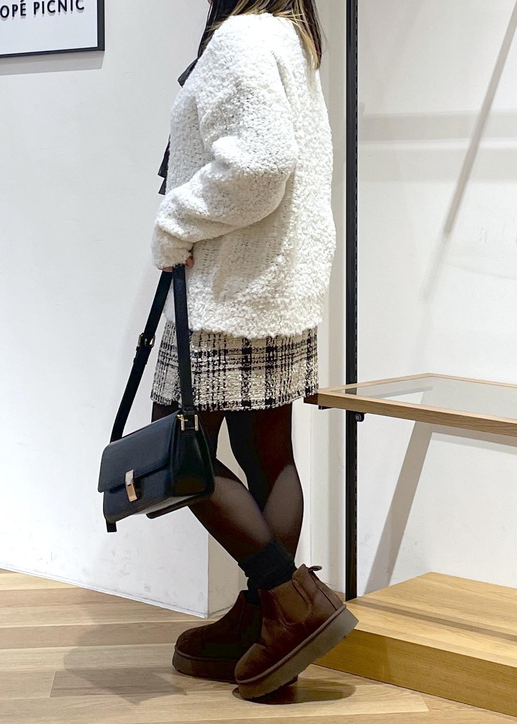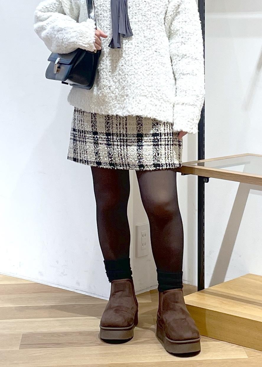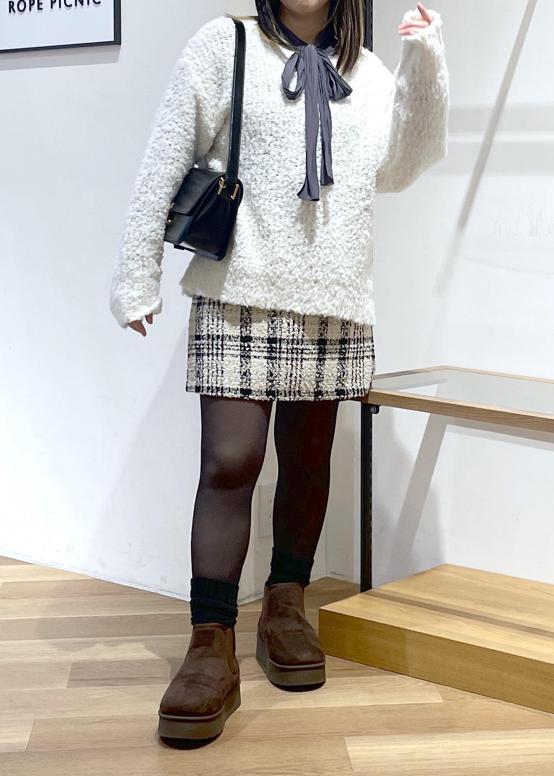 ROPÉ PICNICファンシーツイードチェックミニスカートキナリ / S¥5,995レビューツイード素材で着用するだけでちゃんと感が出ます。ミニ丈ですが、裏地がインパンツになってますので安心です○ブーツ合わせが可愛いです。