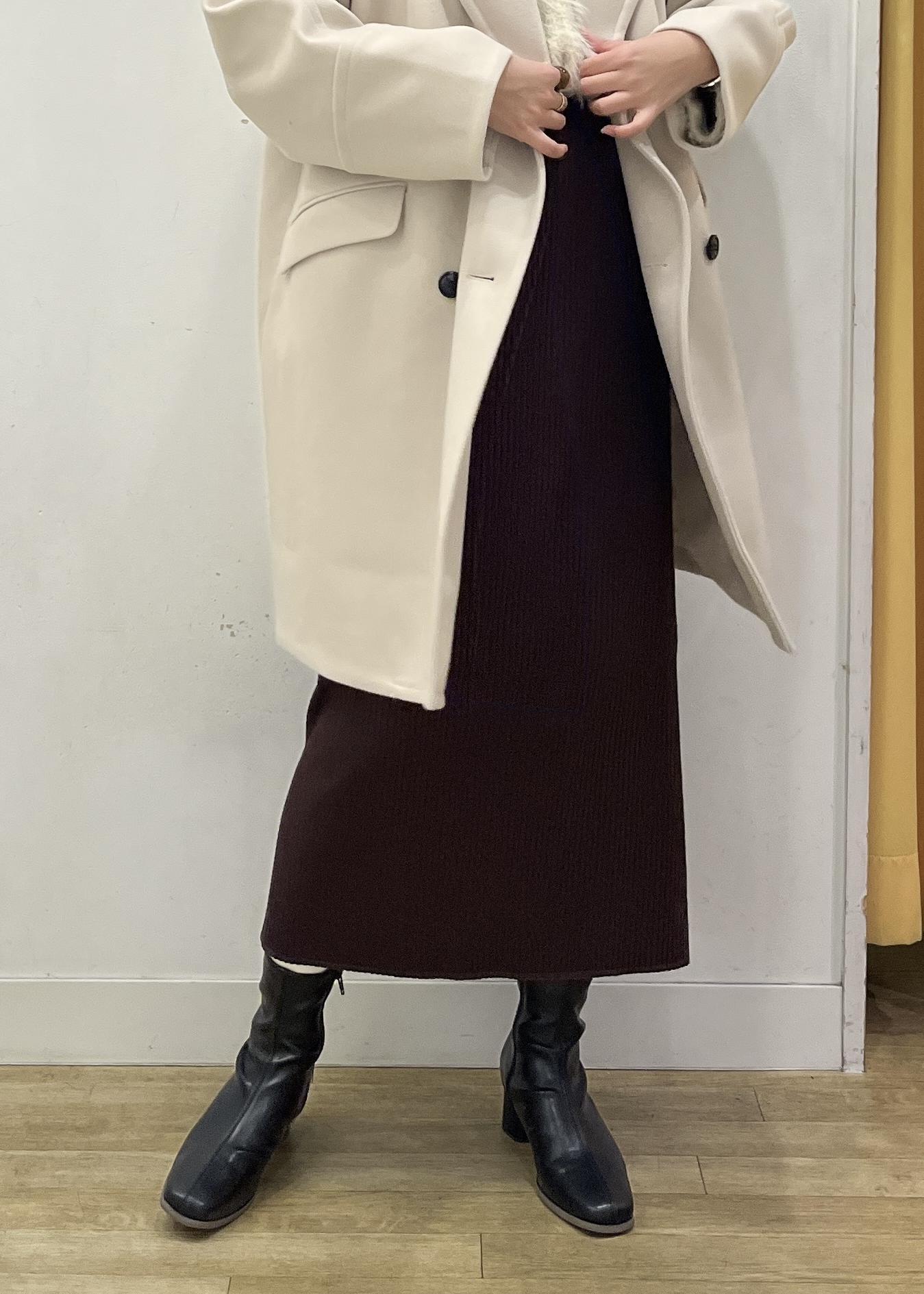 冬の忘年会などにオススメのコーデ✨インナーはフェザーニットにアイラインスカートを合わせて女性らしい印象に♪