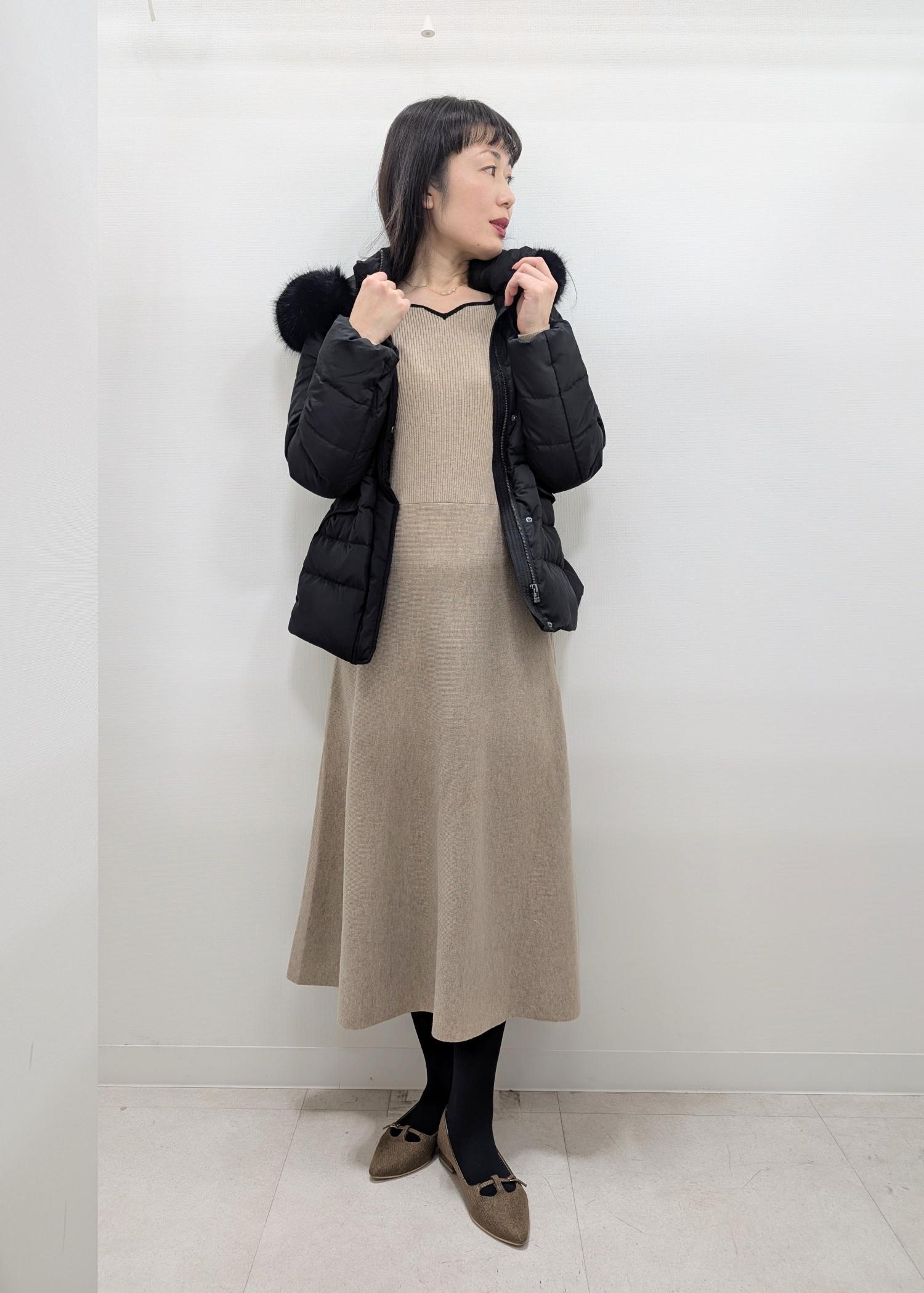 女性らしいワンピースにしっかり暖かいダウンを合わせました。