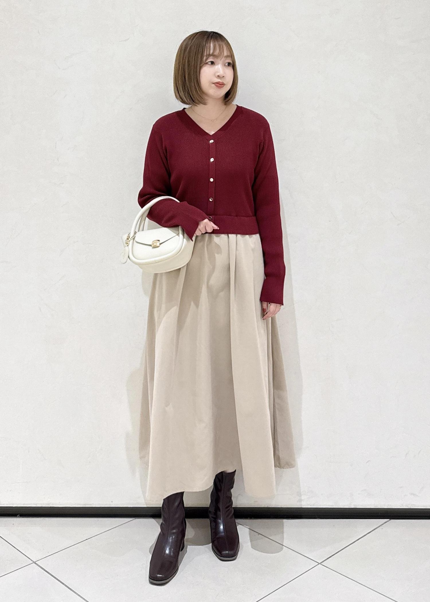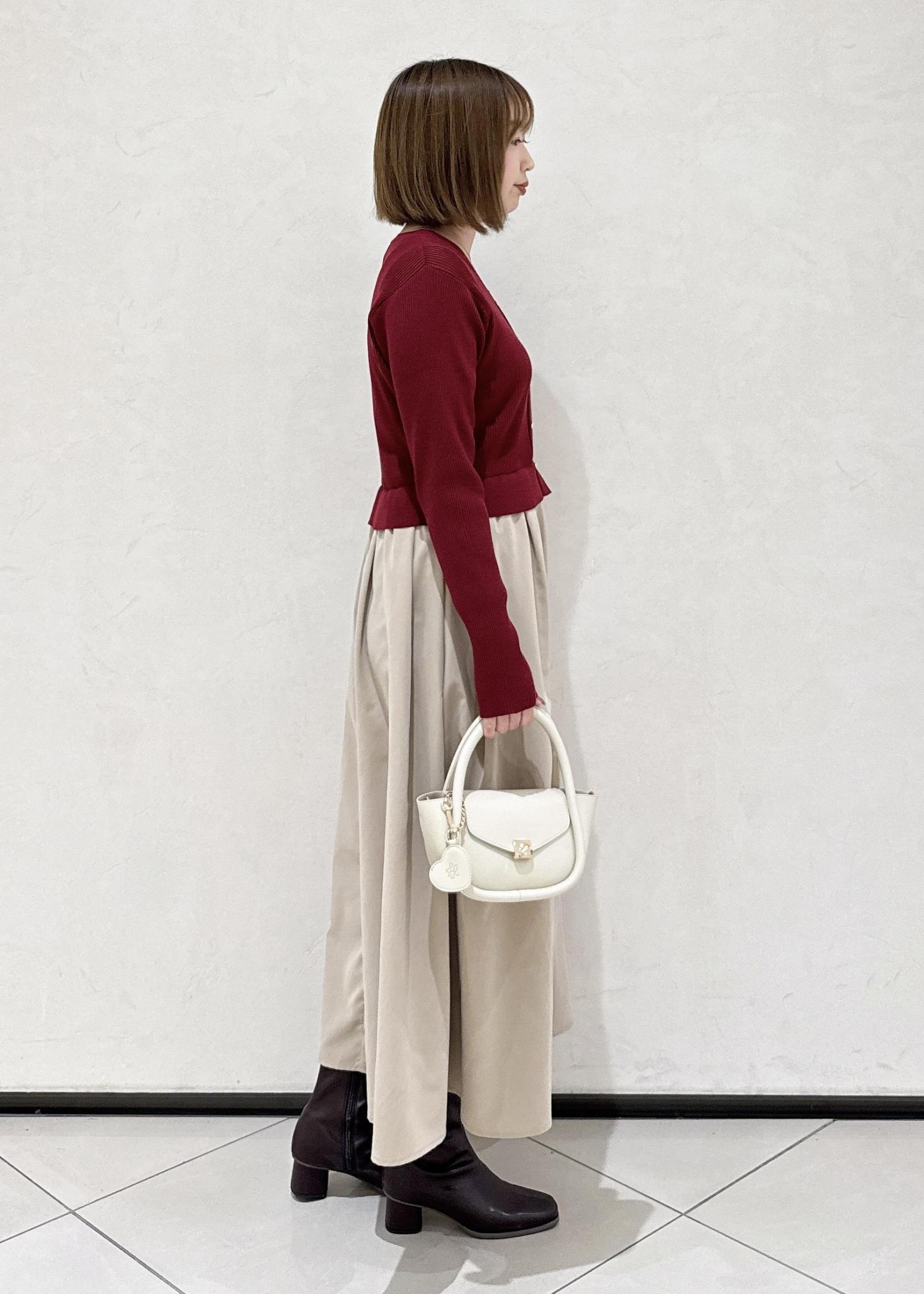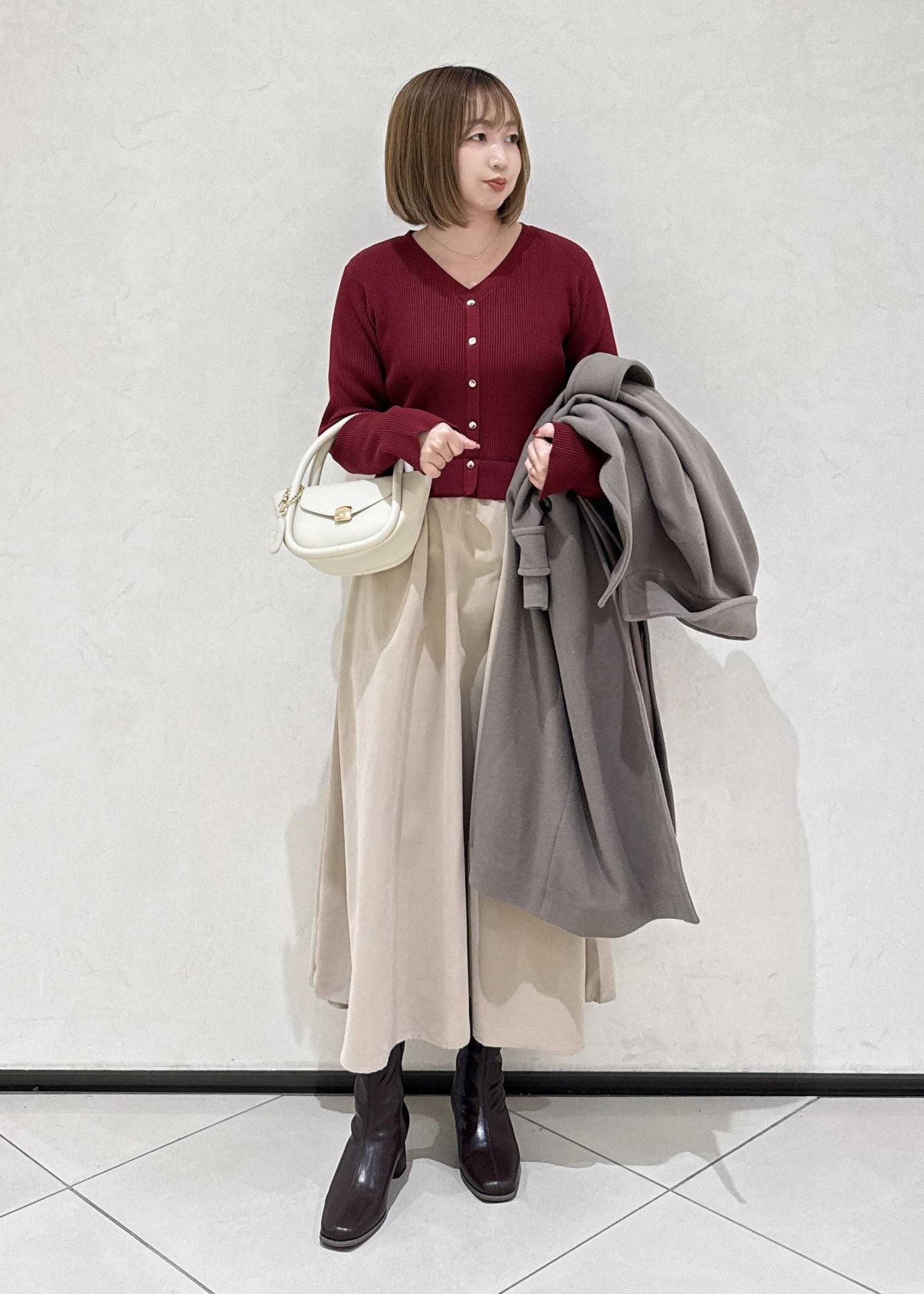 パッと目を引く赤のトップスはお出かけにはおすすめワンピースです。コートもワンピースも女性らしいシルエットです。