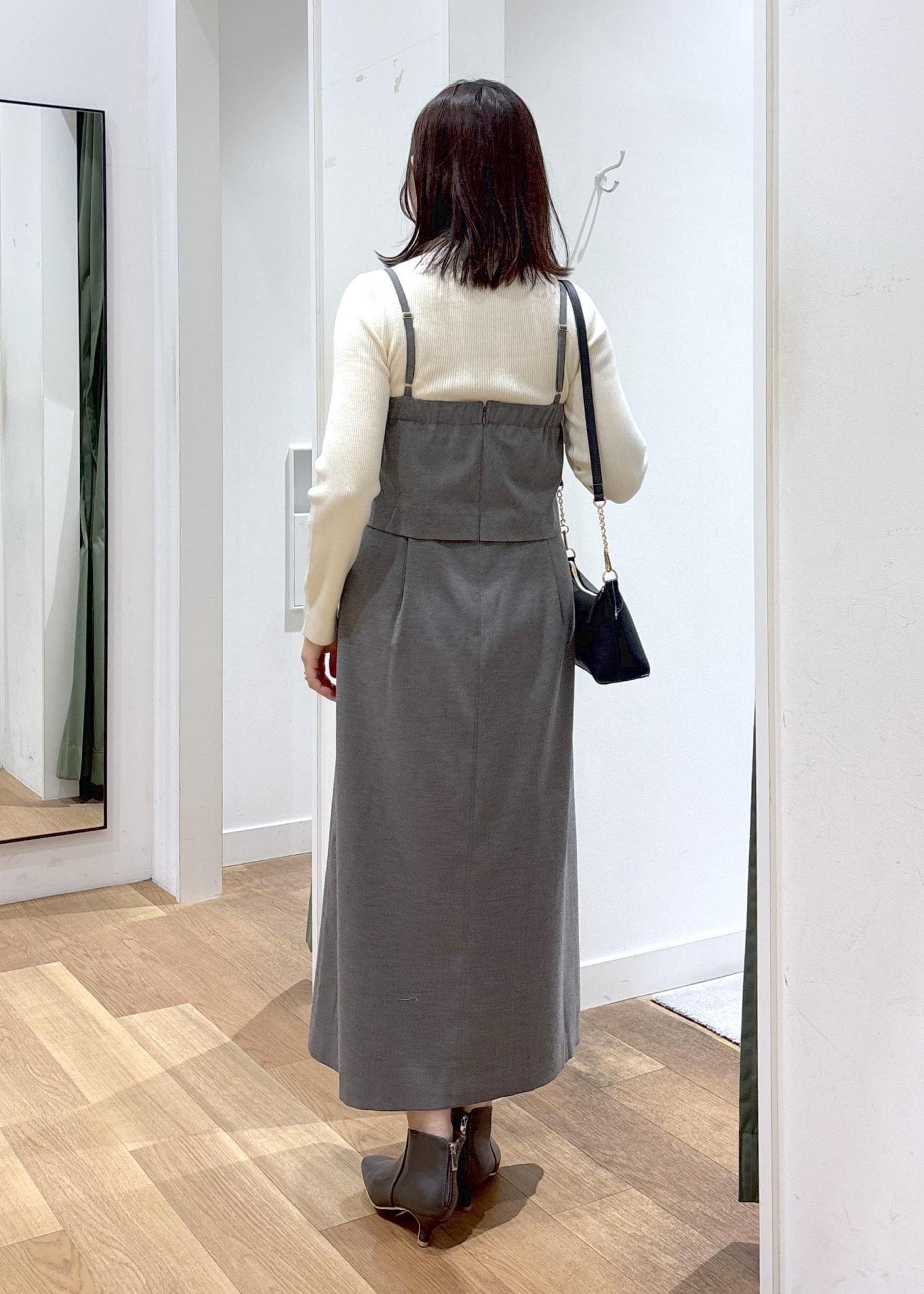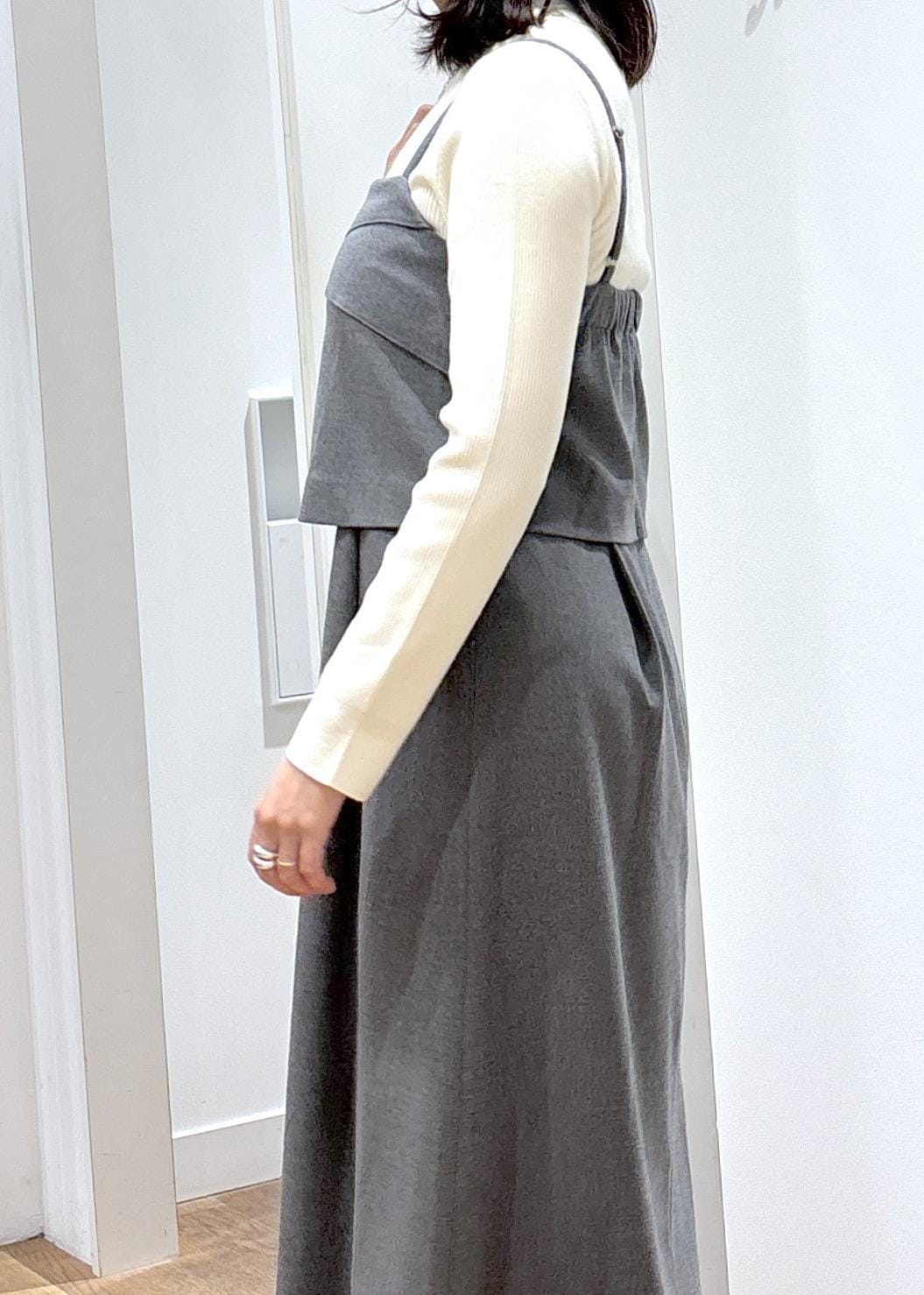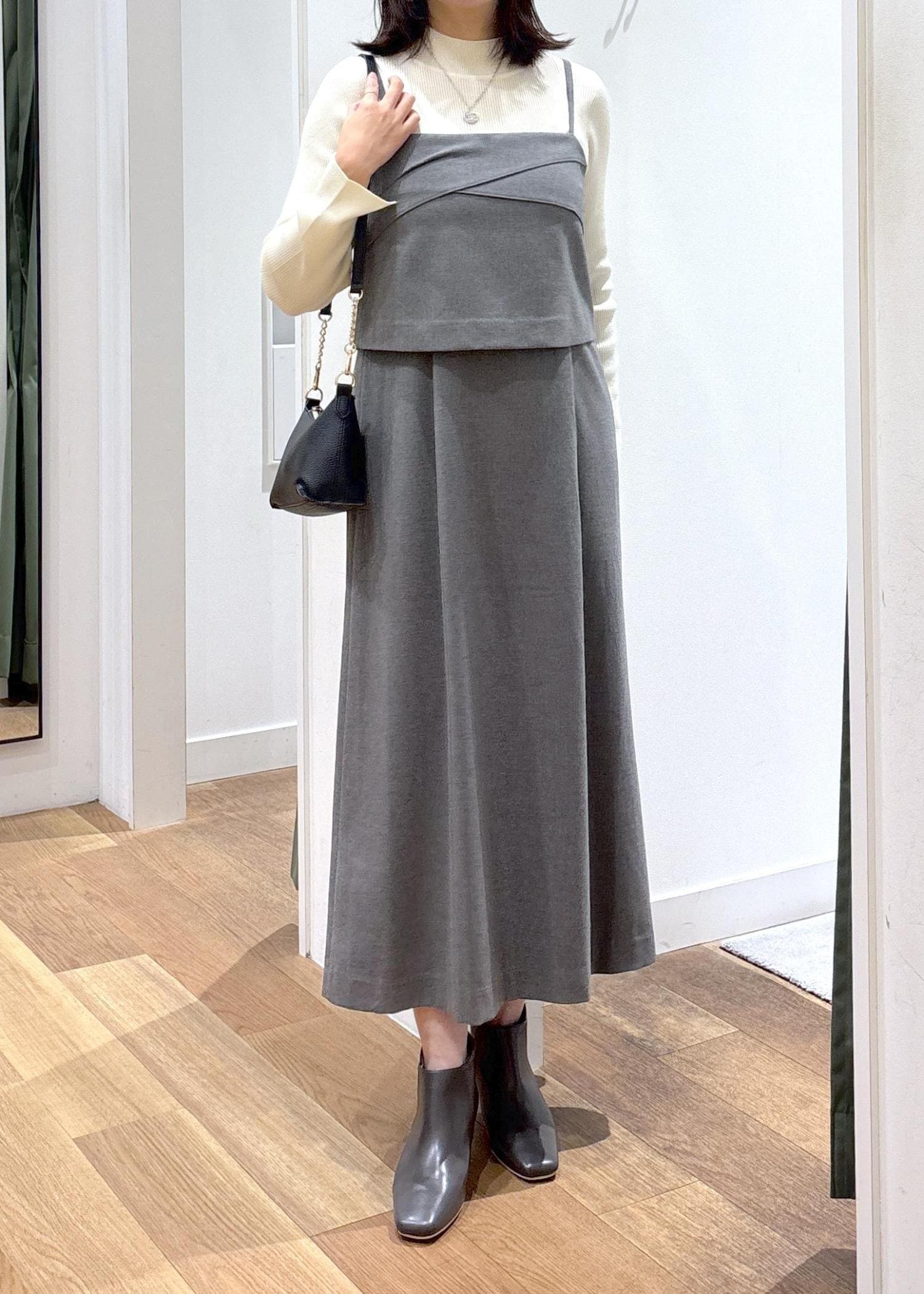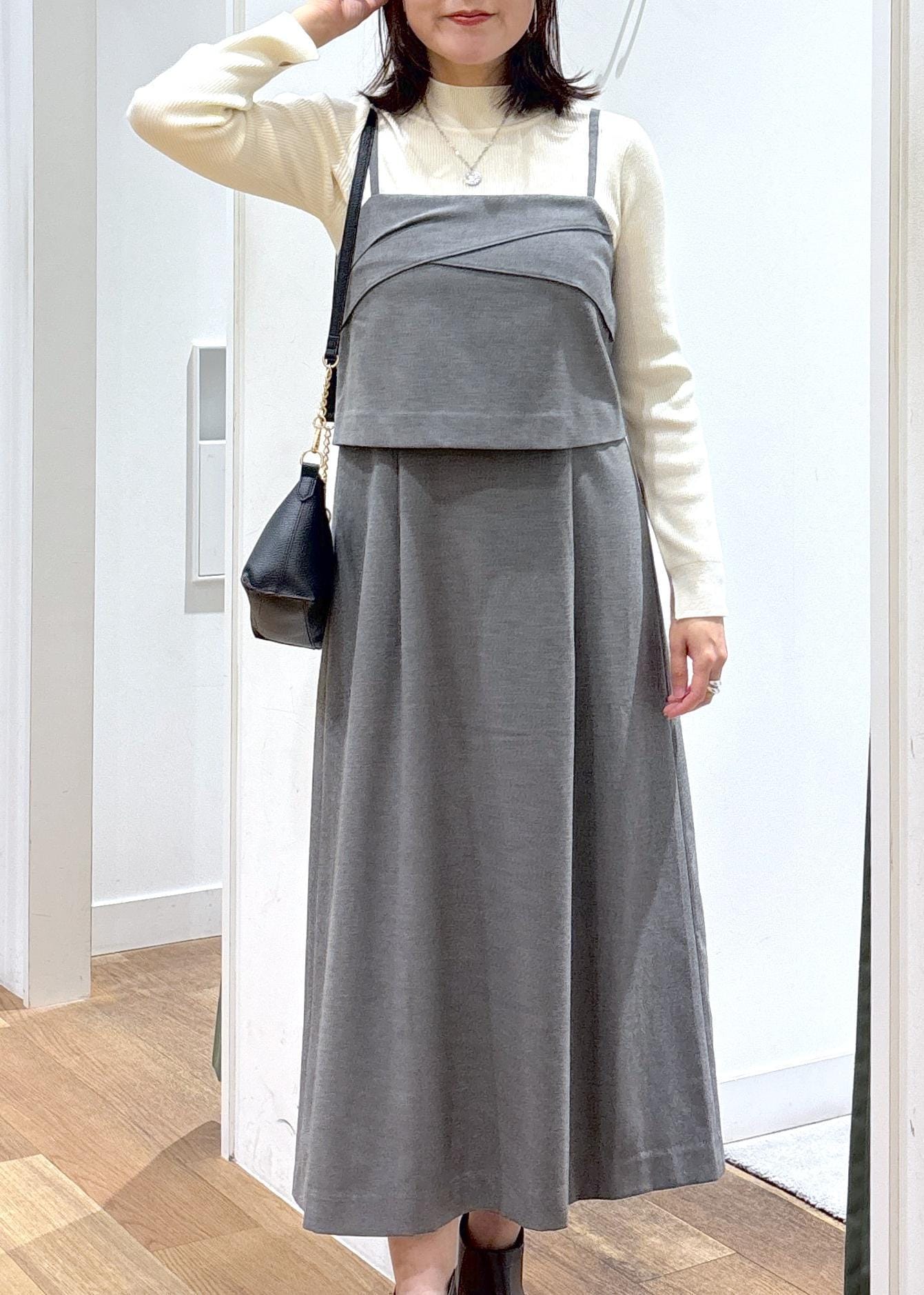 キャミソール+スカートのように見えるワンピースで、切り替え位置が高めなので腰位置も高く見せてくれます。