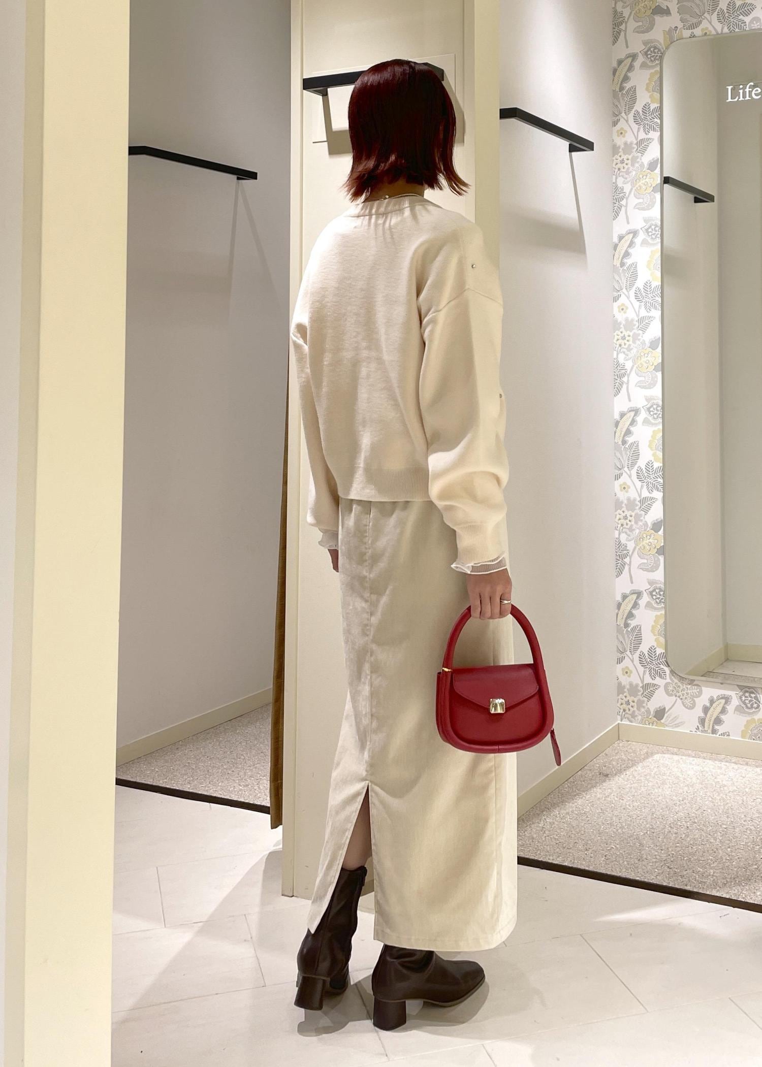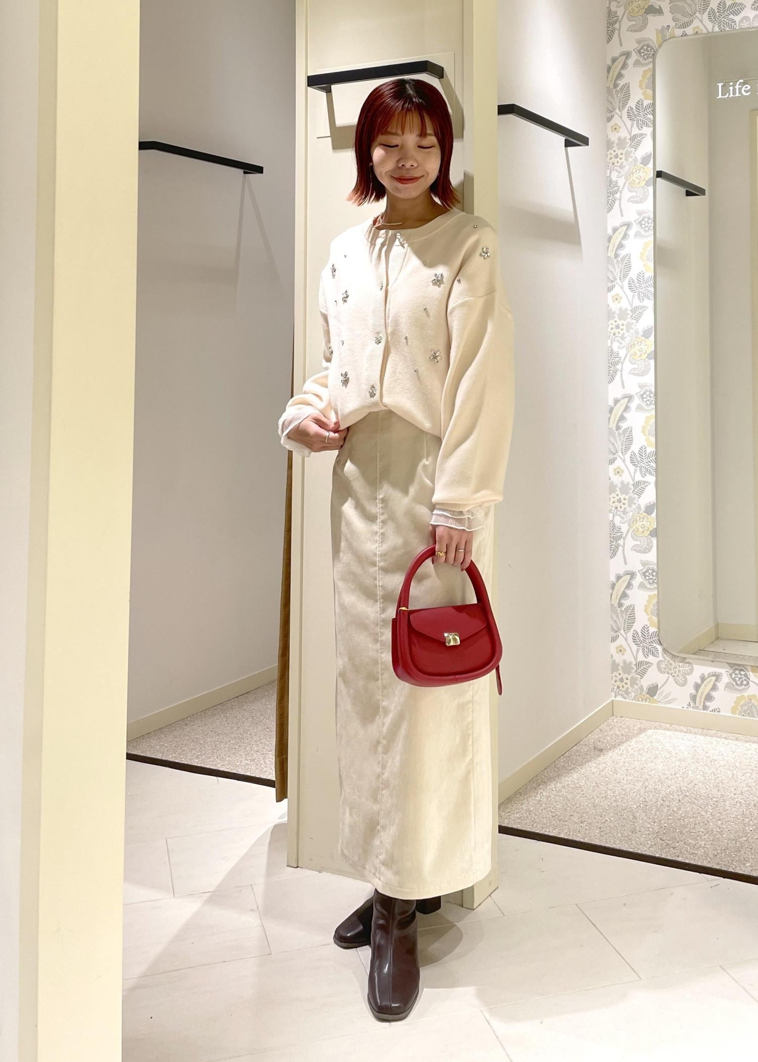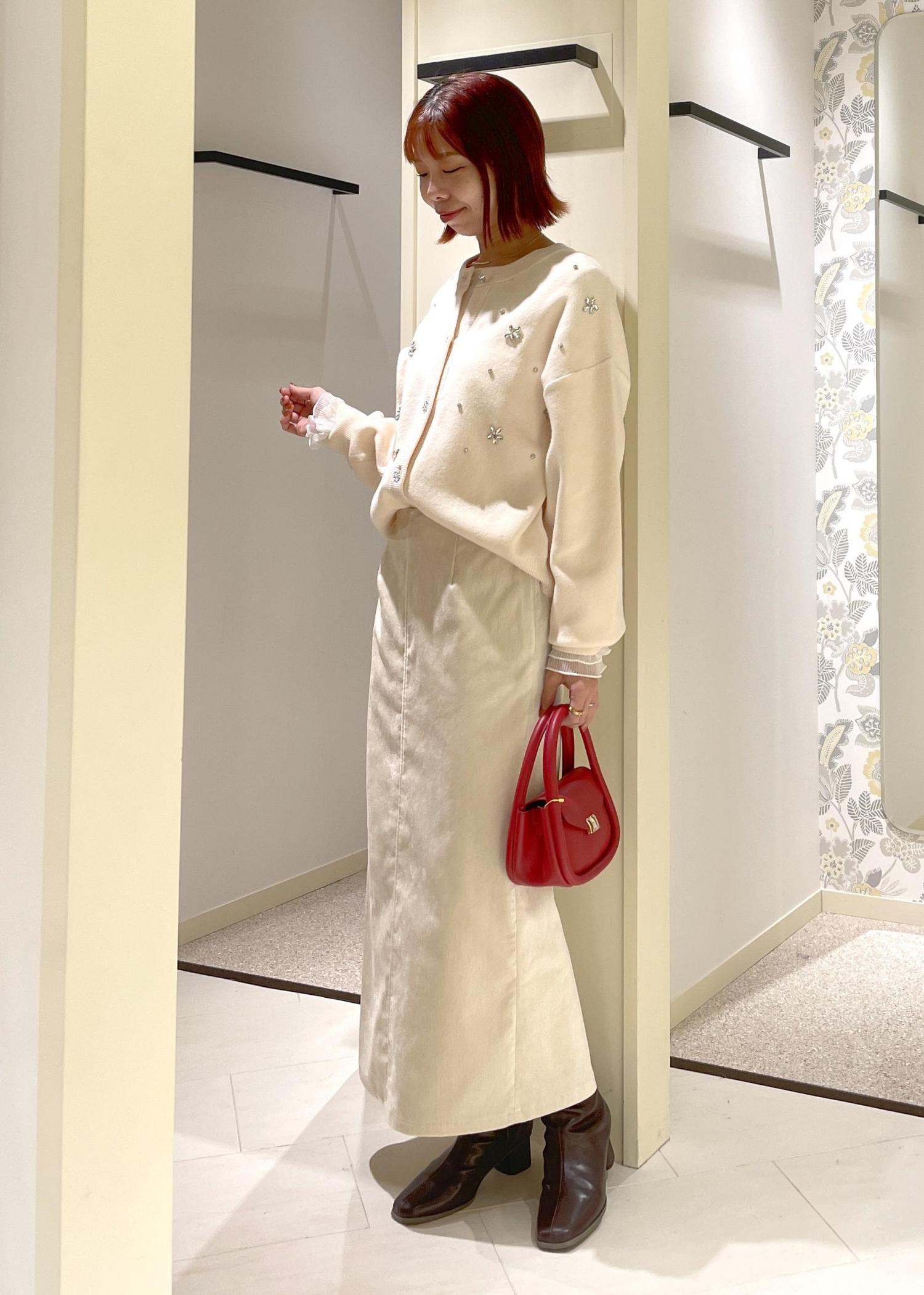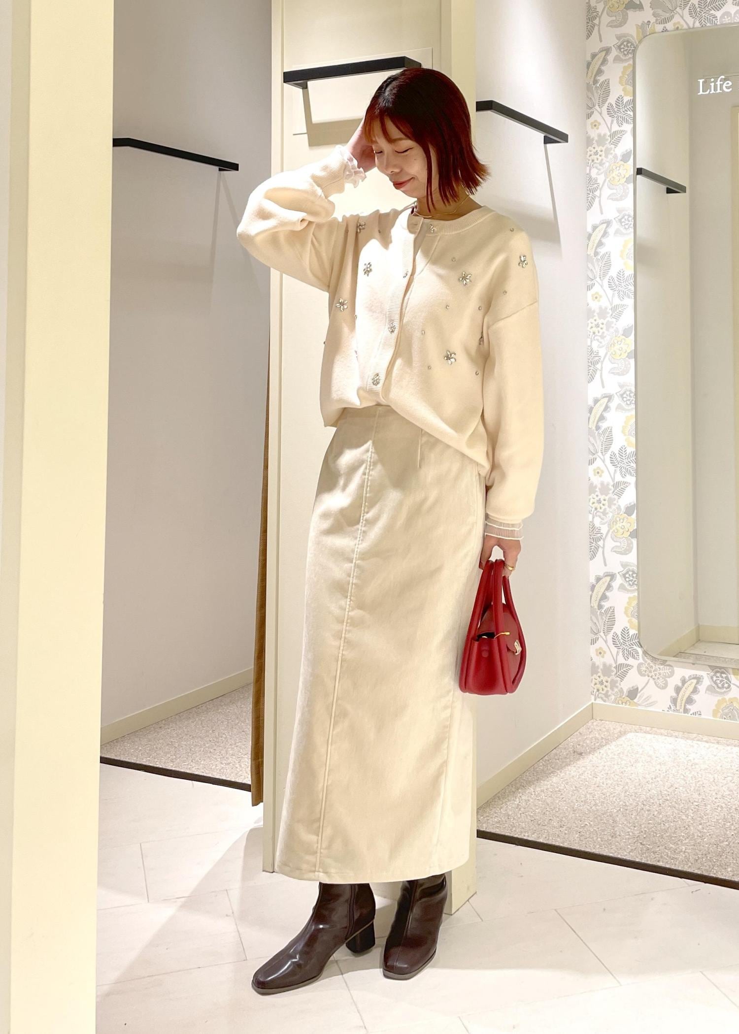 ホワイトのIラインスカートを合わせて冬のワントーンコーデにまとめてみました◎