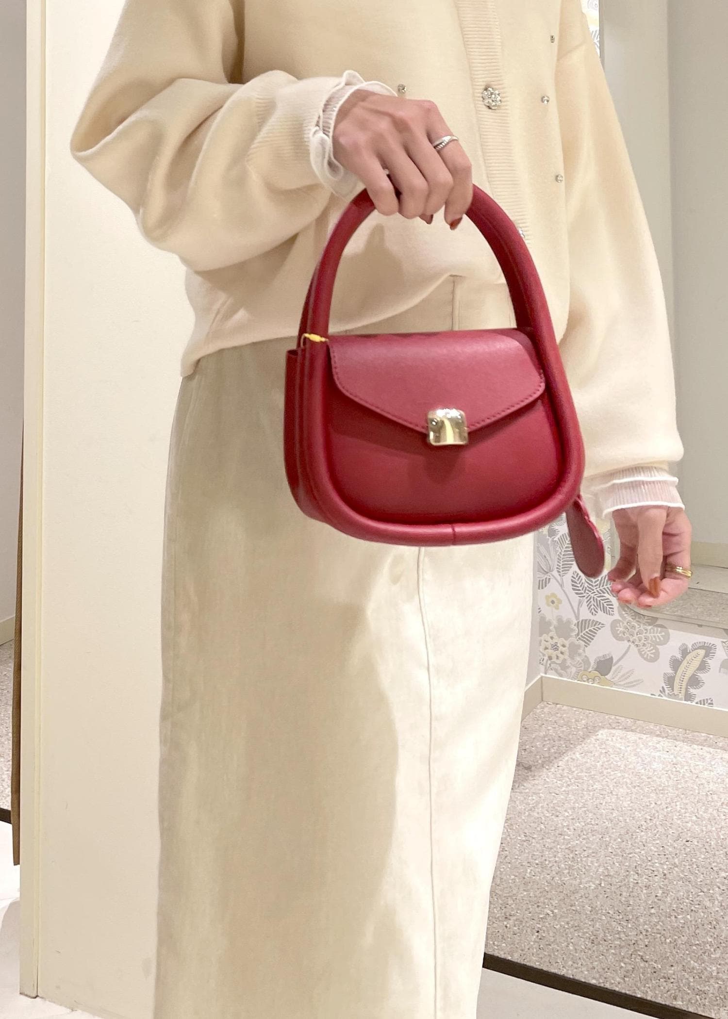 間口が広いので物の出し入れもしやすく、ショルダーベルトも付いている為、デイリーにもパーティーバッグとしてもお使い頂けそうです。 -