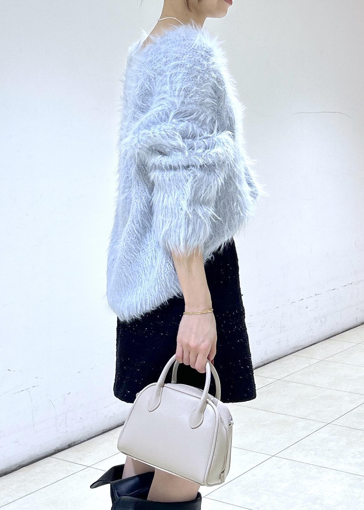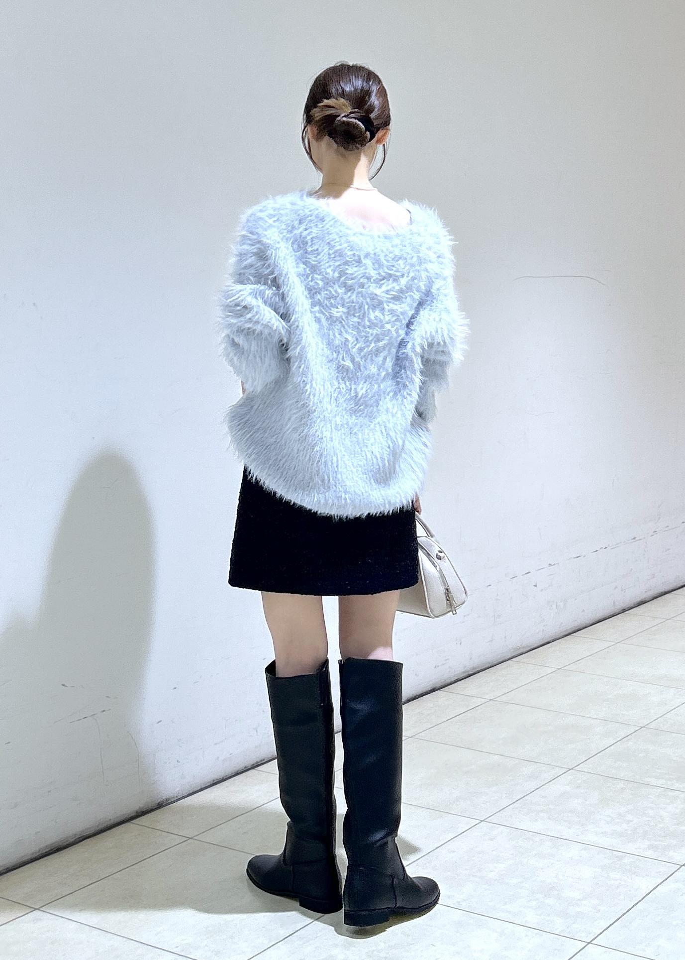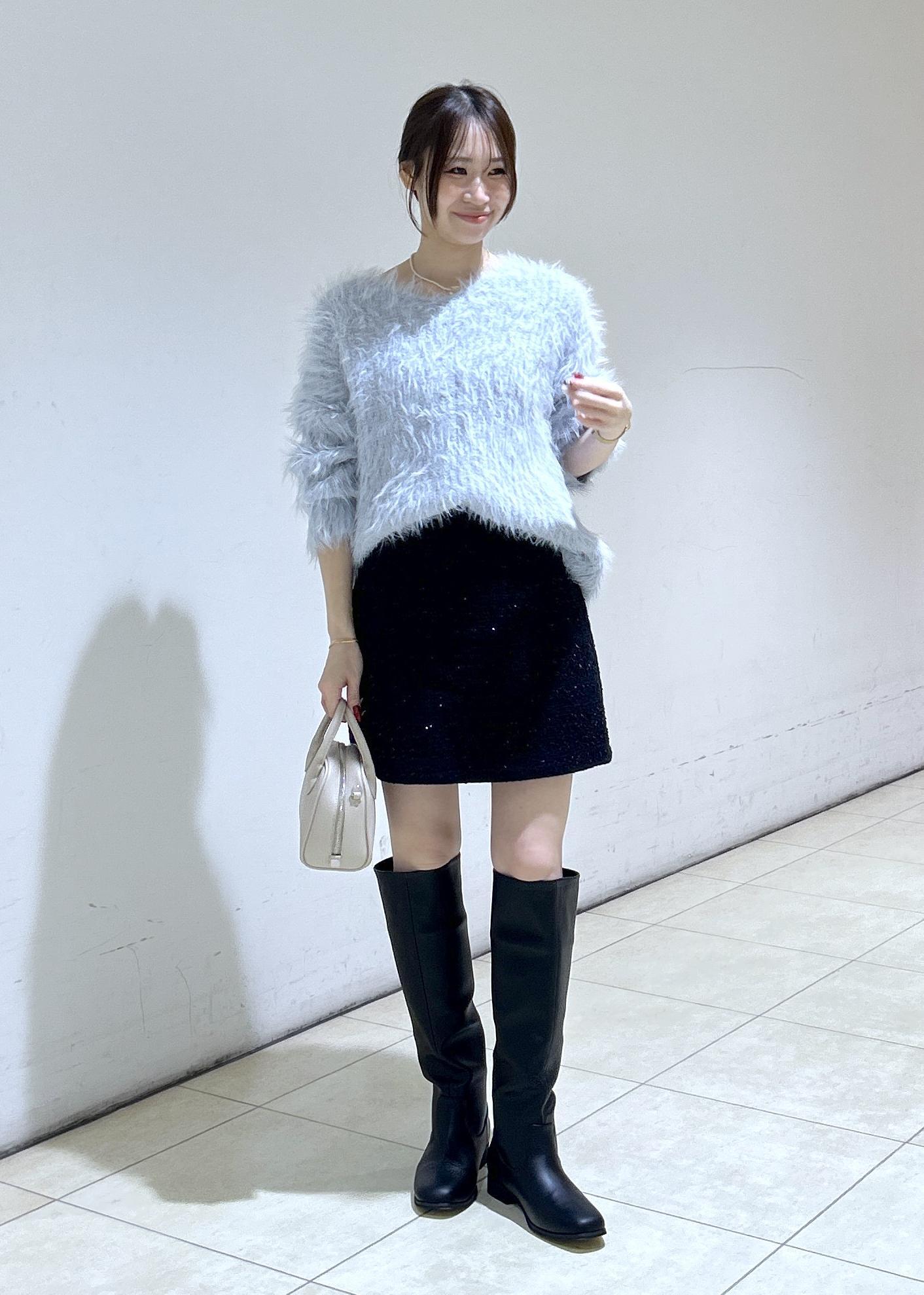 シャギーニット×短めのスカートでロングブーツを合わせ、キレイメカジュアルなスタイリングにしました。