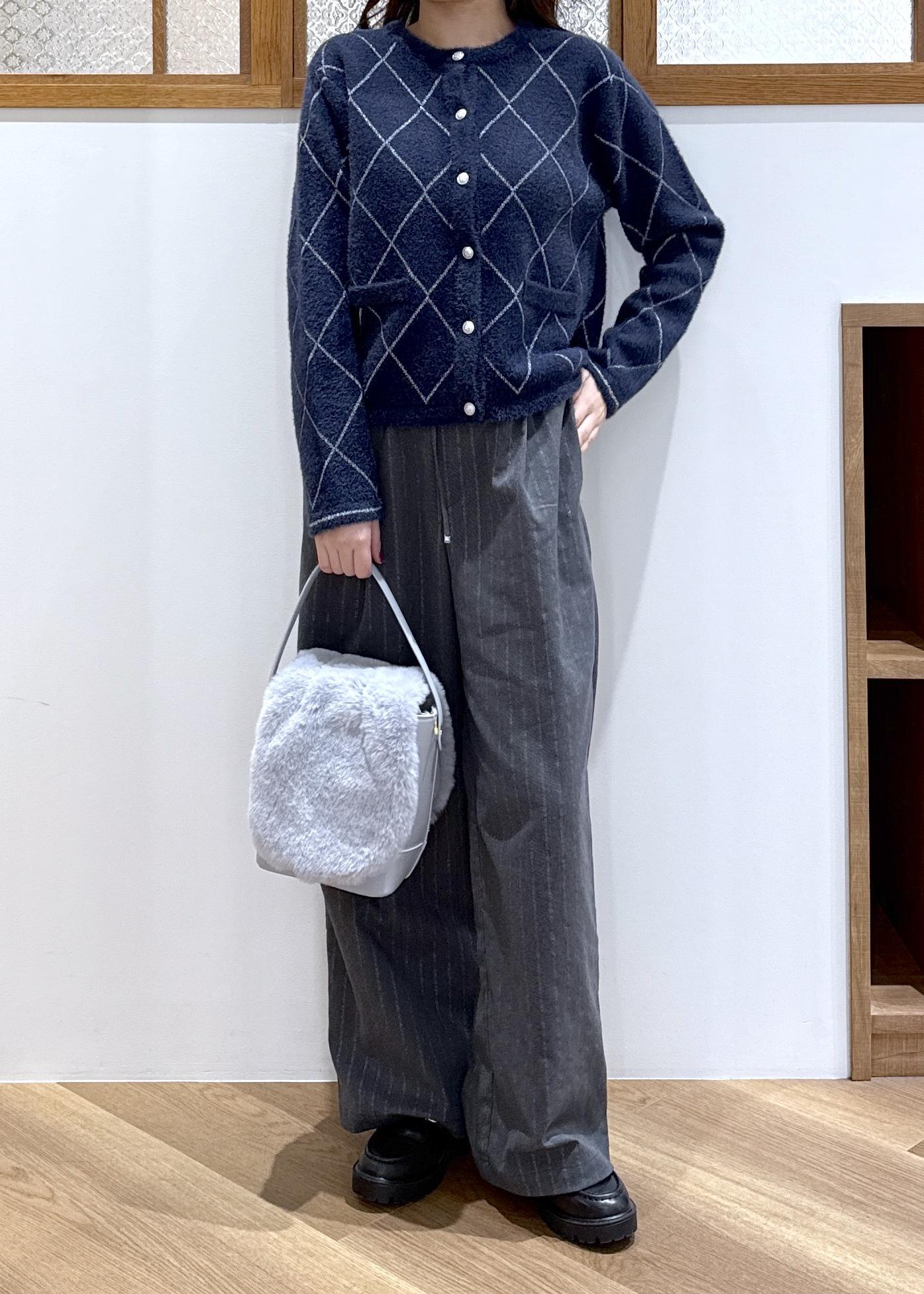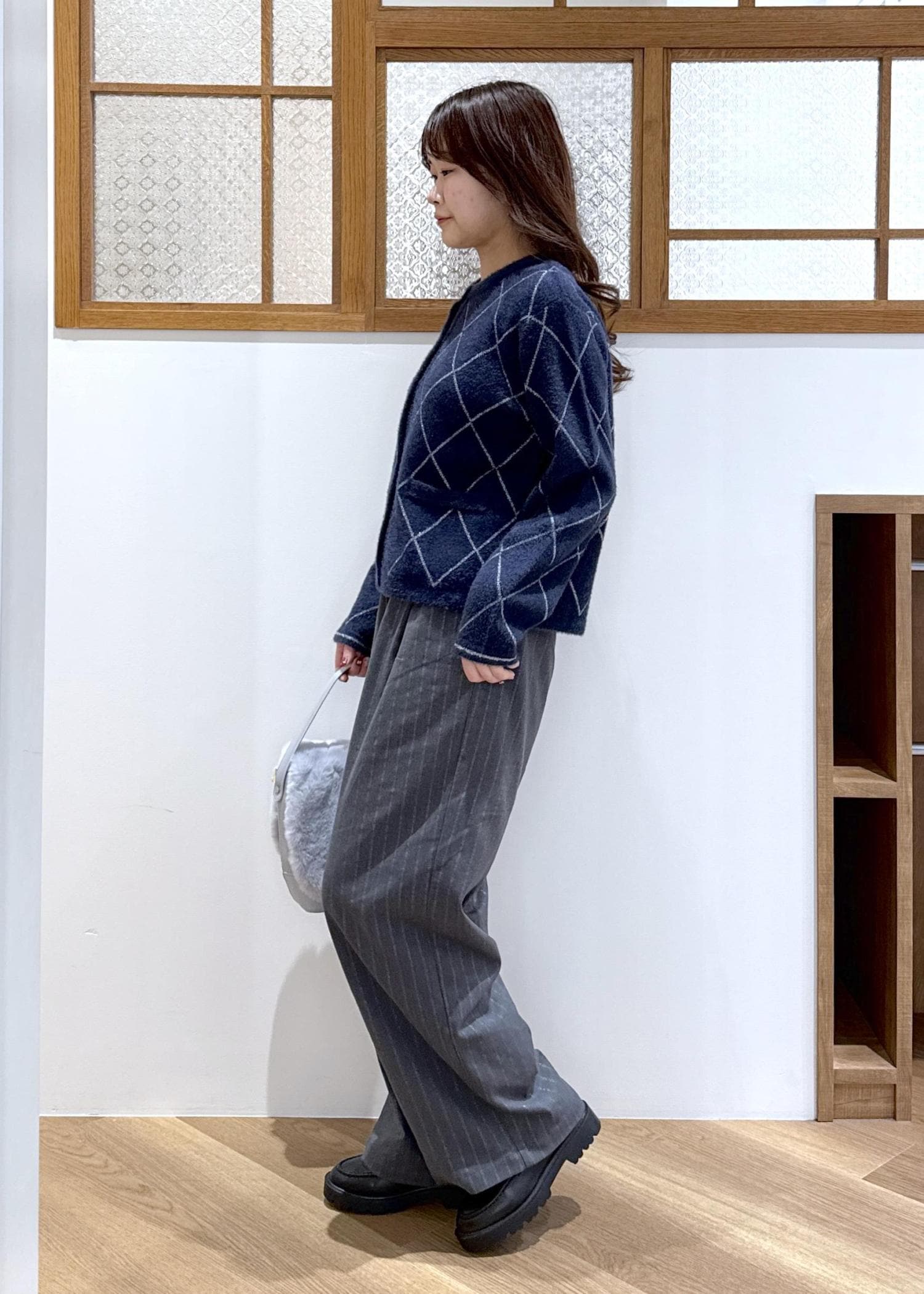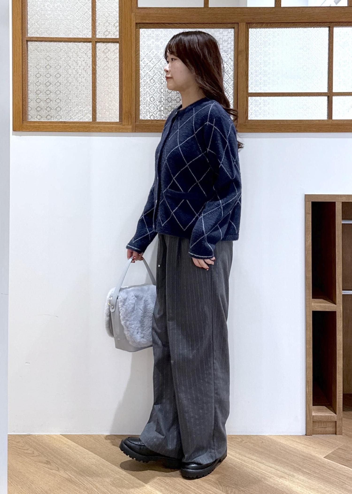 カーディガンのシルエットやボタン、また足がまっすぐ見えるワイドパンツからは綺麗見えする印象を感じられるのでお出かけにも着て頂きやすいです。