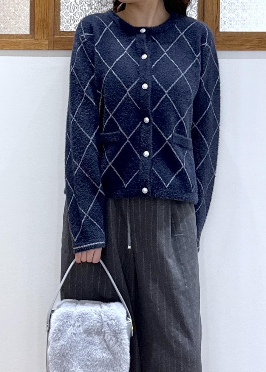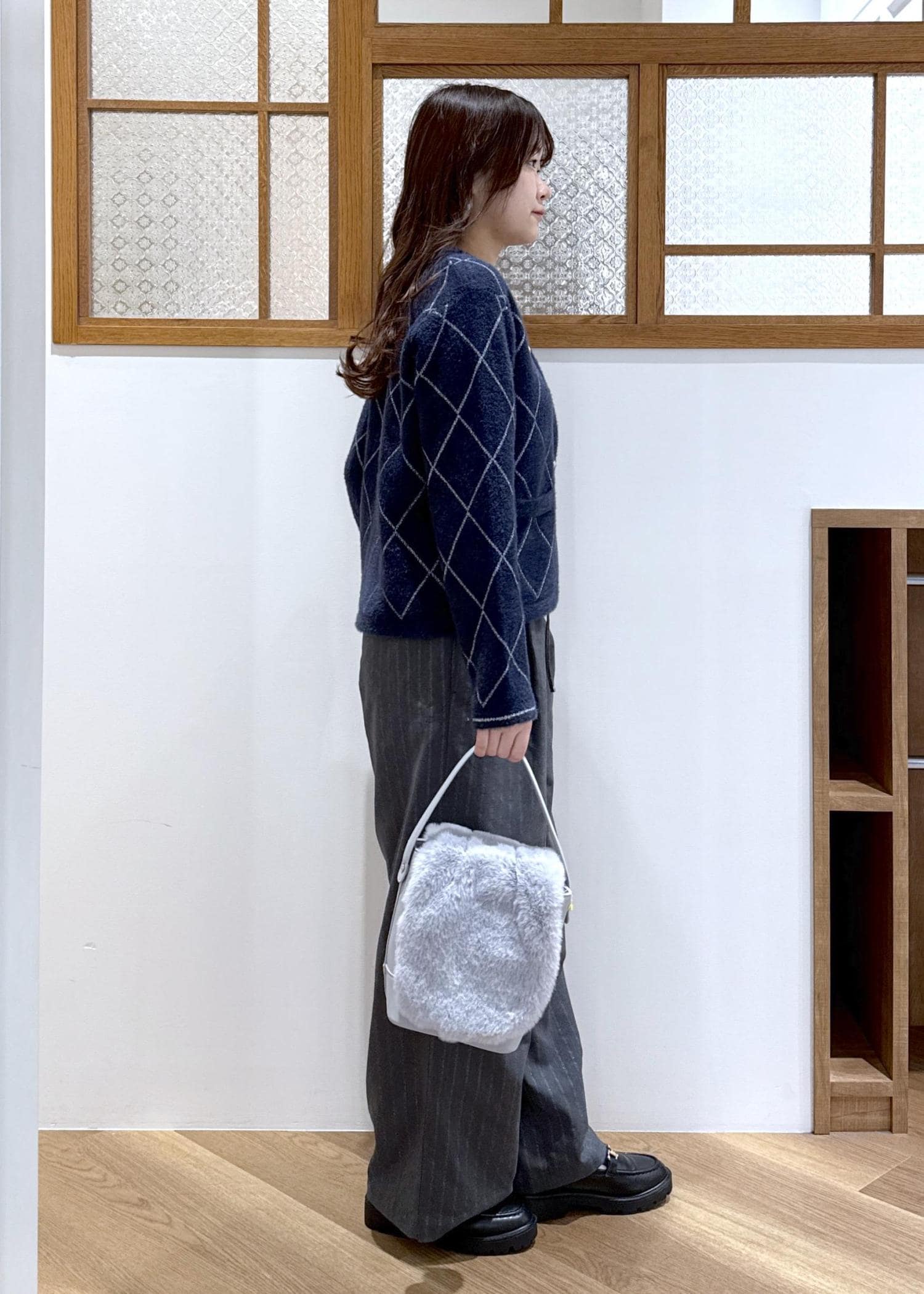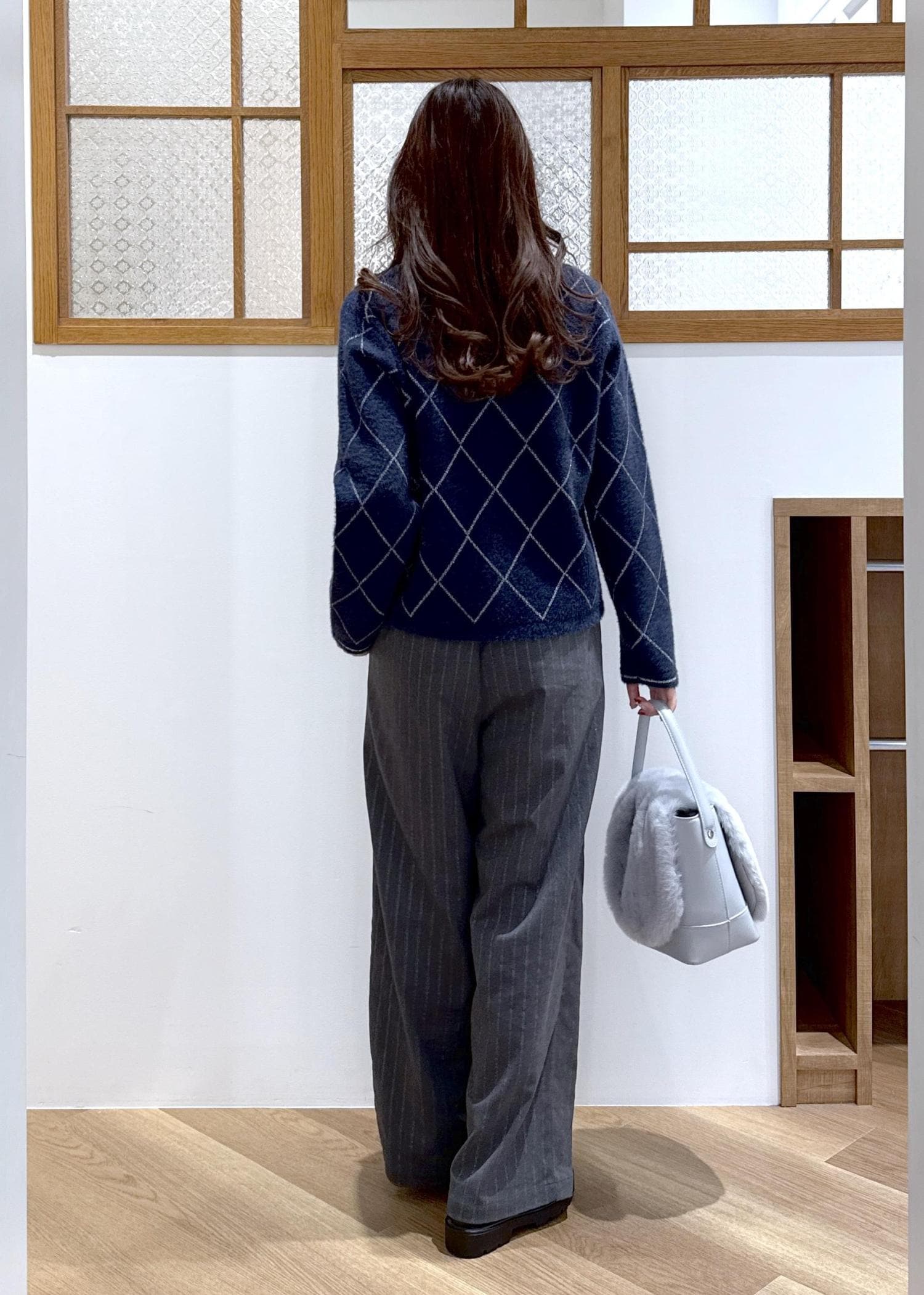 カーディガンのシルエットやボタン、また足がまっすぐ見えるワイドパンツからは綺麗見えする印象を感じられるのでお出かけにも着て頂きやすいです。