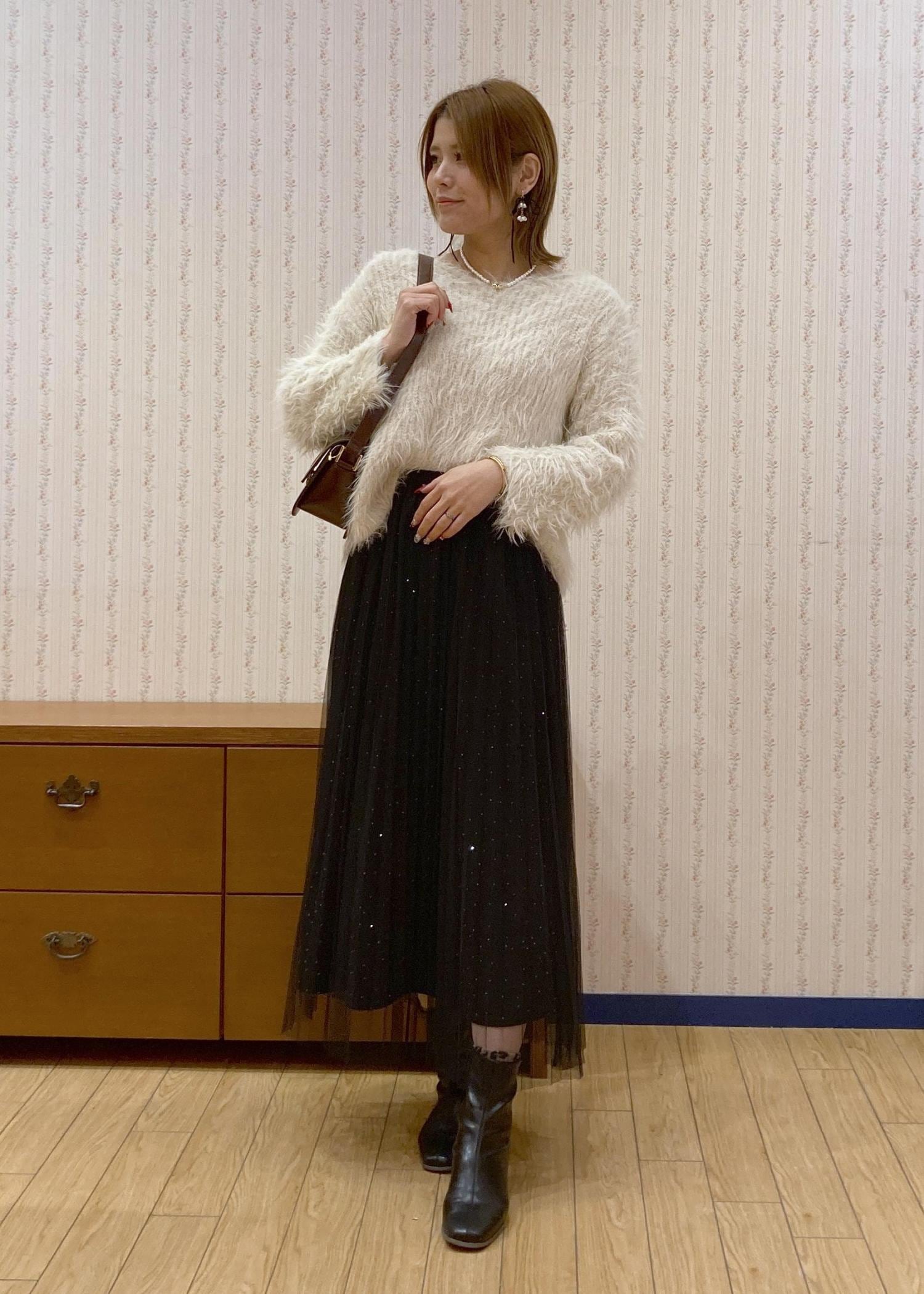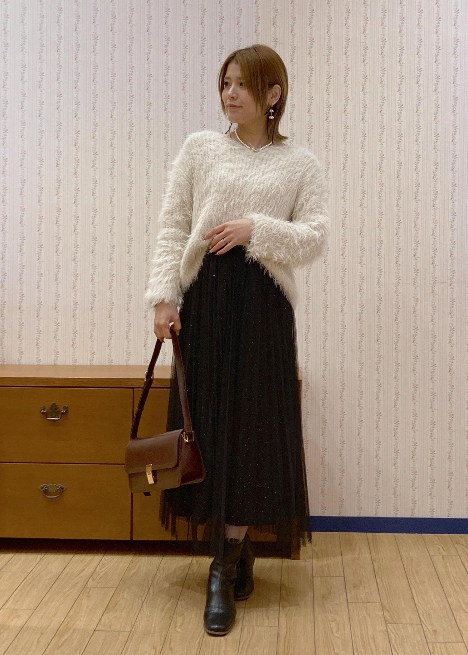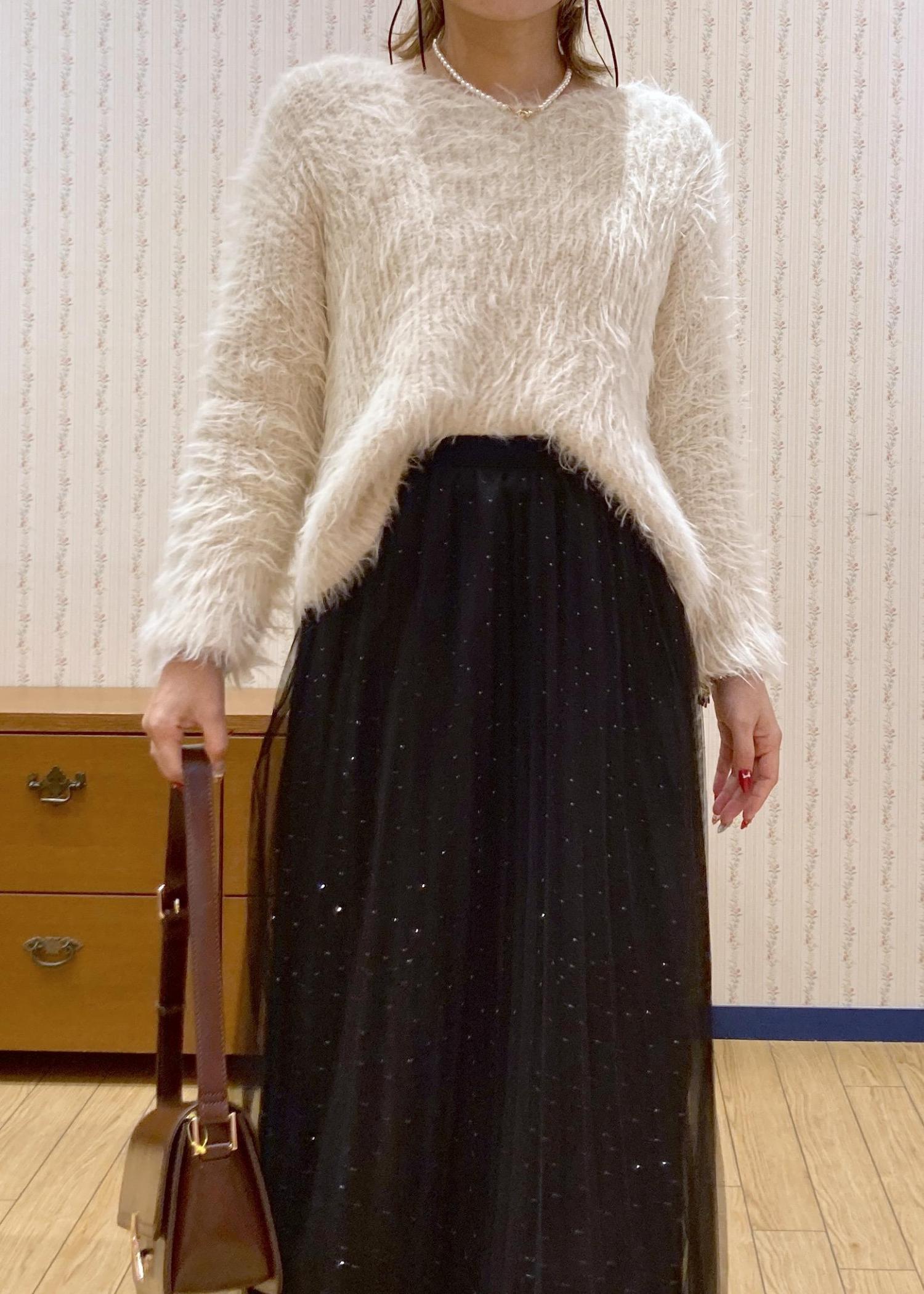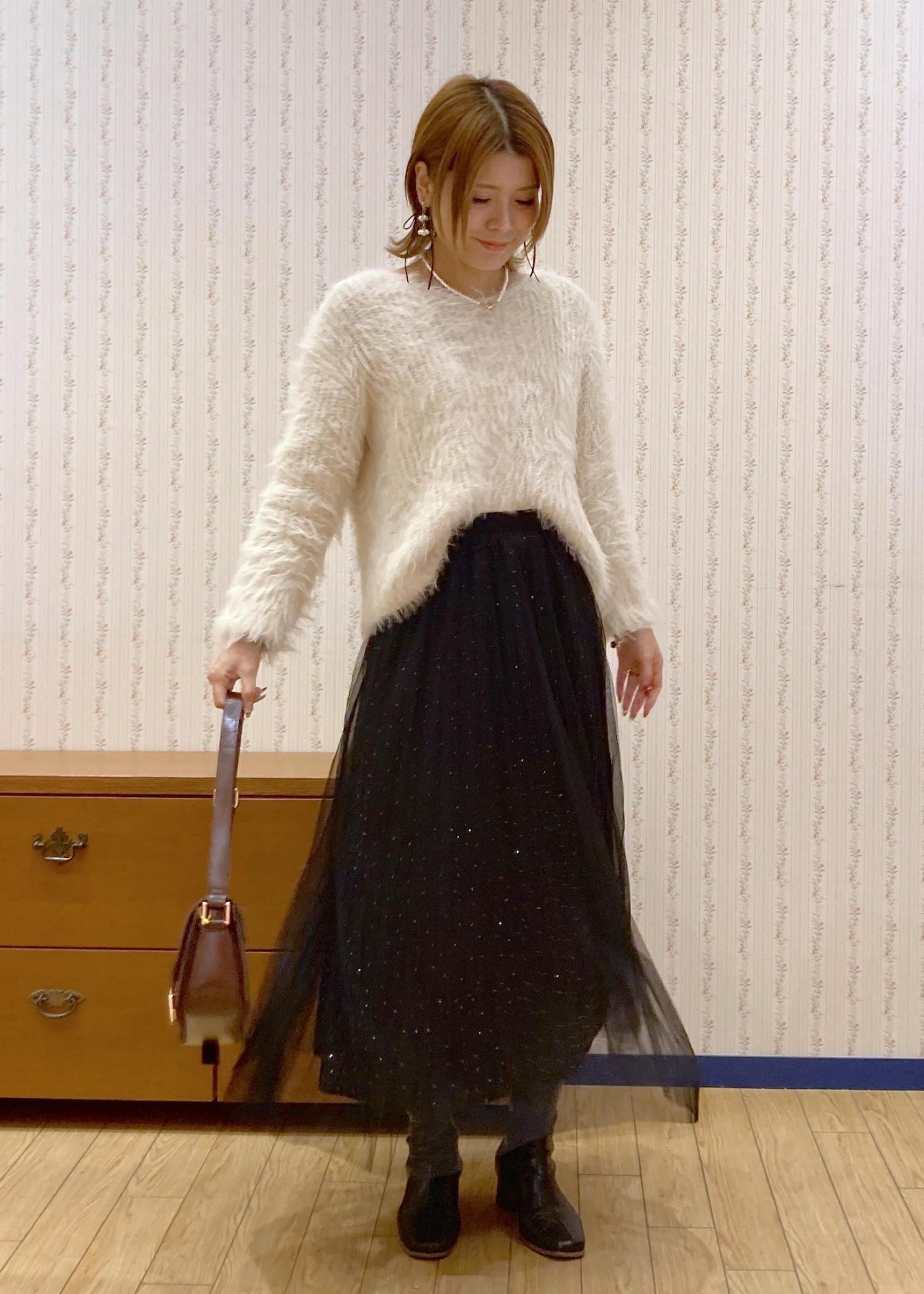 フワフワなシャギーニットにキラキラなチュールスカートを合わせたホリデーシーズンにピッタリのモノトーンコーディネートです!