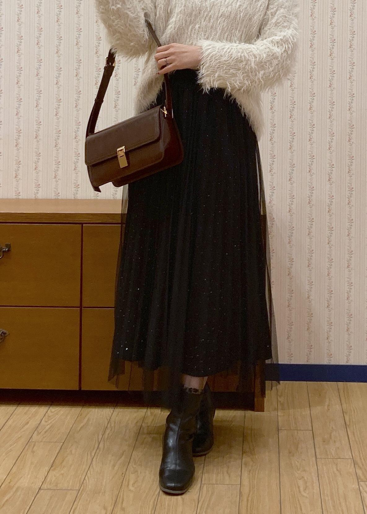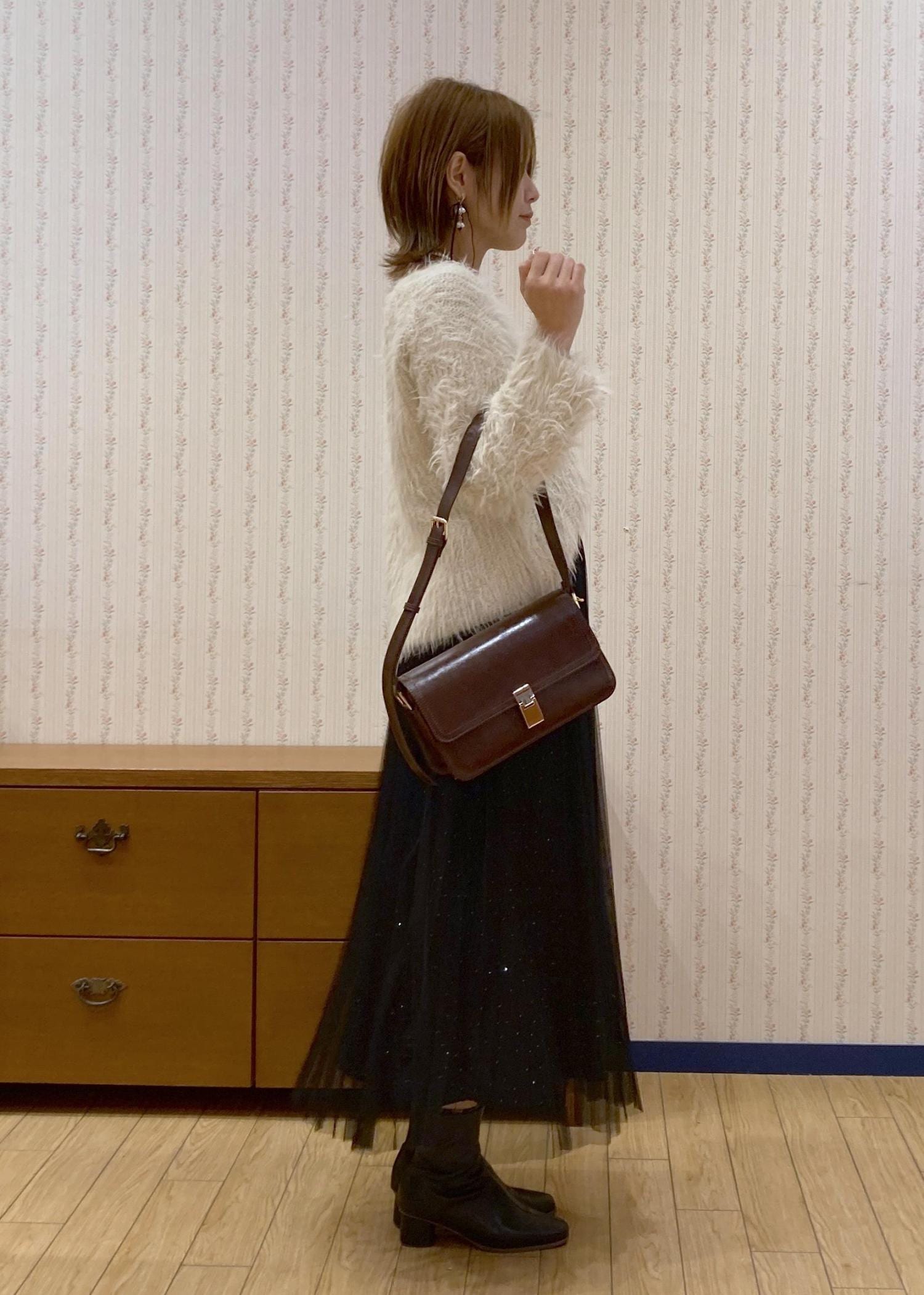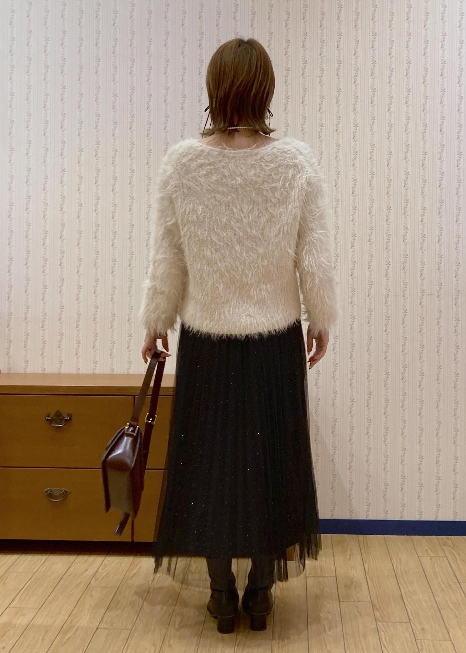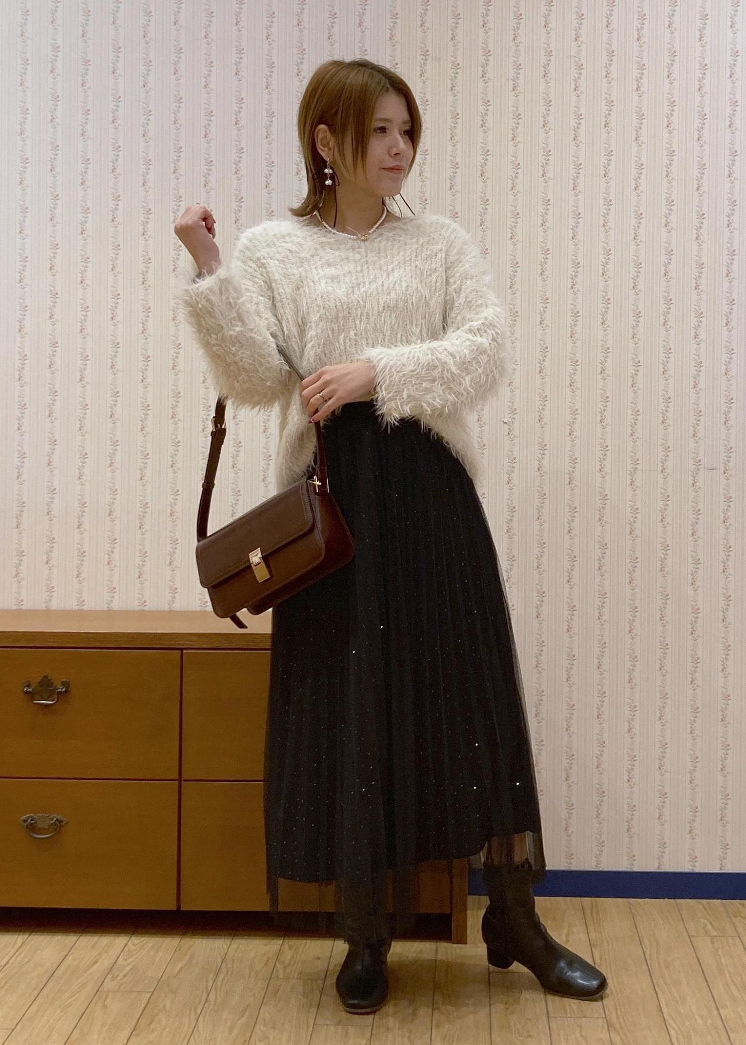 フワフワなシャギーニットにキラキラなチュールスカートを合わせたホリデーシーズンにピッタリのモノトーンコーディネートです!