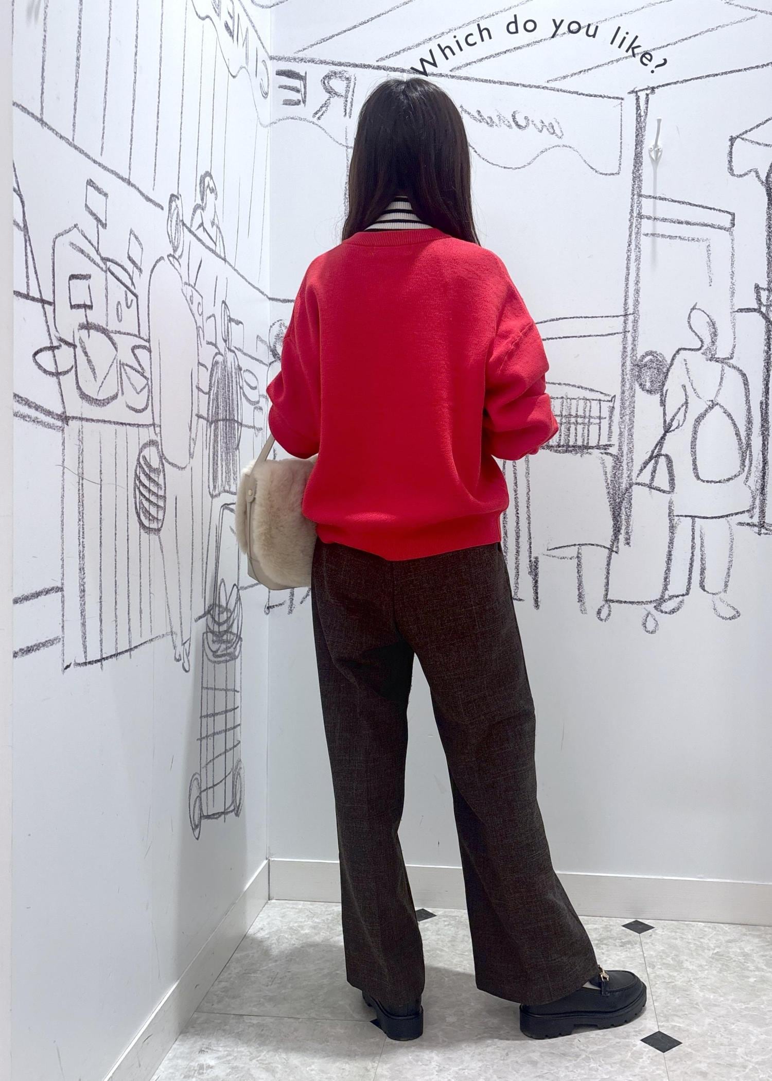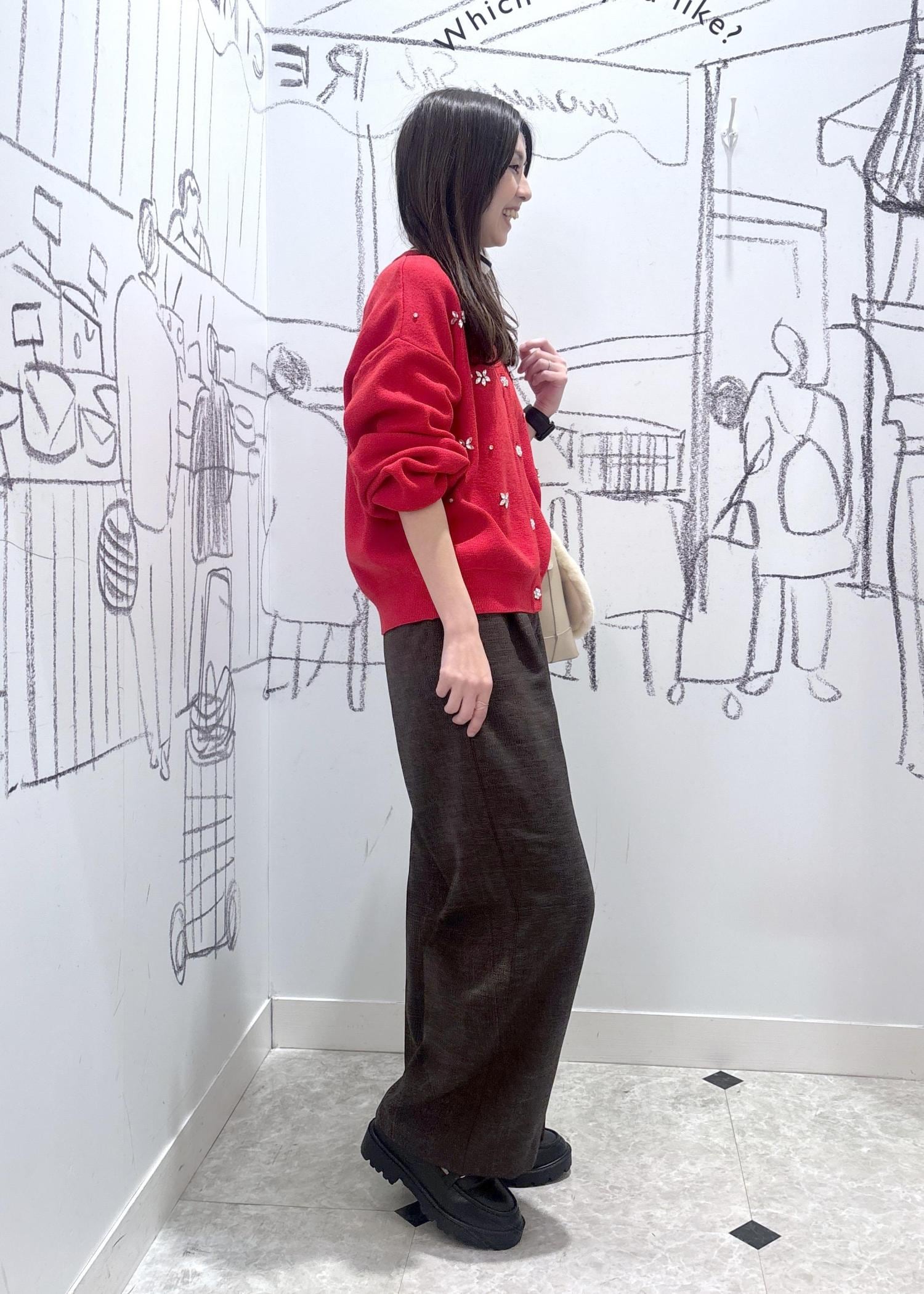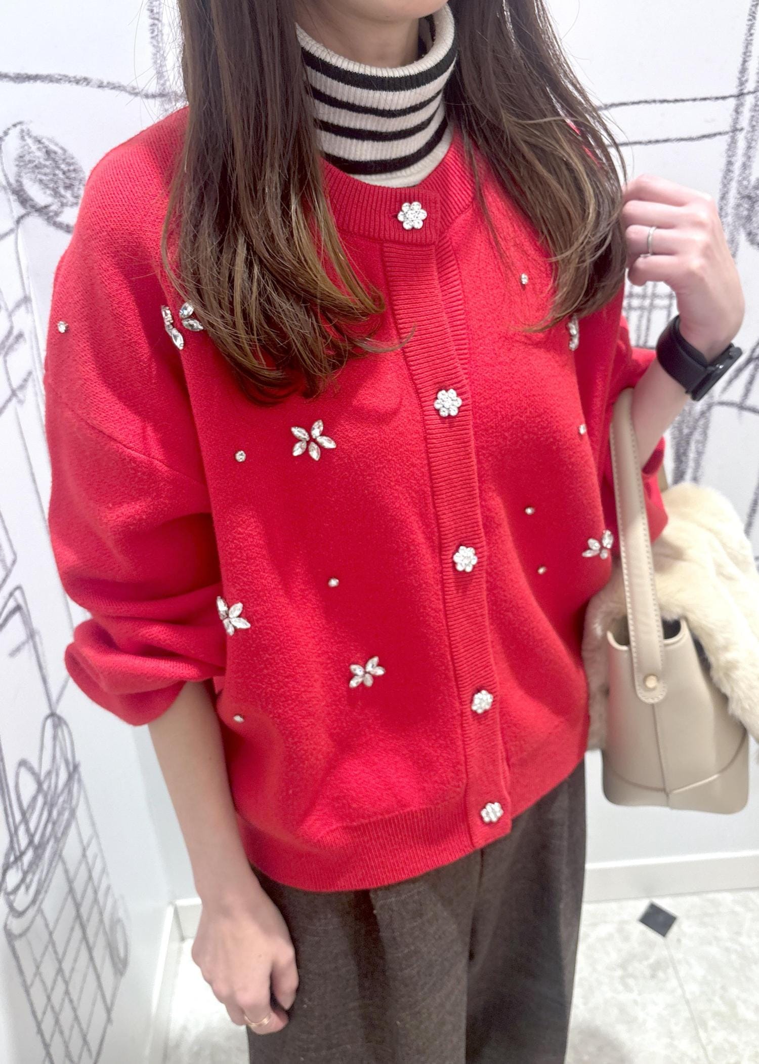ビジューが散りばめられたホリデーシーズンにおすすめの赤カーディガンをパンツと合わせたきれいめコーディネートです。