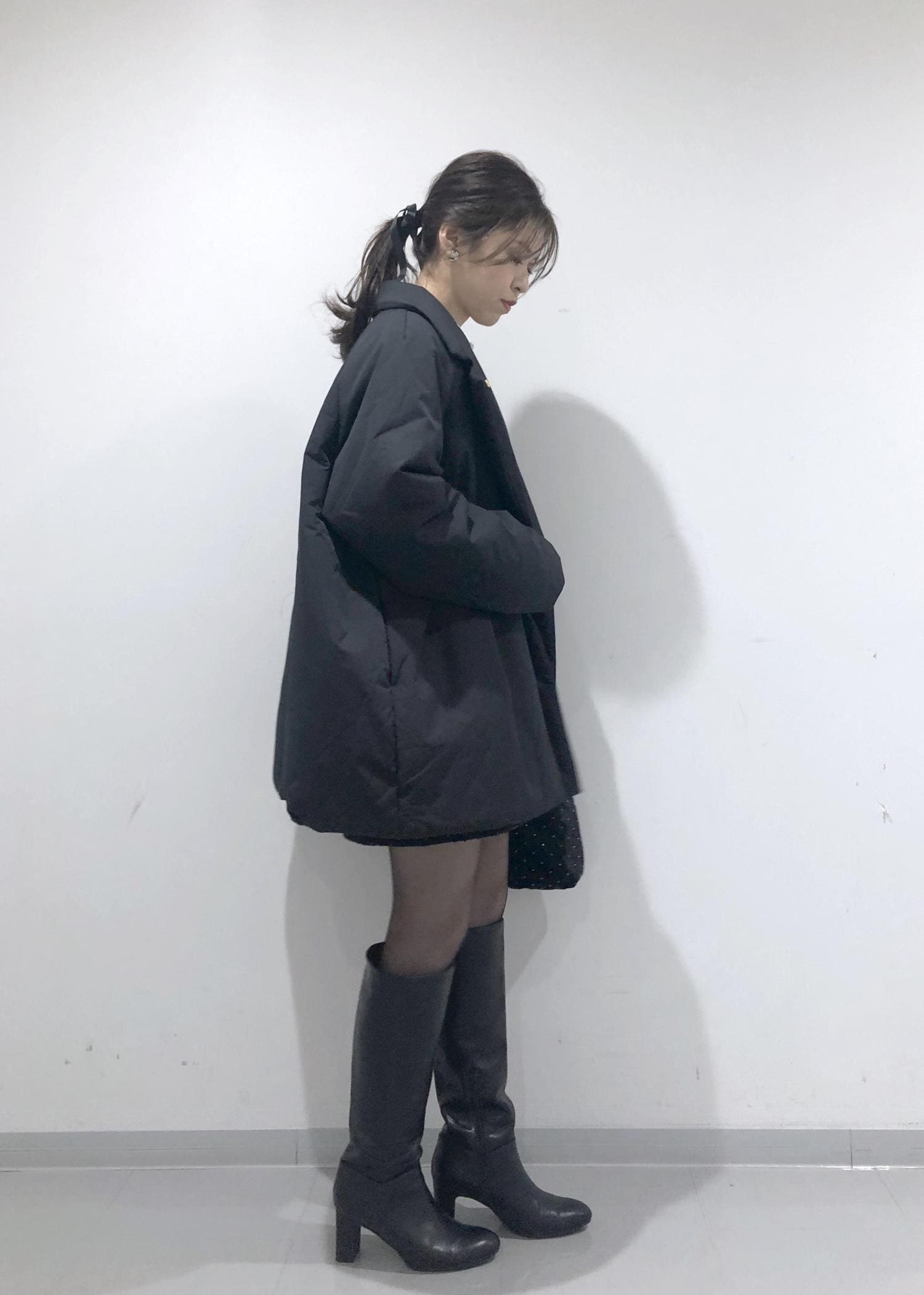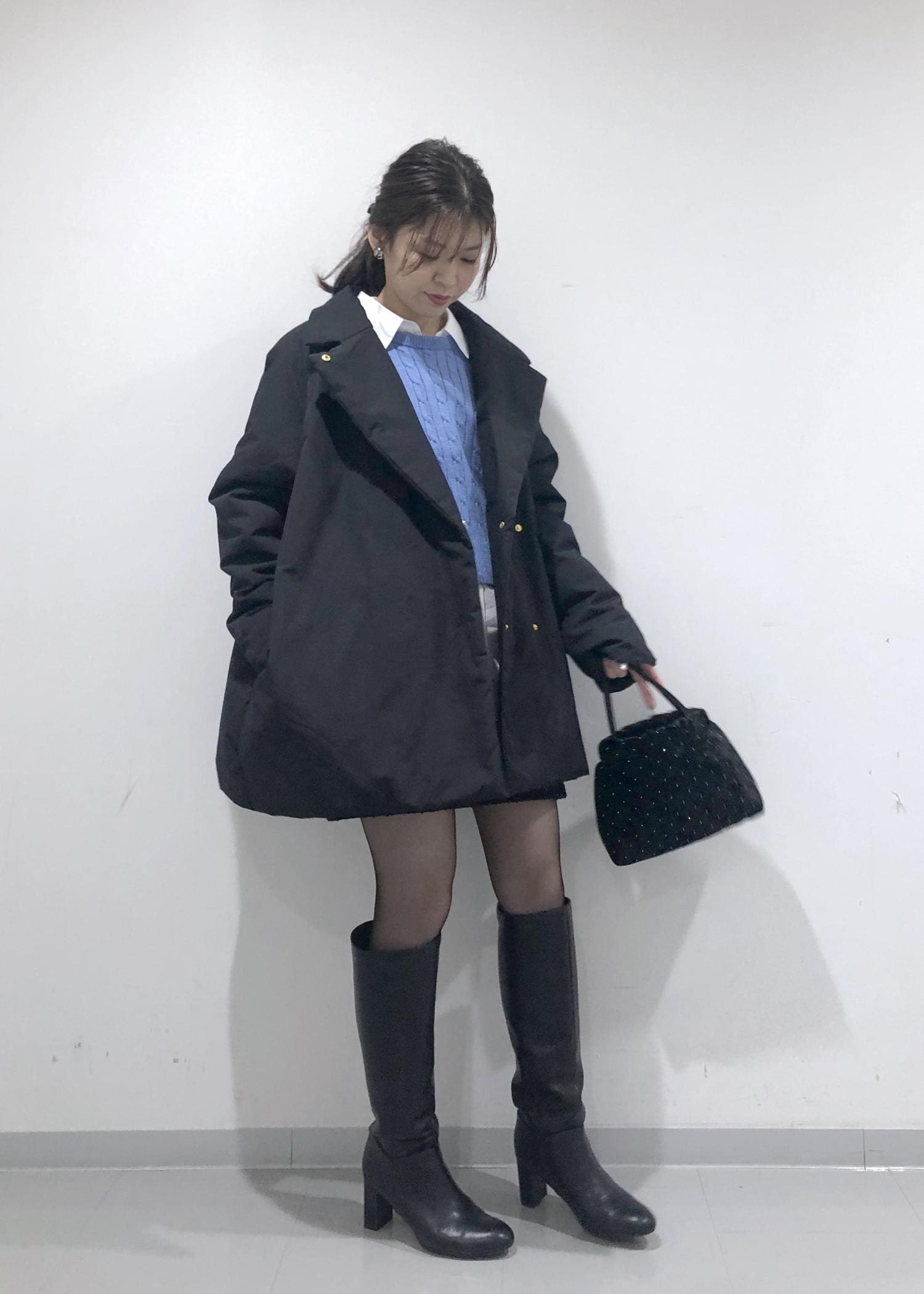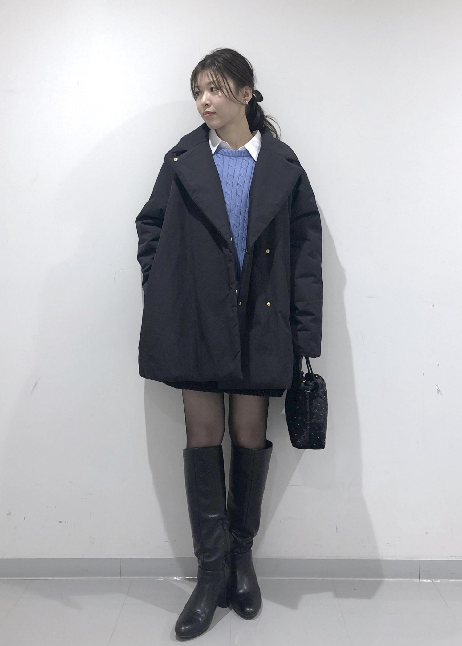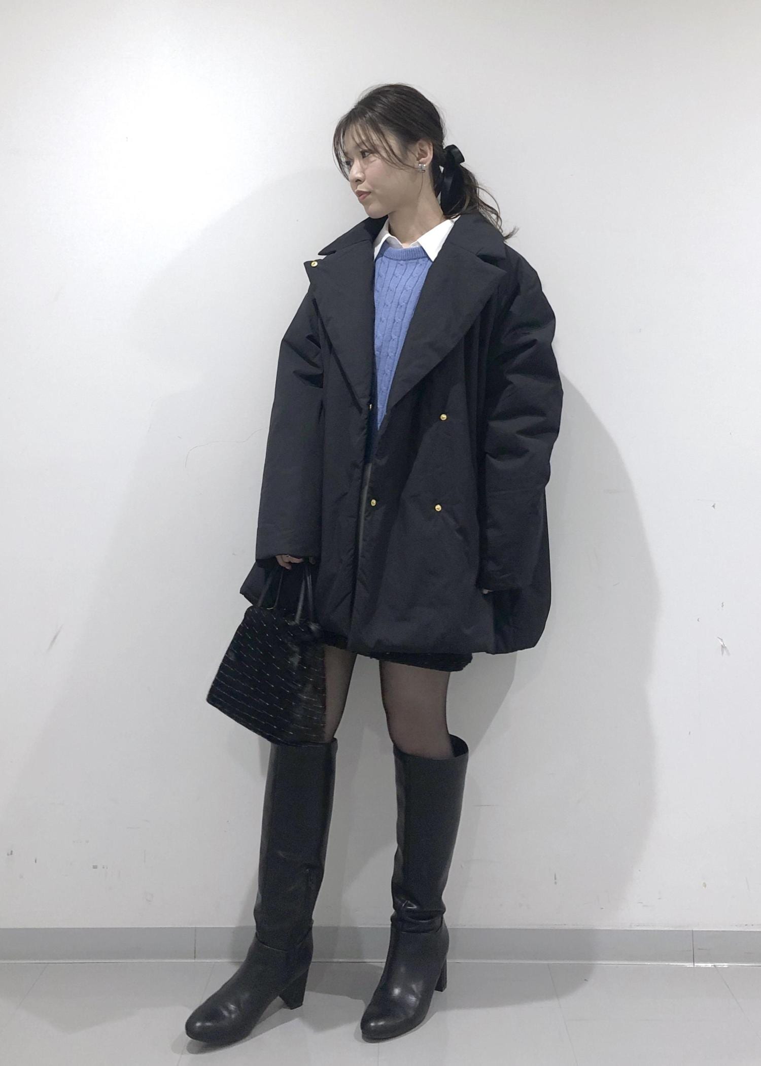 ミニスカート×ロングブーツスタイルに中綿テーラードコートを羽織ったカジュアルコーデ!!