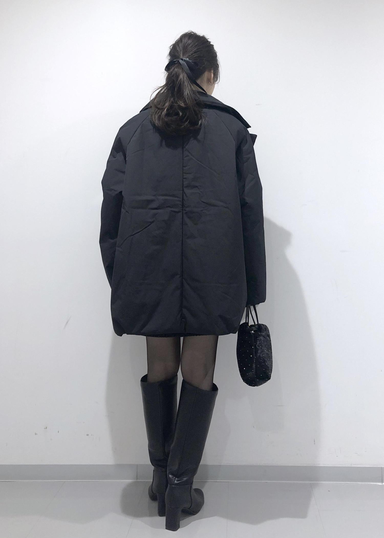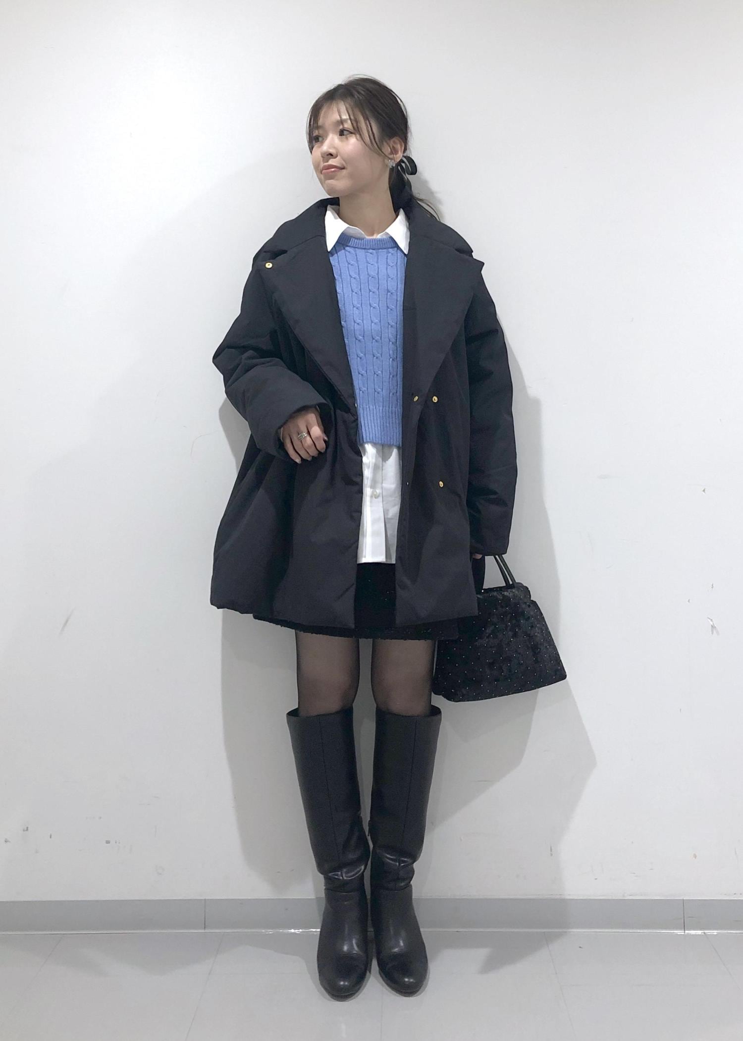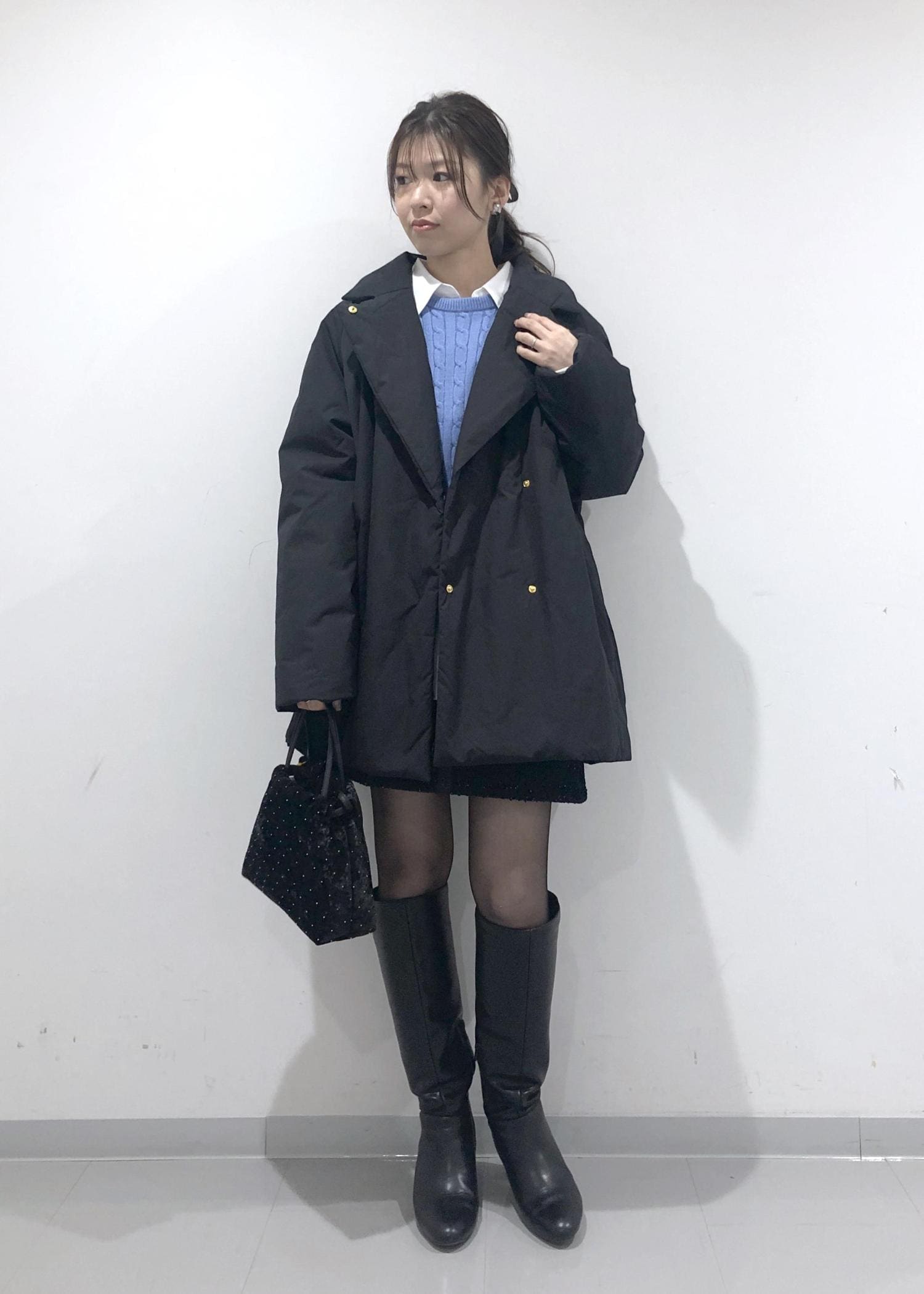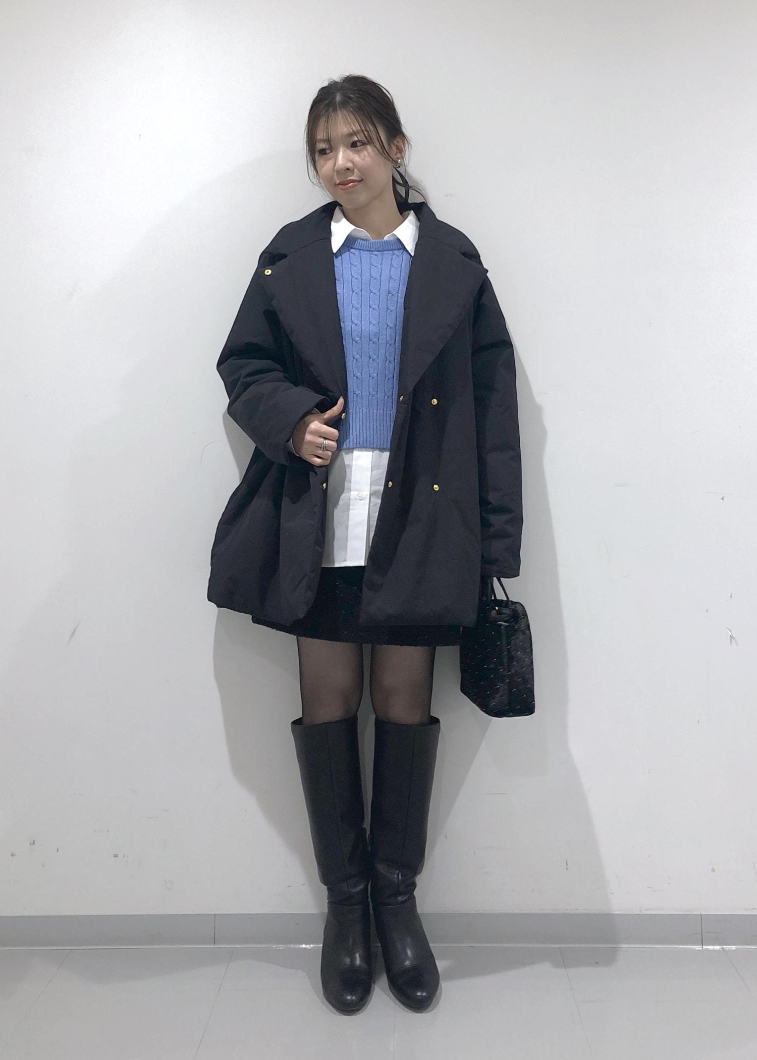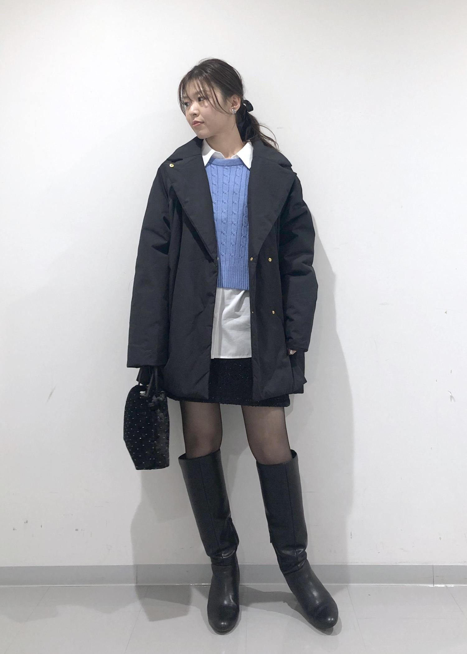 ミニスカート×ロングブーツスタイルに中綿テーラードコートを羽織ったカジュアルコーデ!!