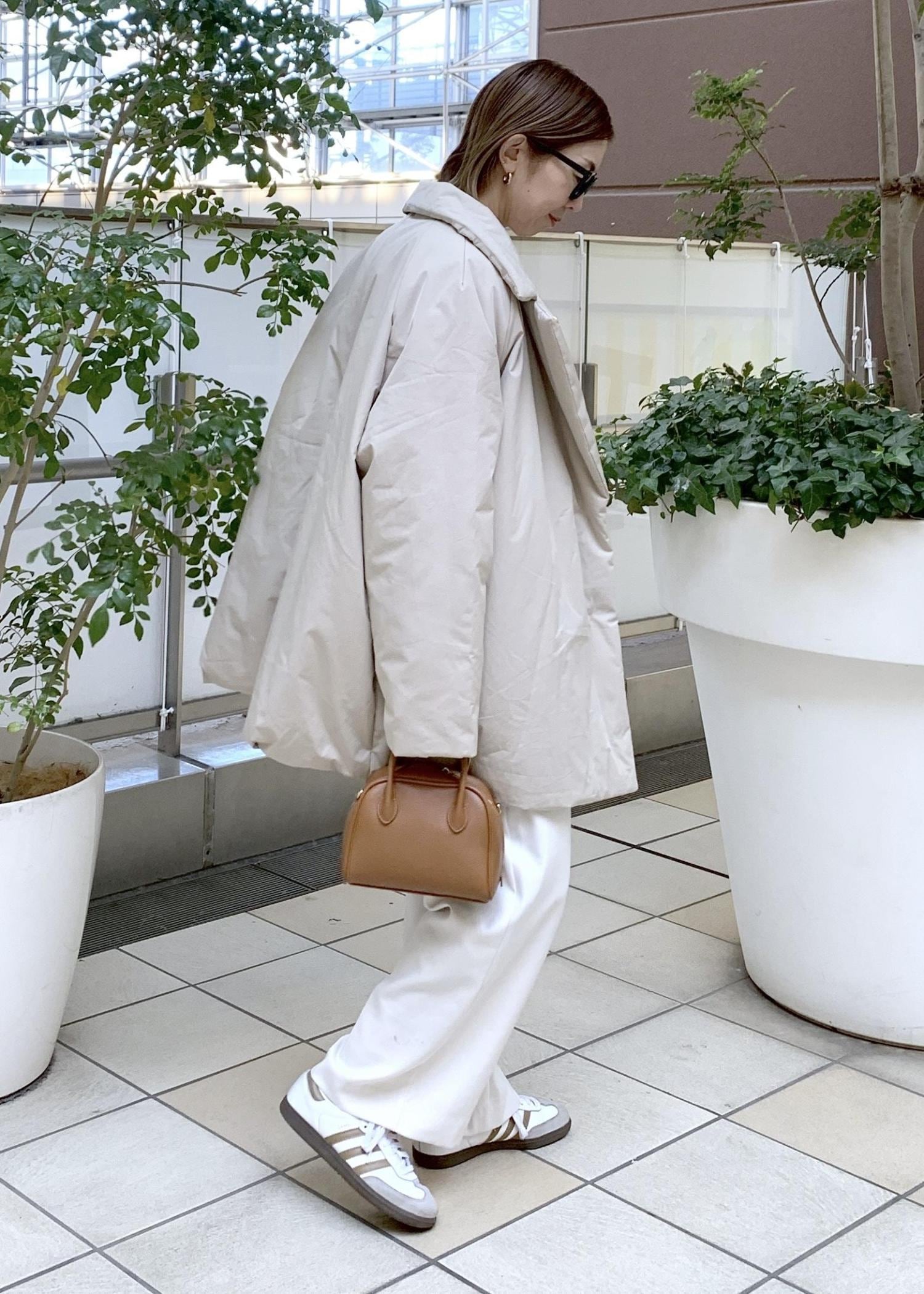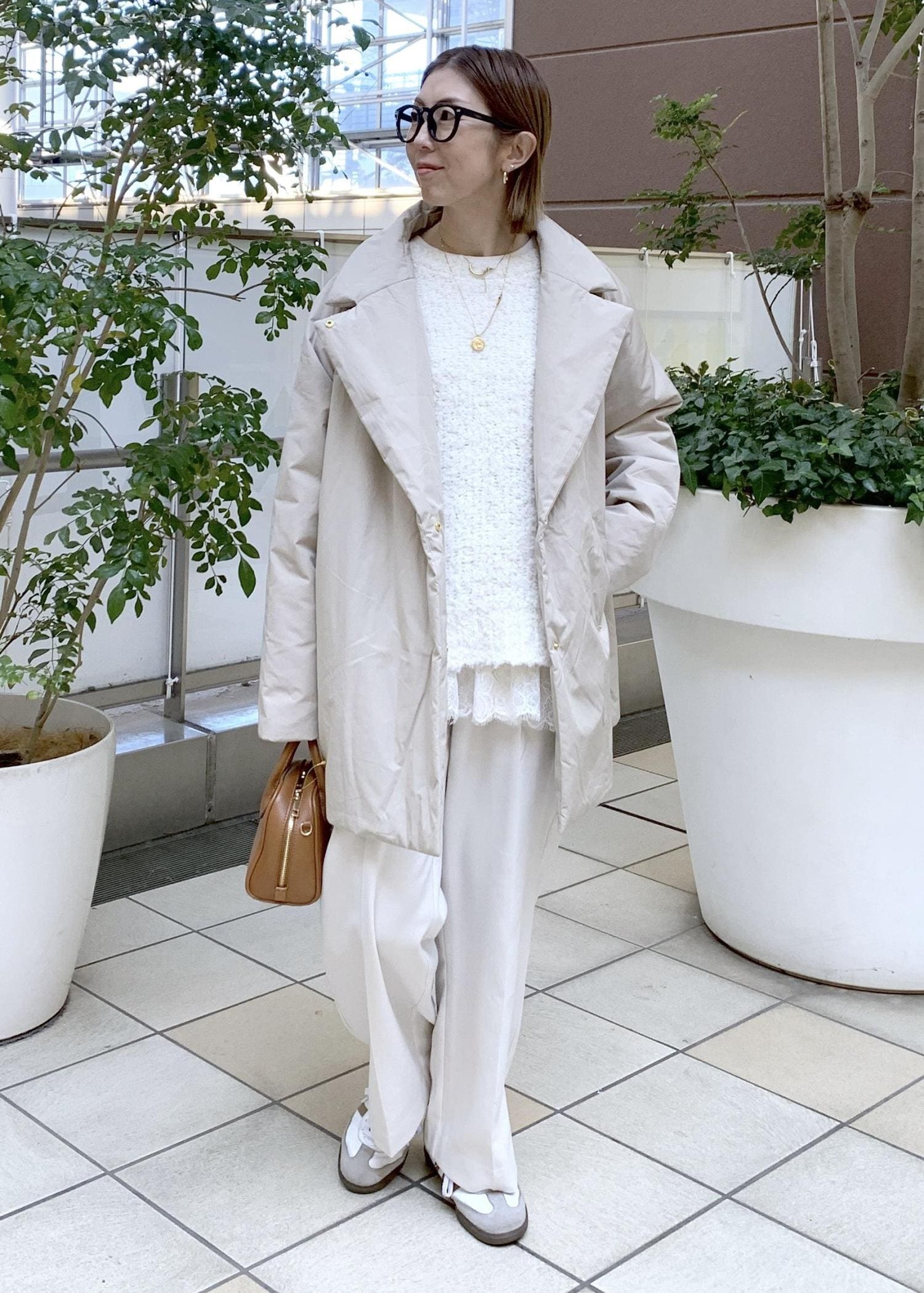 ベージュ×ホワイトでまとめたワントーンスタイリング。