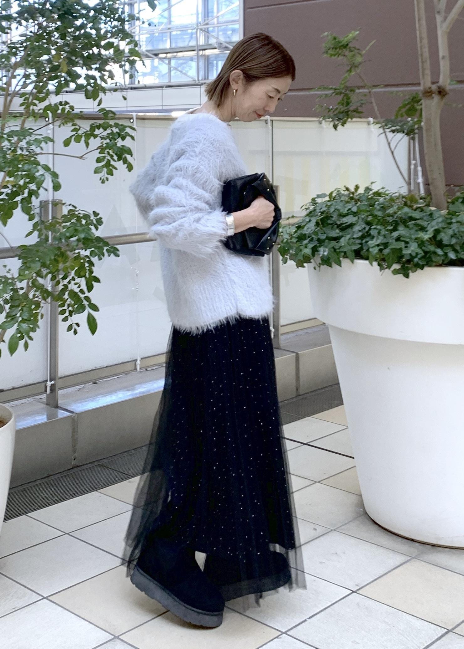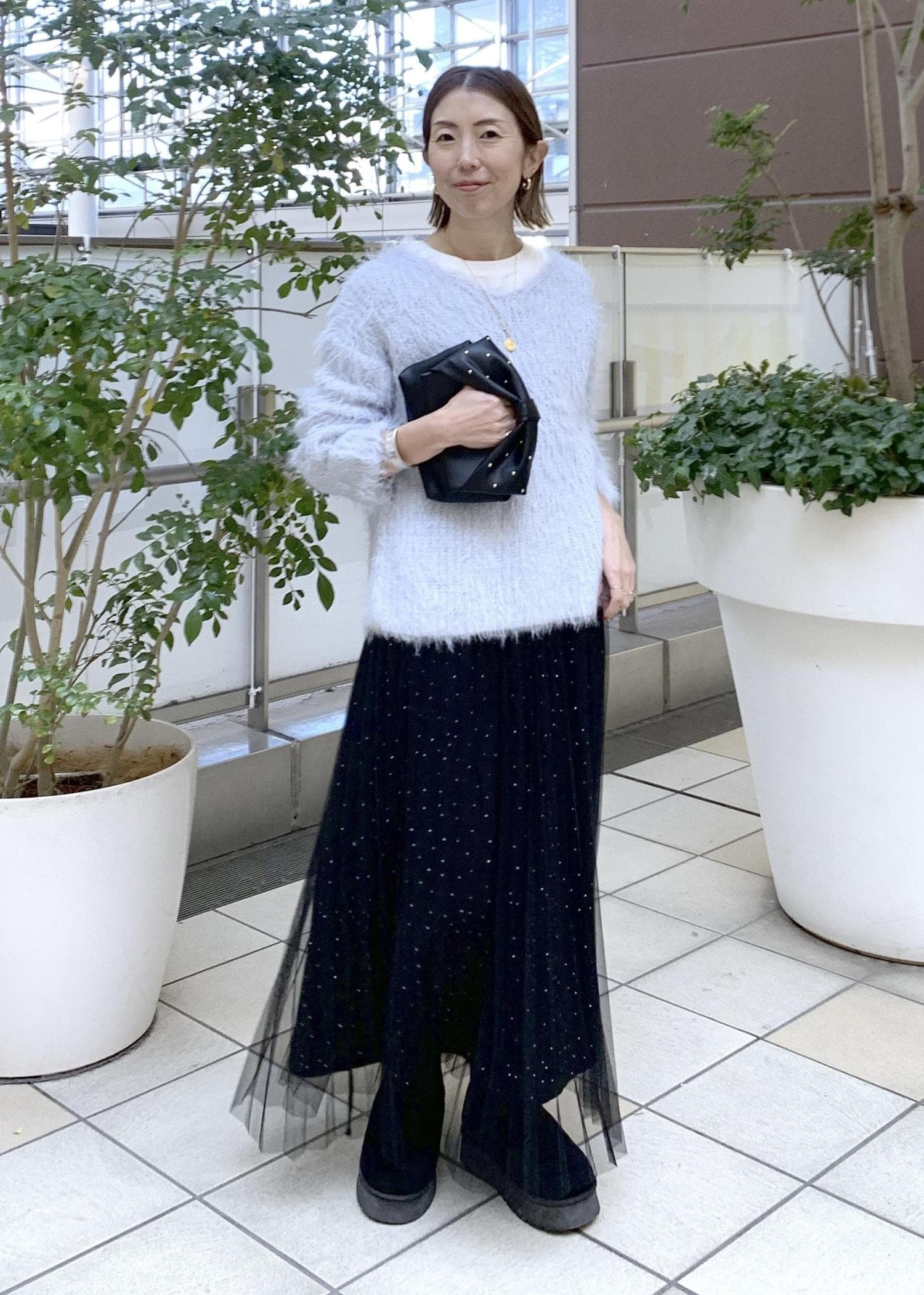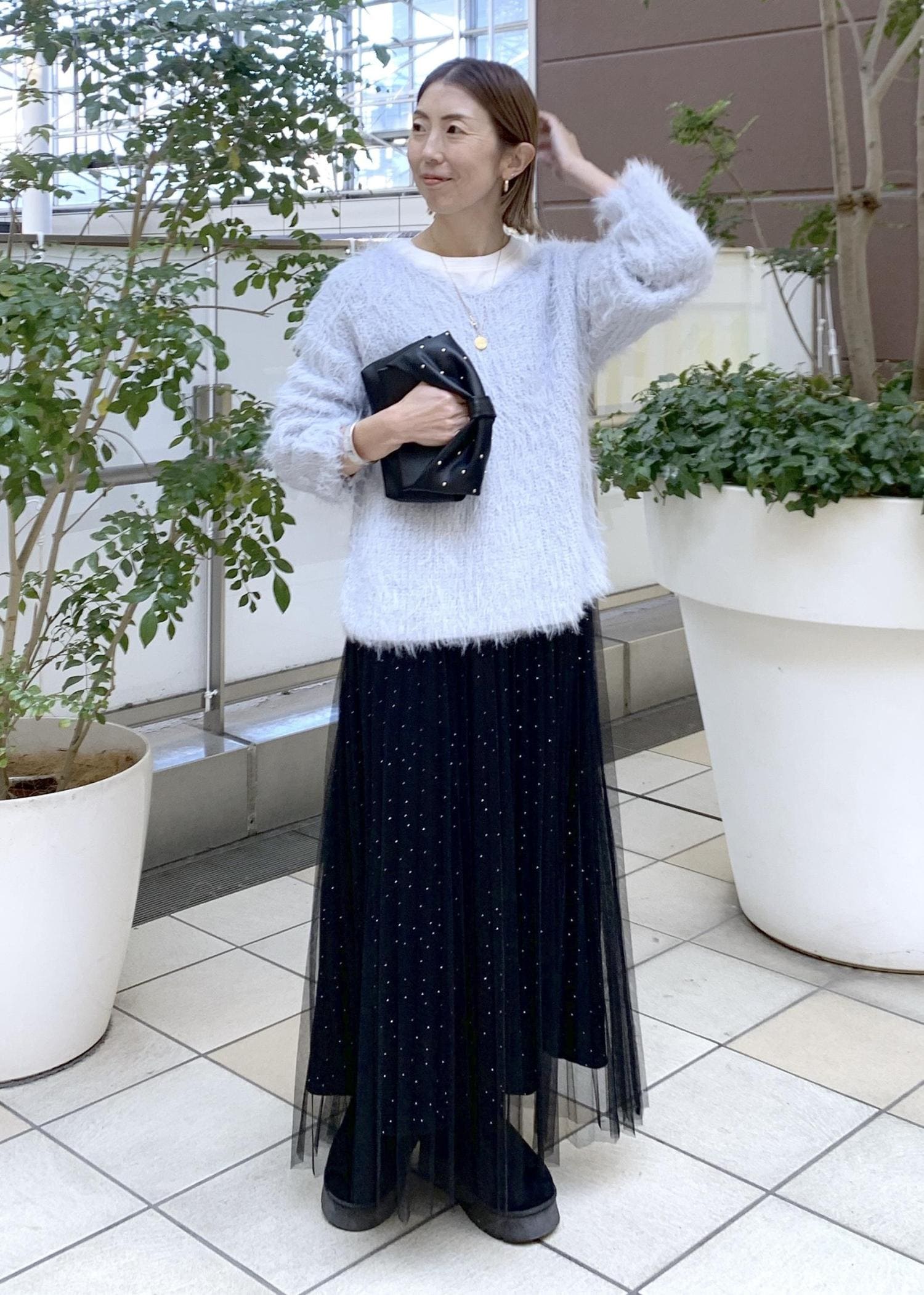 毛足の長いフェザーニットとキラキラが華やかなチュールスカートを合わせた大人のホリデーコーデ