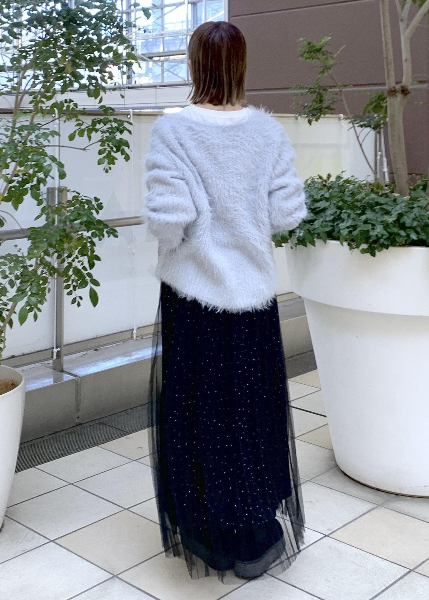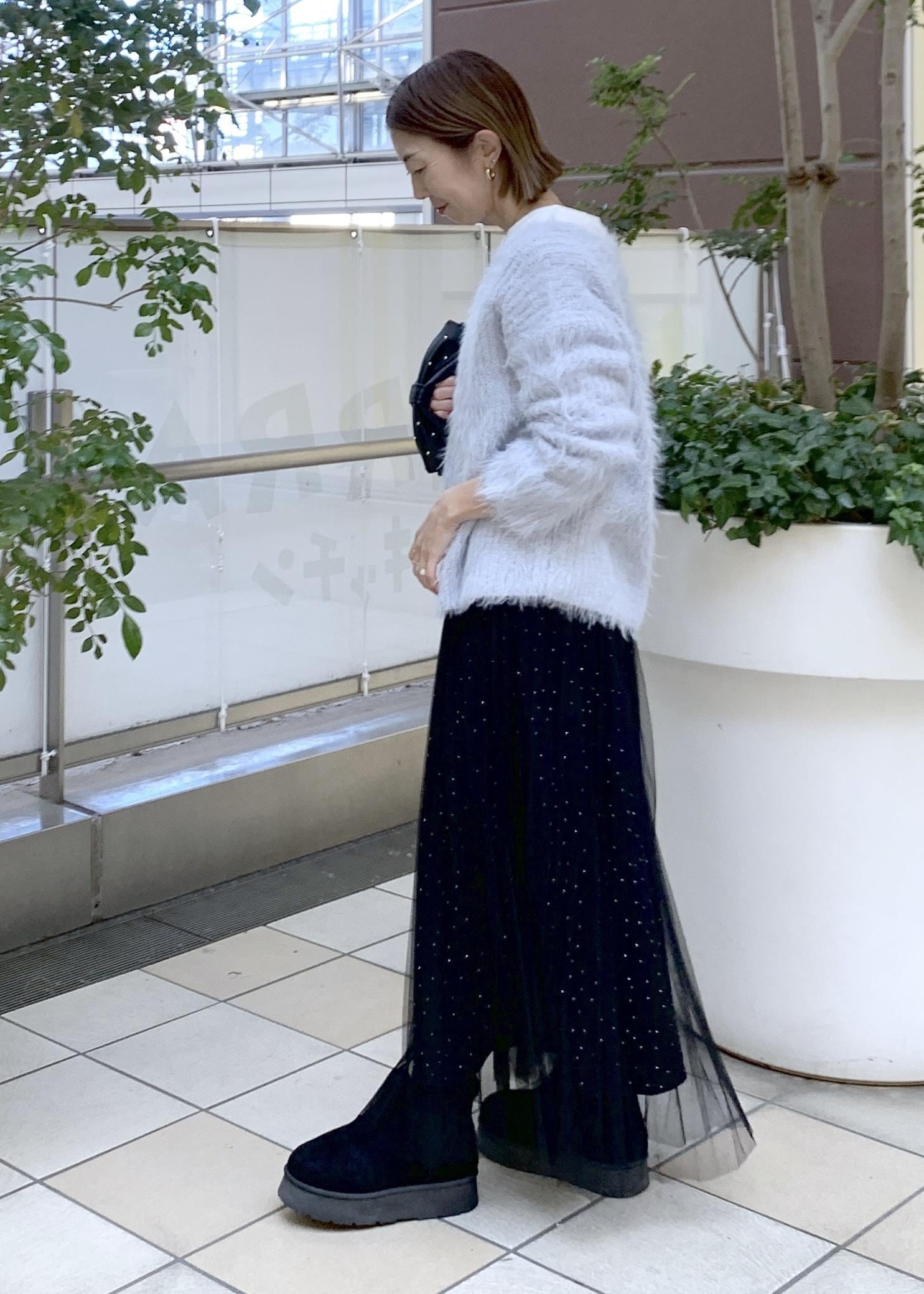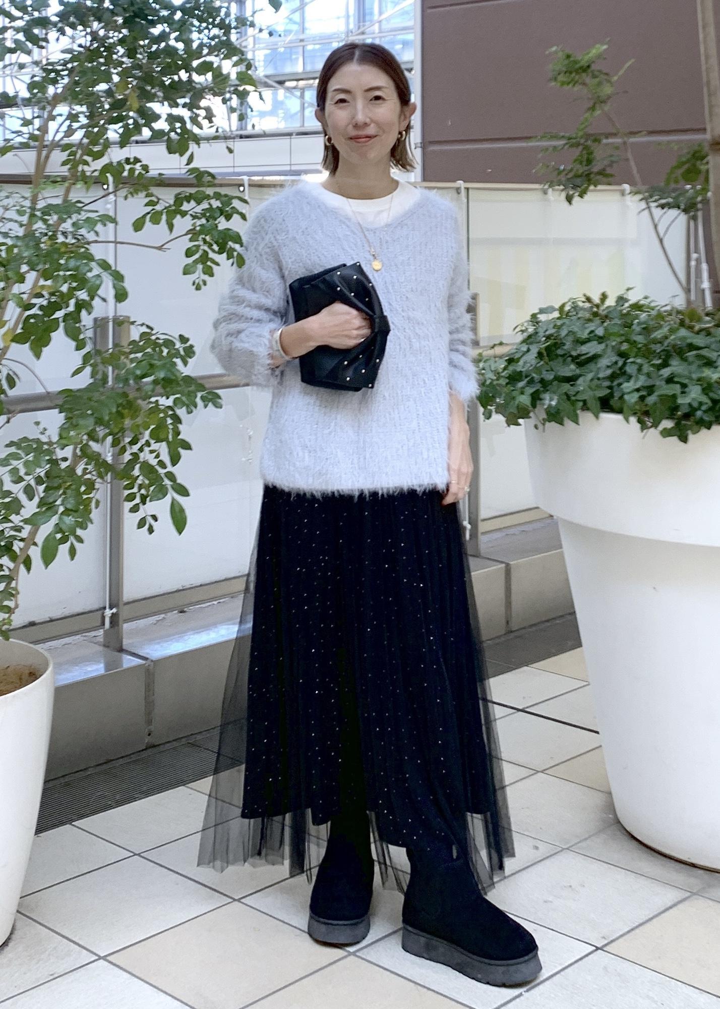 毛足の長いフェザーニットとキラキラが華やかなチュールスカートを合わせた大人のホリデーコーデ