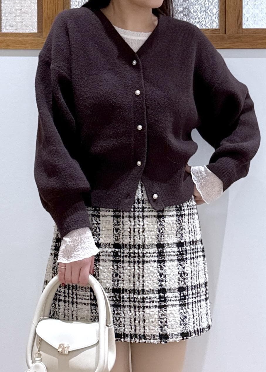 カーディガンと足元をダークブラウンで揃えた、大人見えするガーリーコーディネートです。