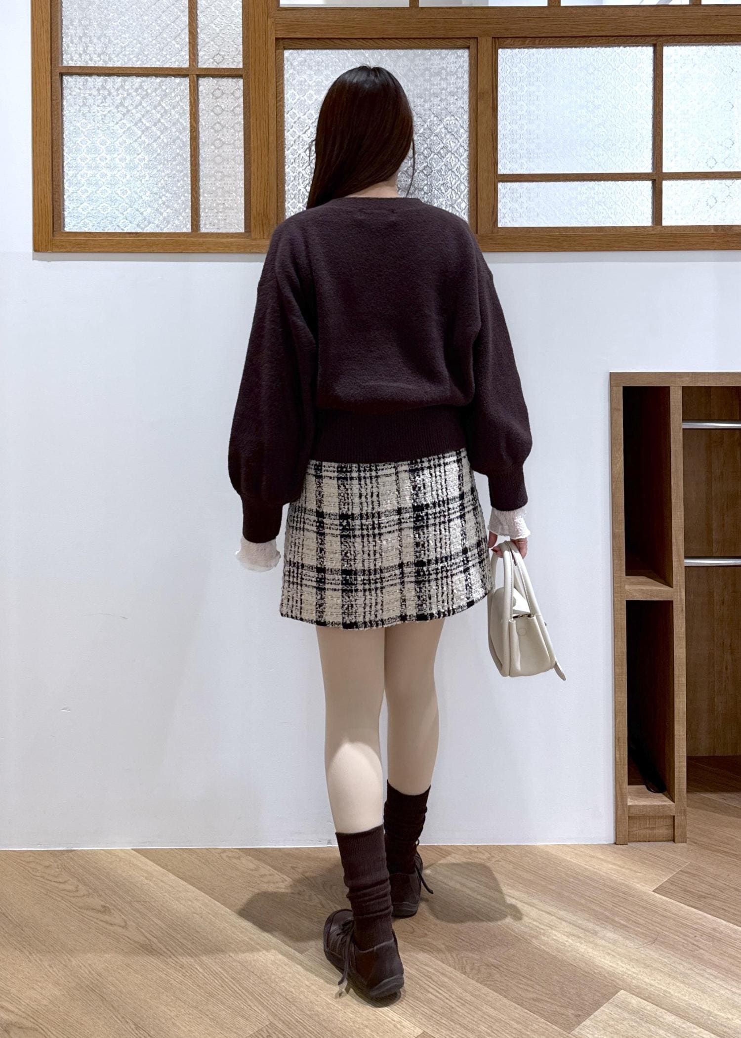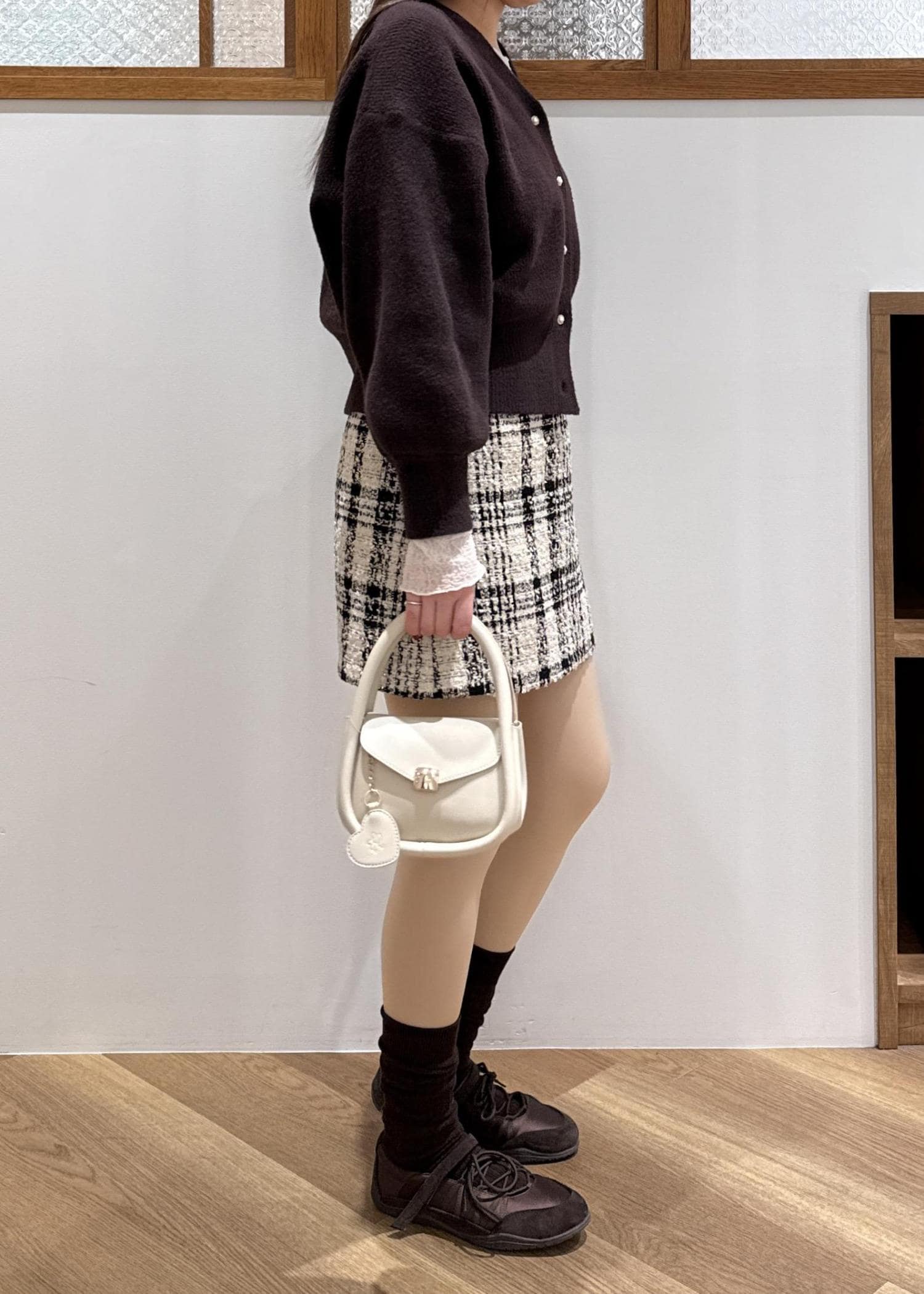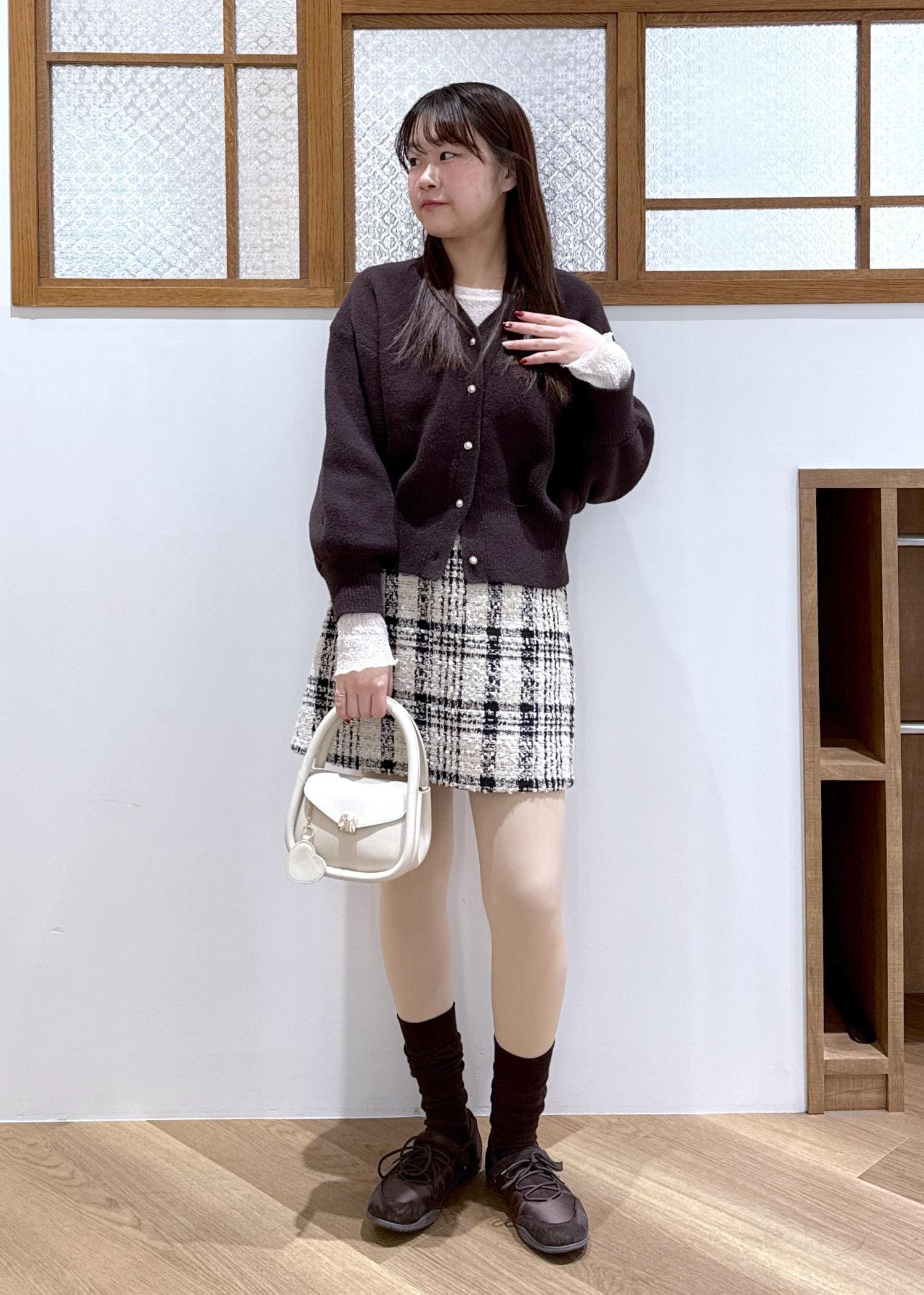 大きめのチェックが印象的なミニスカートを合わせ、とことん可愛らしさを追求。