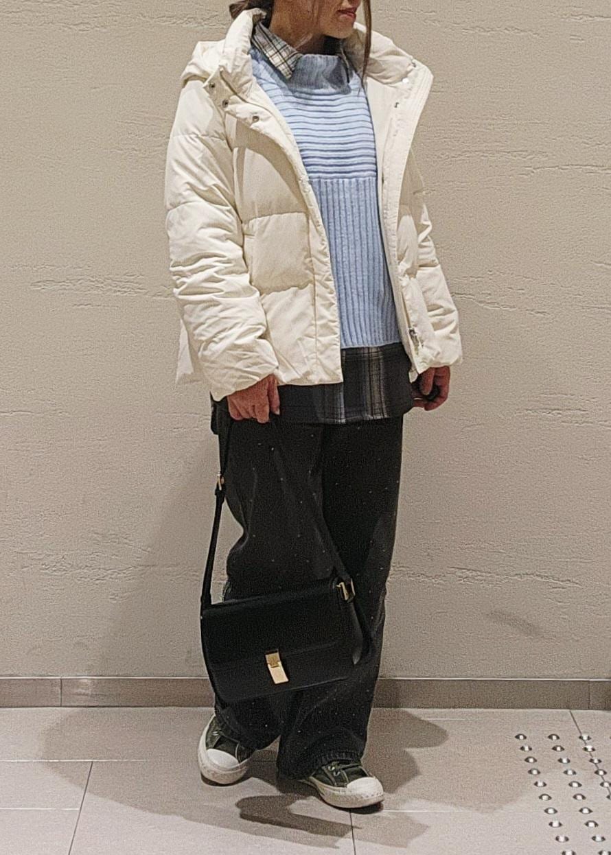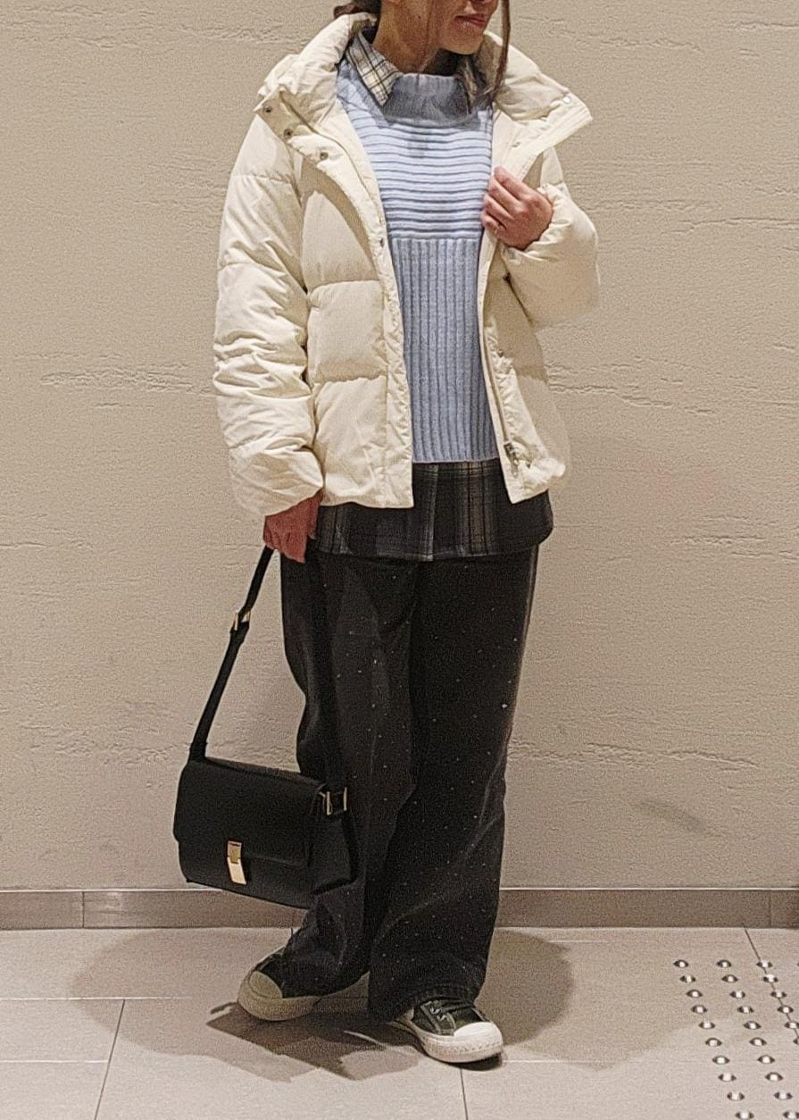 チェック柄とキラキラデニムがアクセントになり、より冬らしいコーデに◎