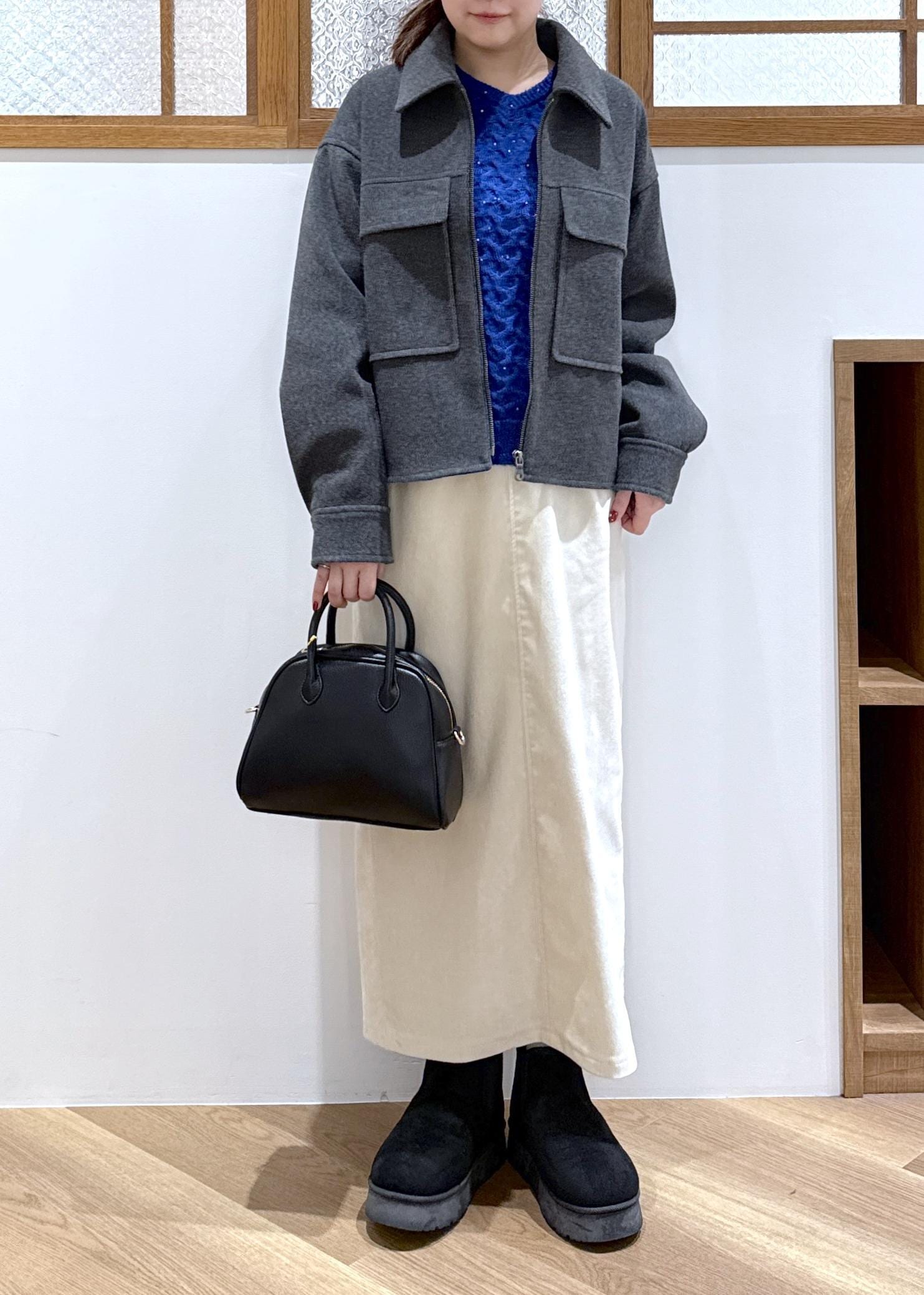 ROPÉ PICNICジャージーメルトンシリーズ ポケット付きジップブルゾン/リンクコーデチャコール / F¥9,999レビューショート丈で、どのボトムともバランスのとりやすいアウターです。