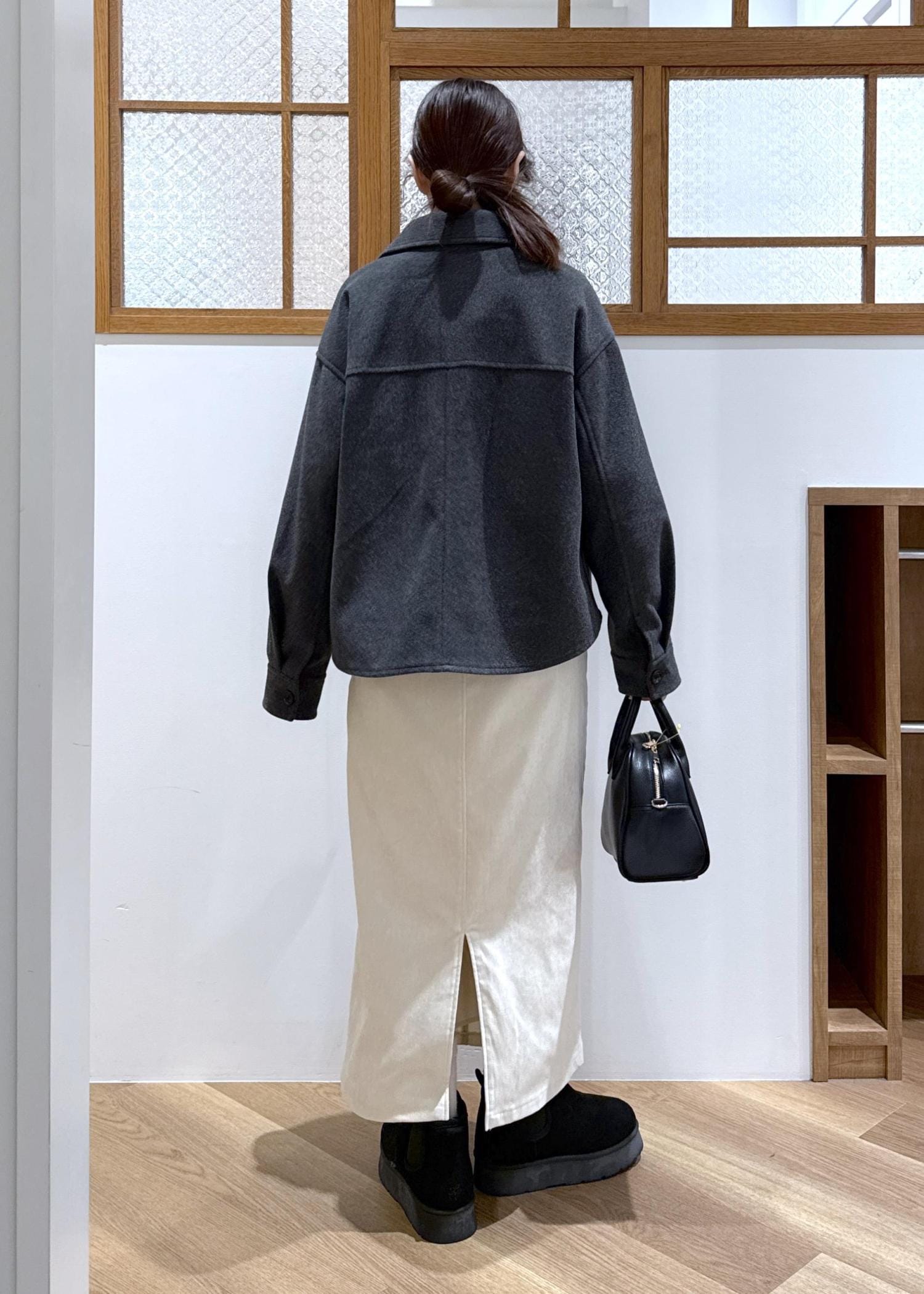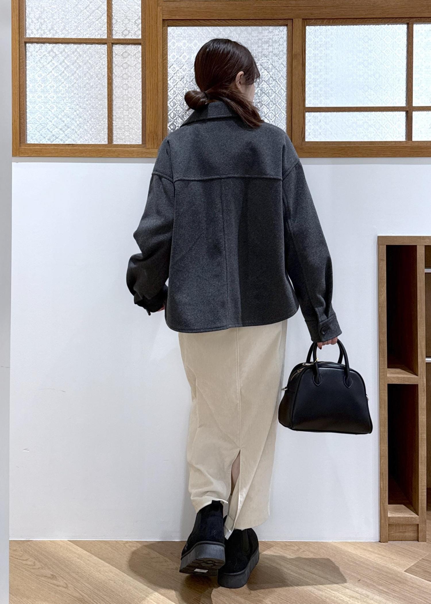 落ち着いたグレー色のアウターは、温かみのあるジャージーメルトン素材できれいめな印象を与えてくれます。