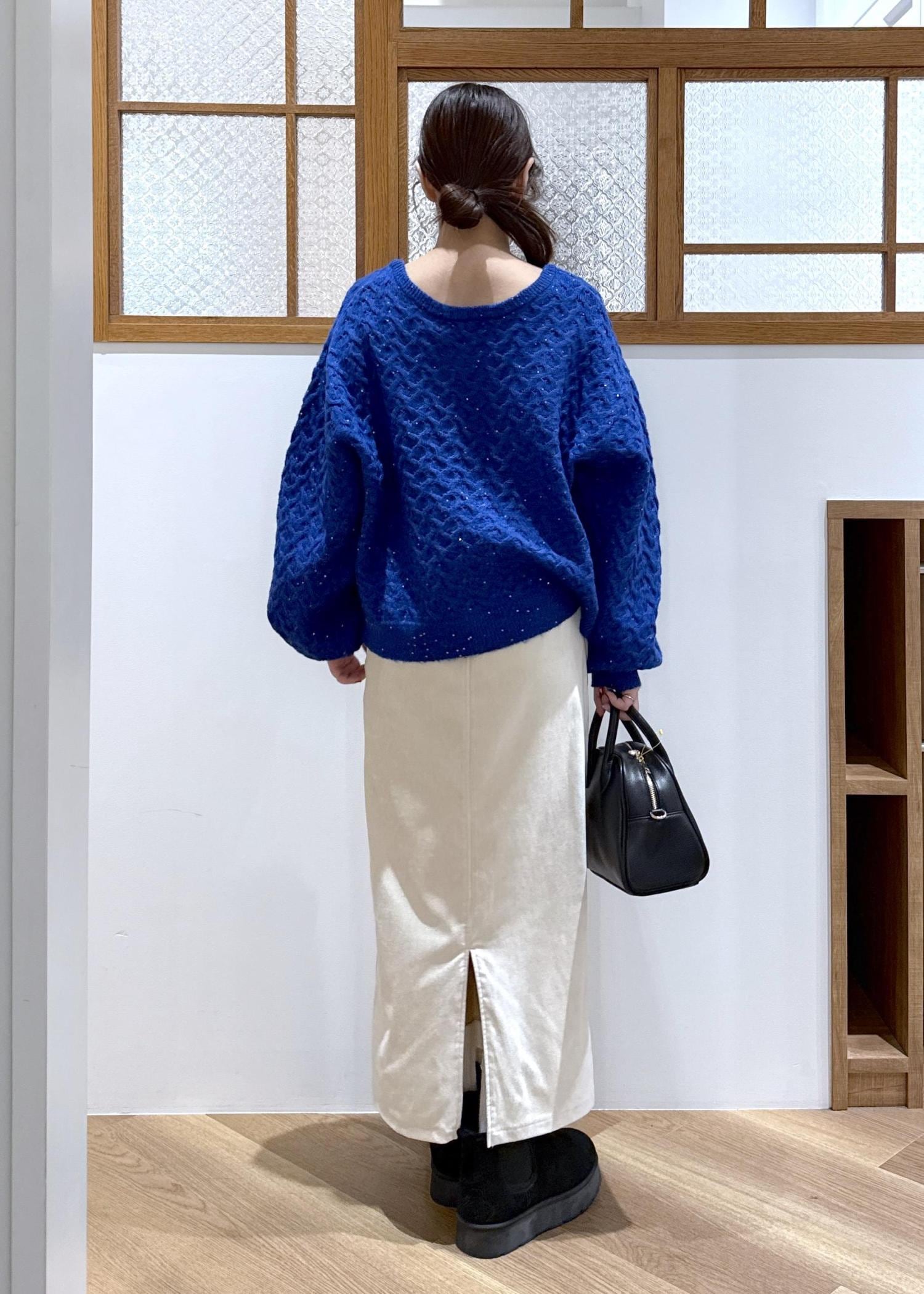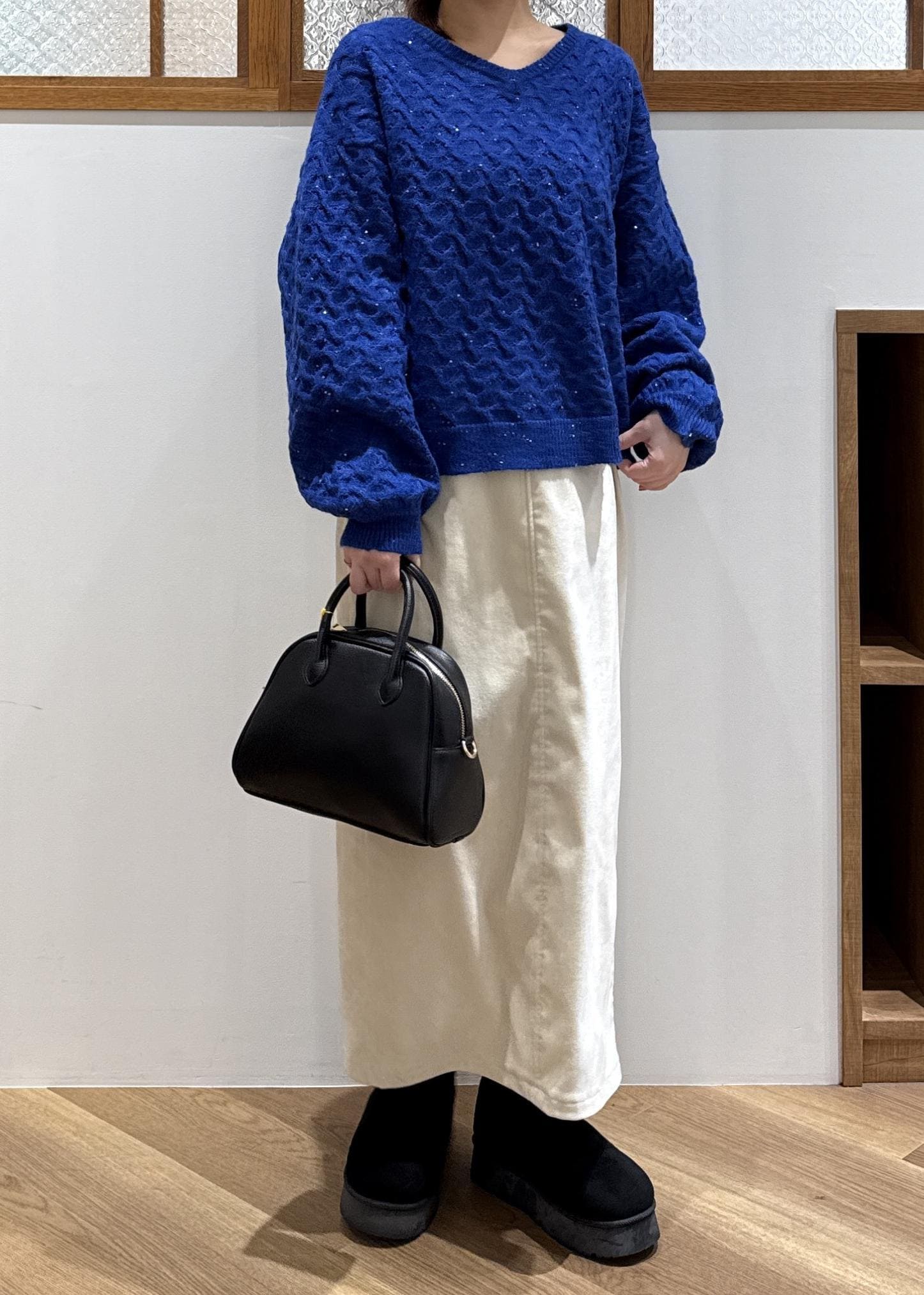 ブルーのニット以外はモノトーンのアイテムで揃えたコーディネートです。