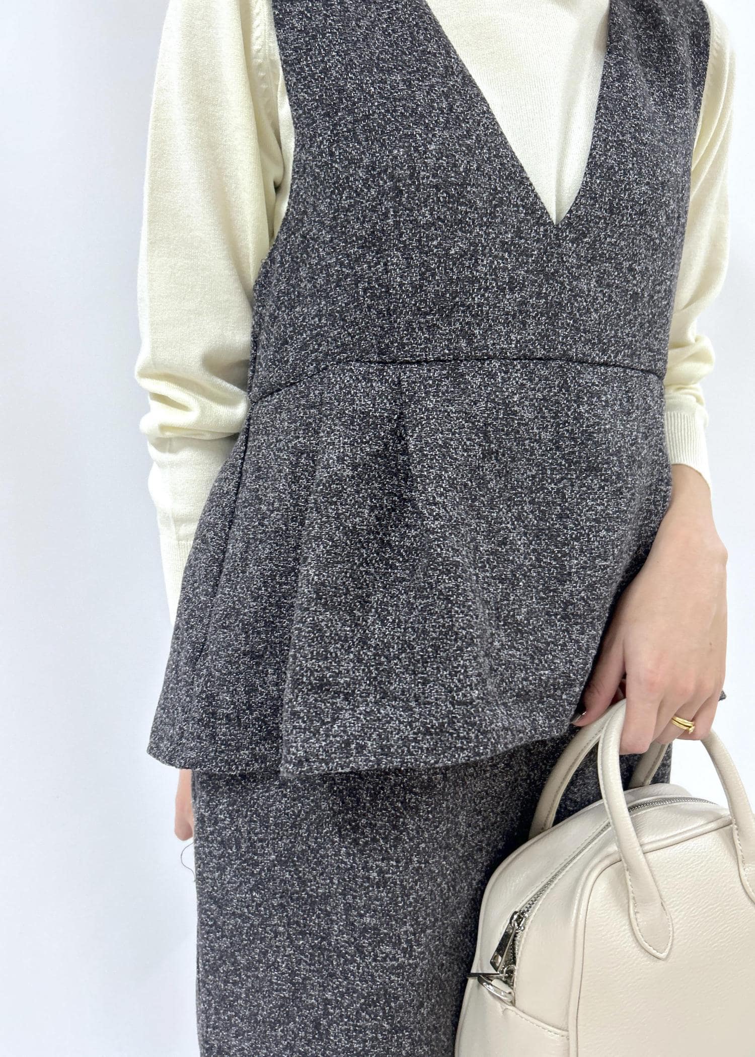 深めのVネックがスッキリ見せてくれ、ペプラム切り替えがお腹や腰回りもカバーしてくれます。