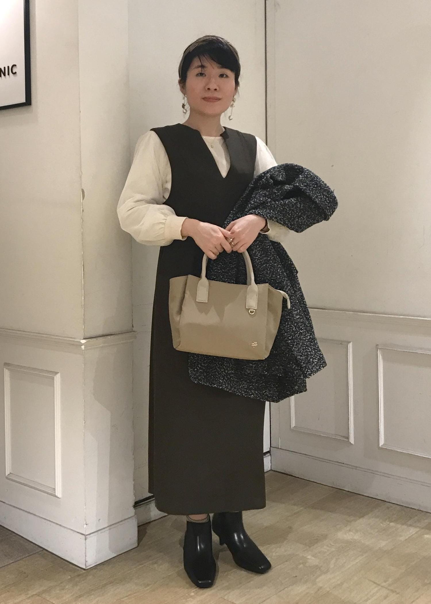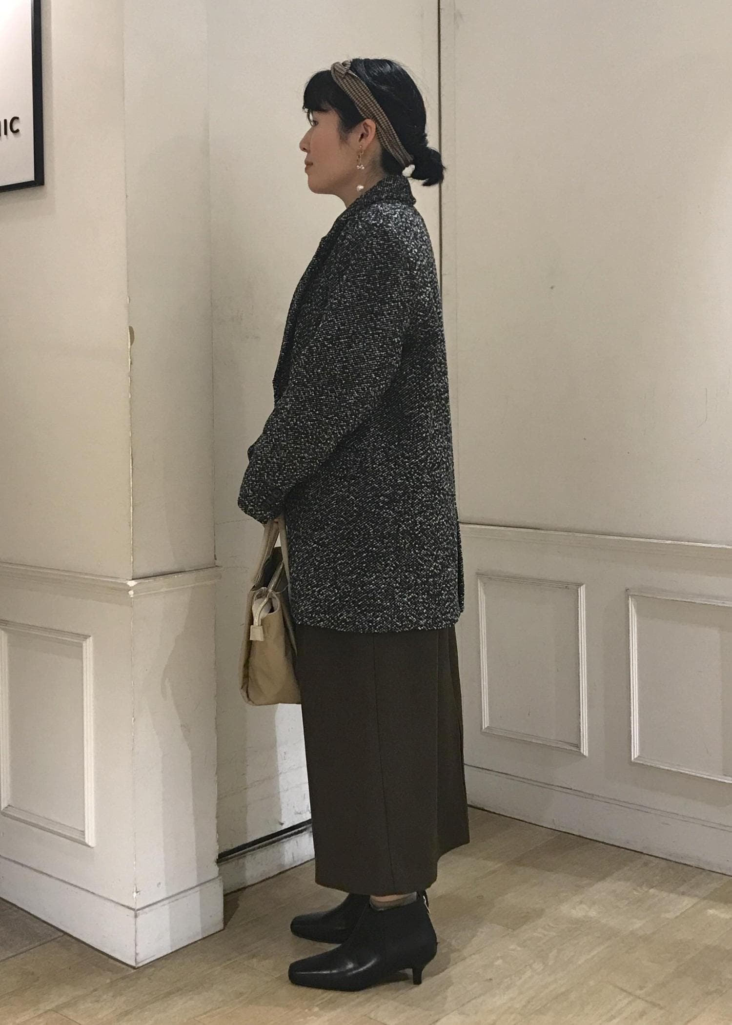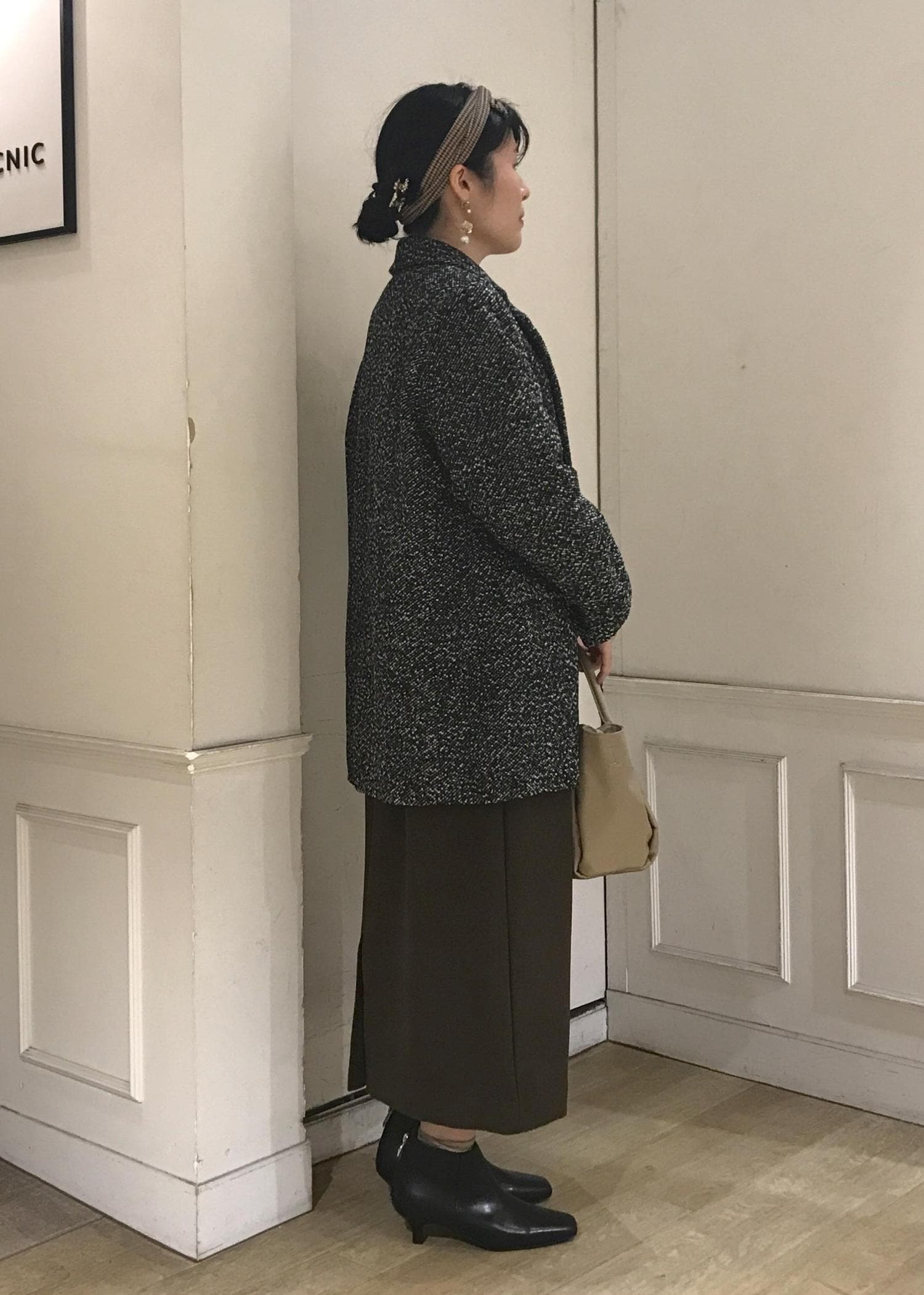 キーネックのジャンパースカートにチュールインナーでフェミニンに合わせつつ、ジャコットでパリッと感もプラス。甘辛ミックスでコーディネートを楽しんで頂けます。