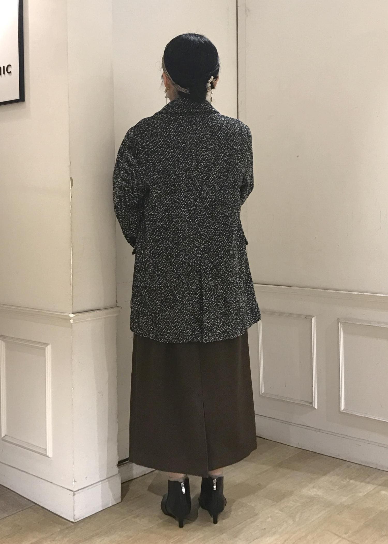 ジャケットのようなシルエットのコート。厚地の生地で暖かみがあり重厚感ある羽織。軽い羽織りものとして使って頂けます。