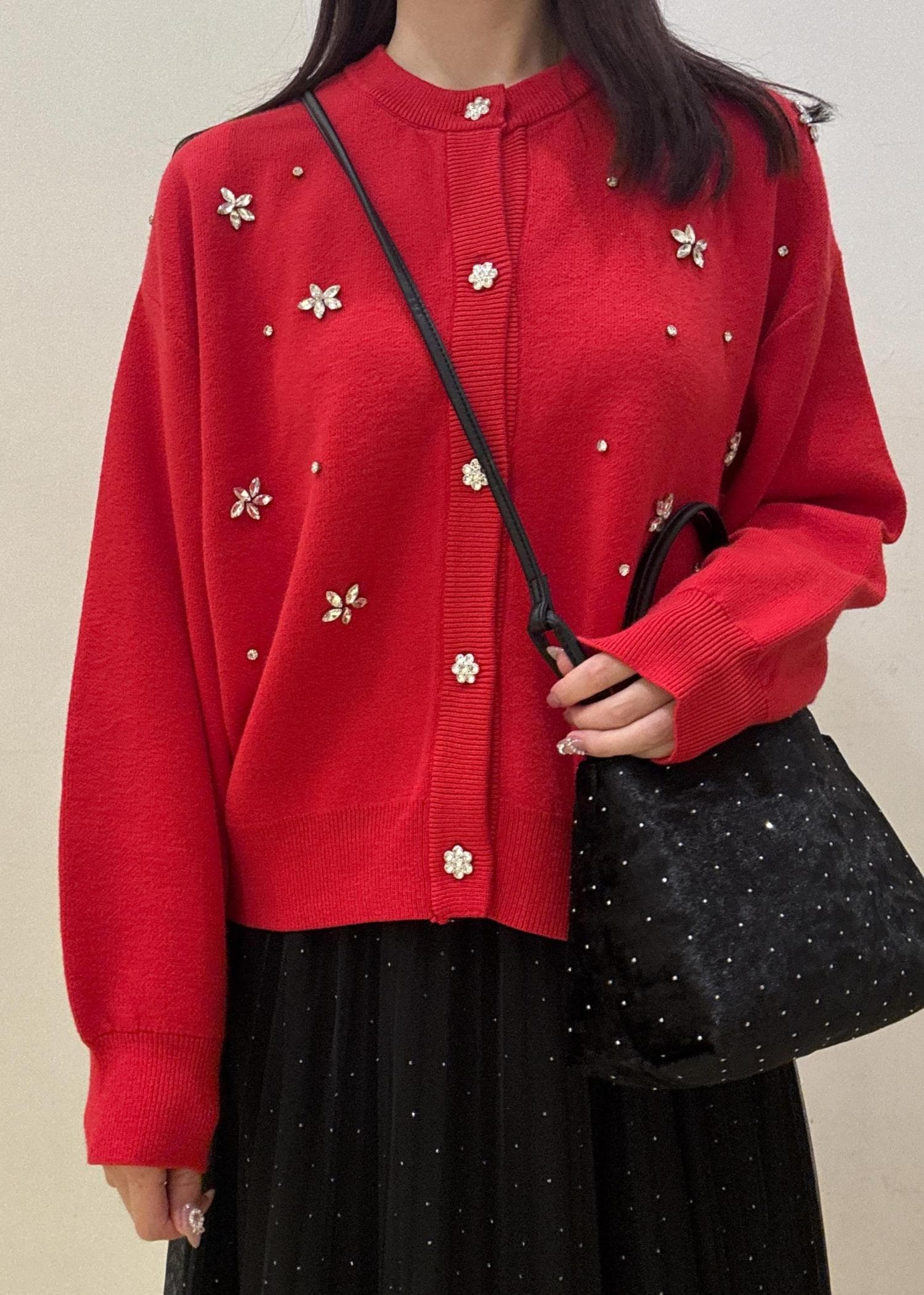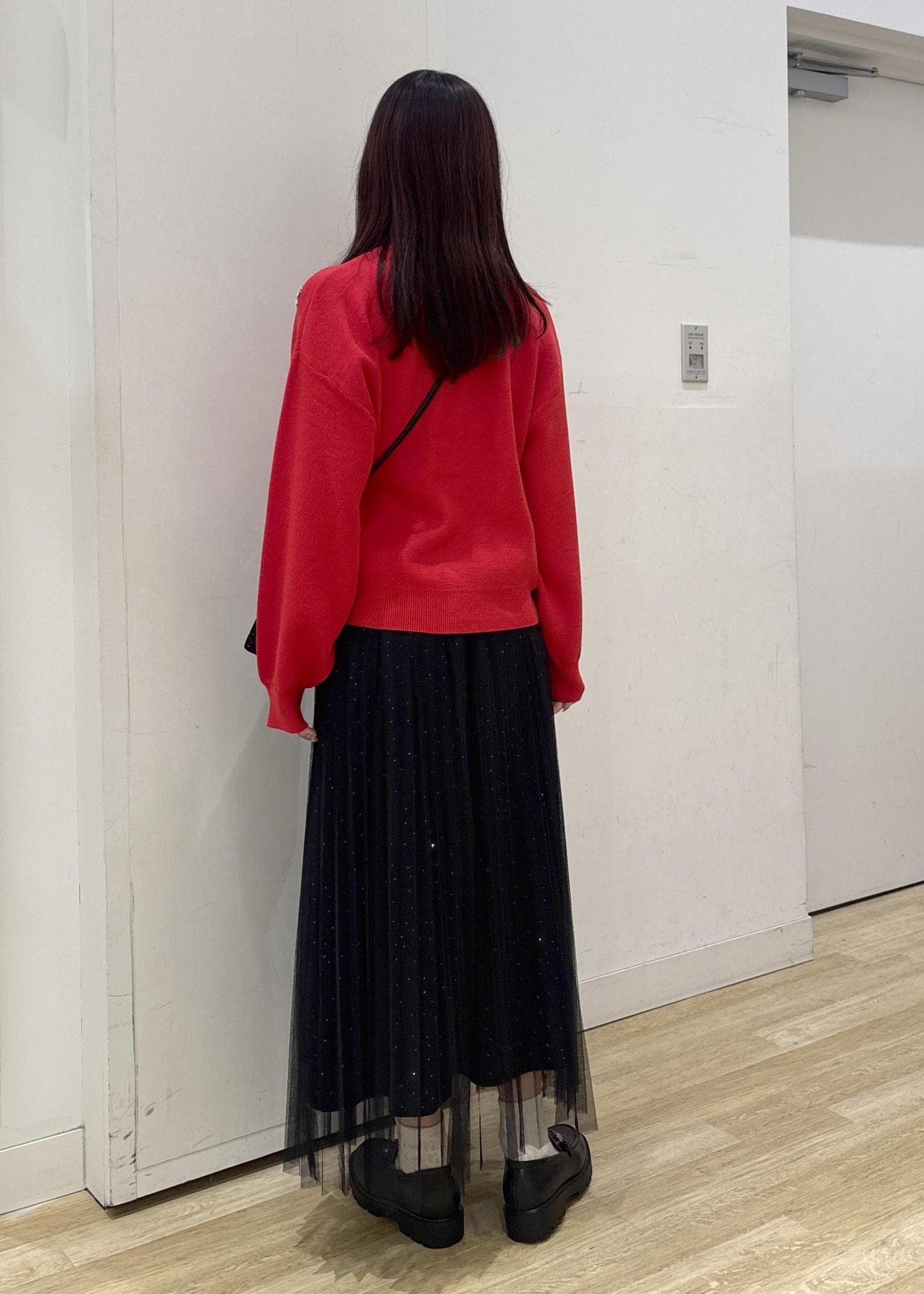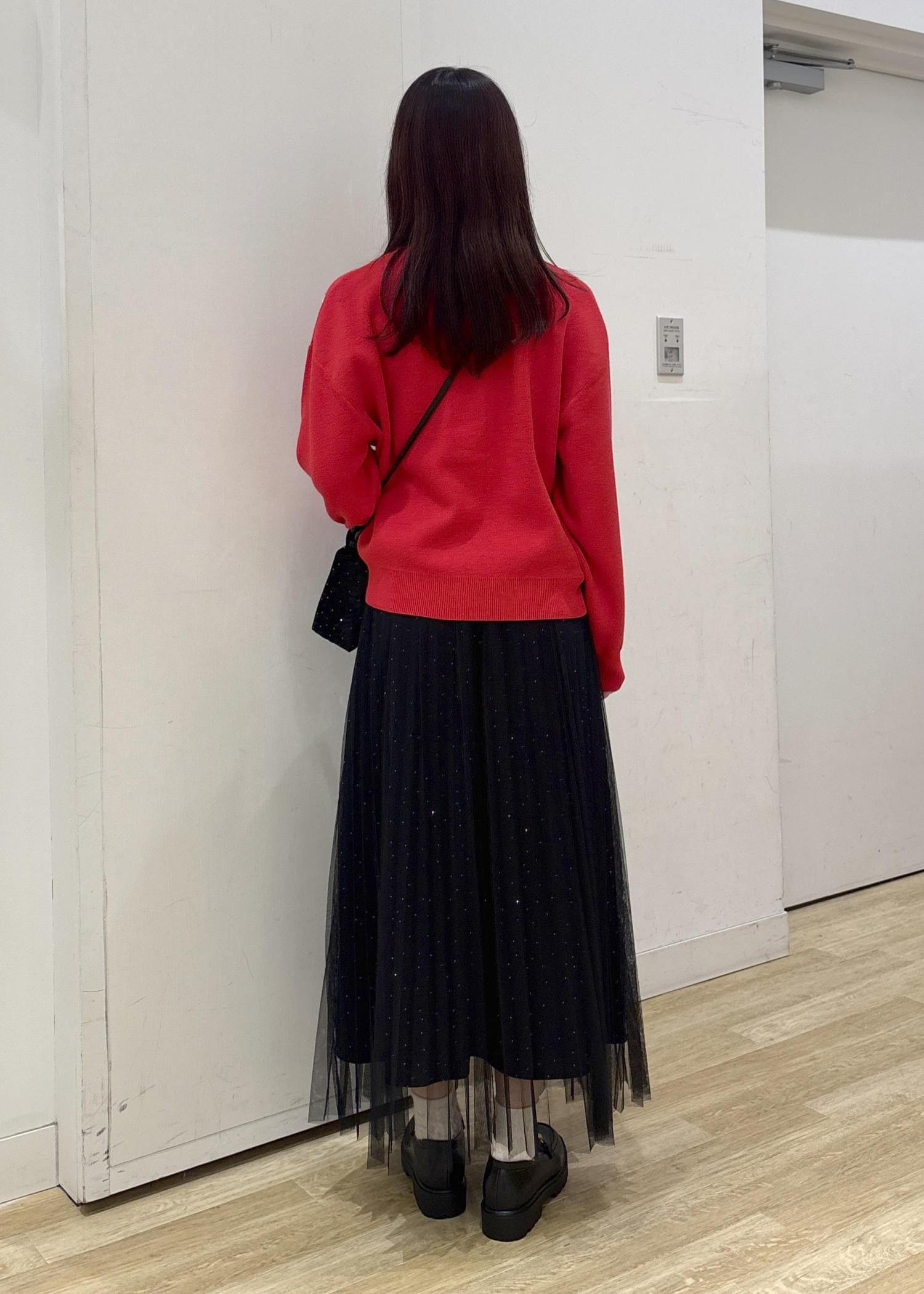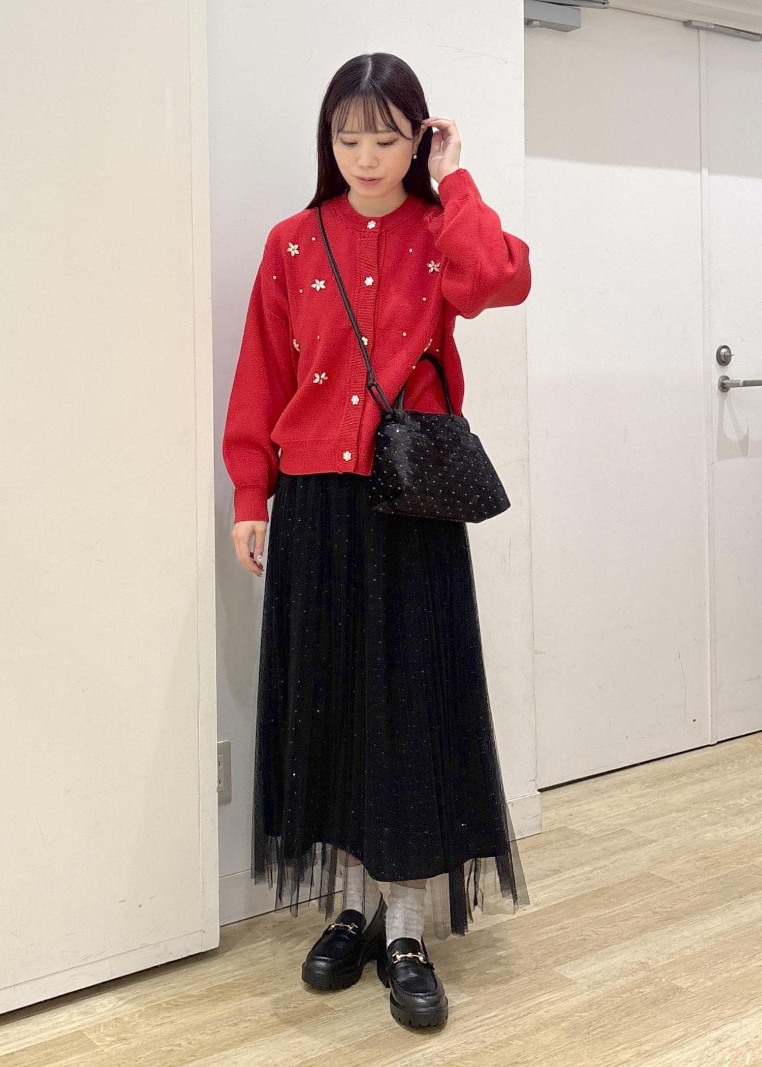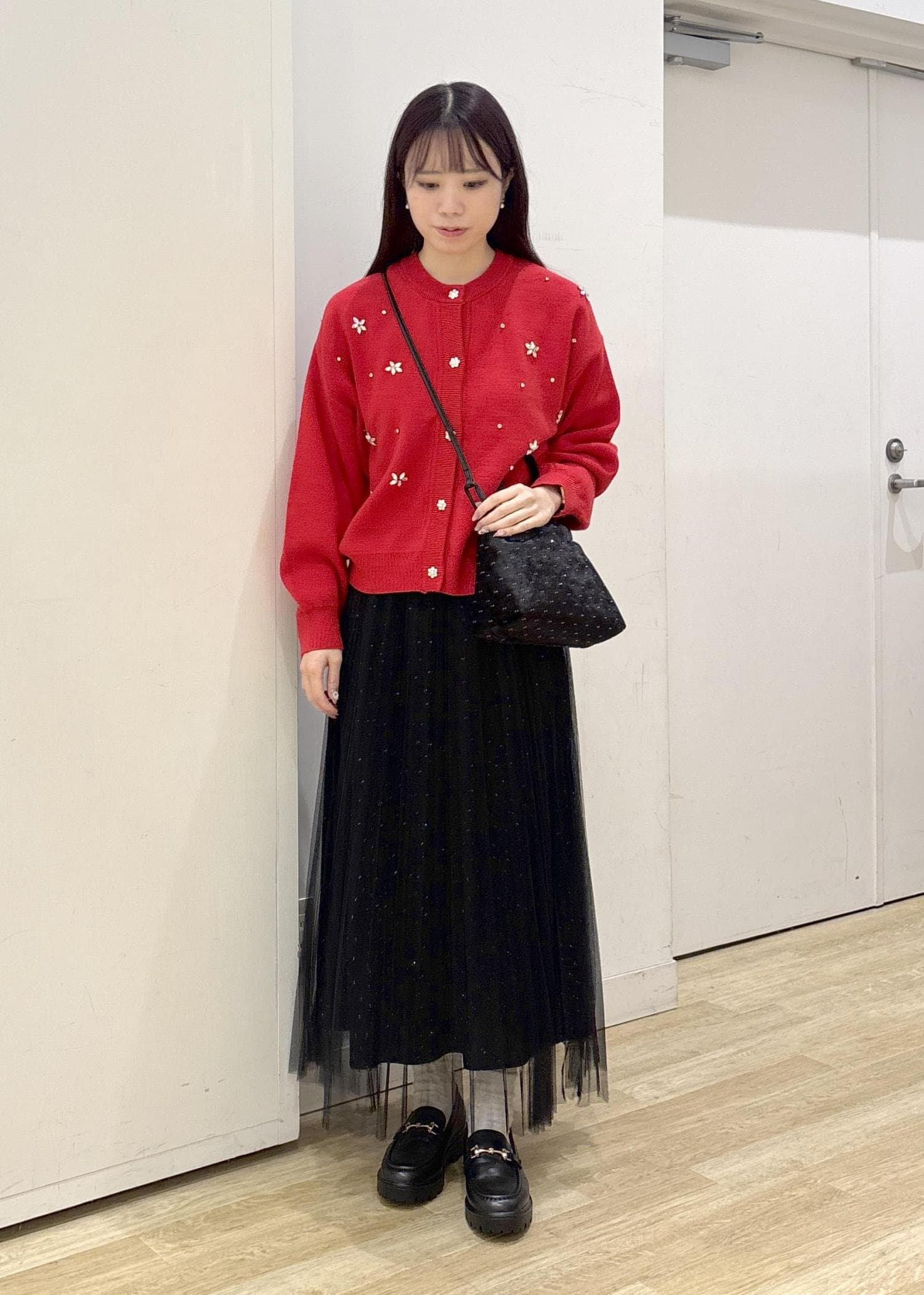 華やかな赤のビジューカーディガンとキラキラとしたチュールスカートを合わせて女子会にもぴったりなコーディネートに仕上げました◎
