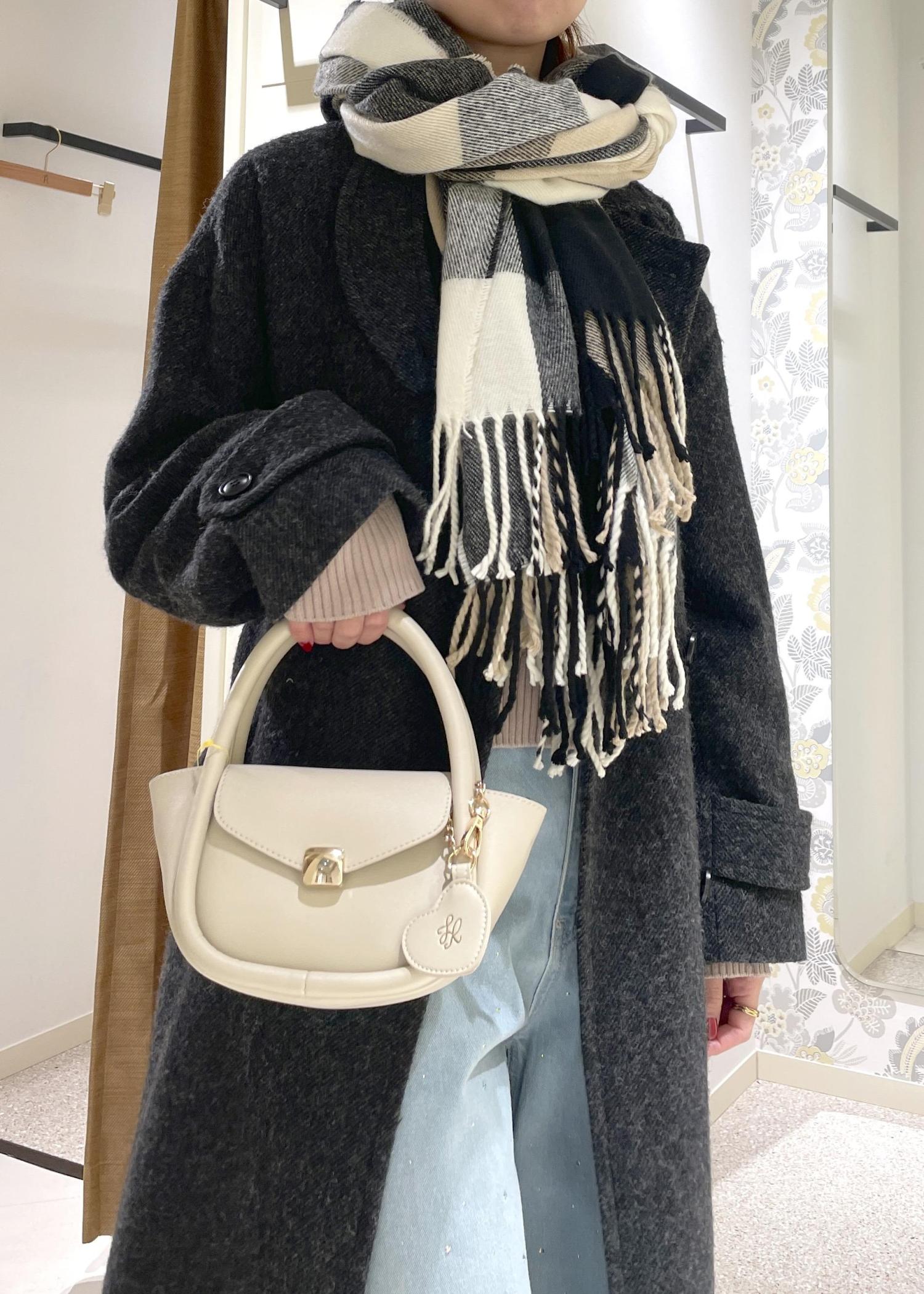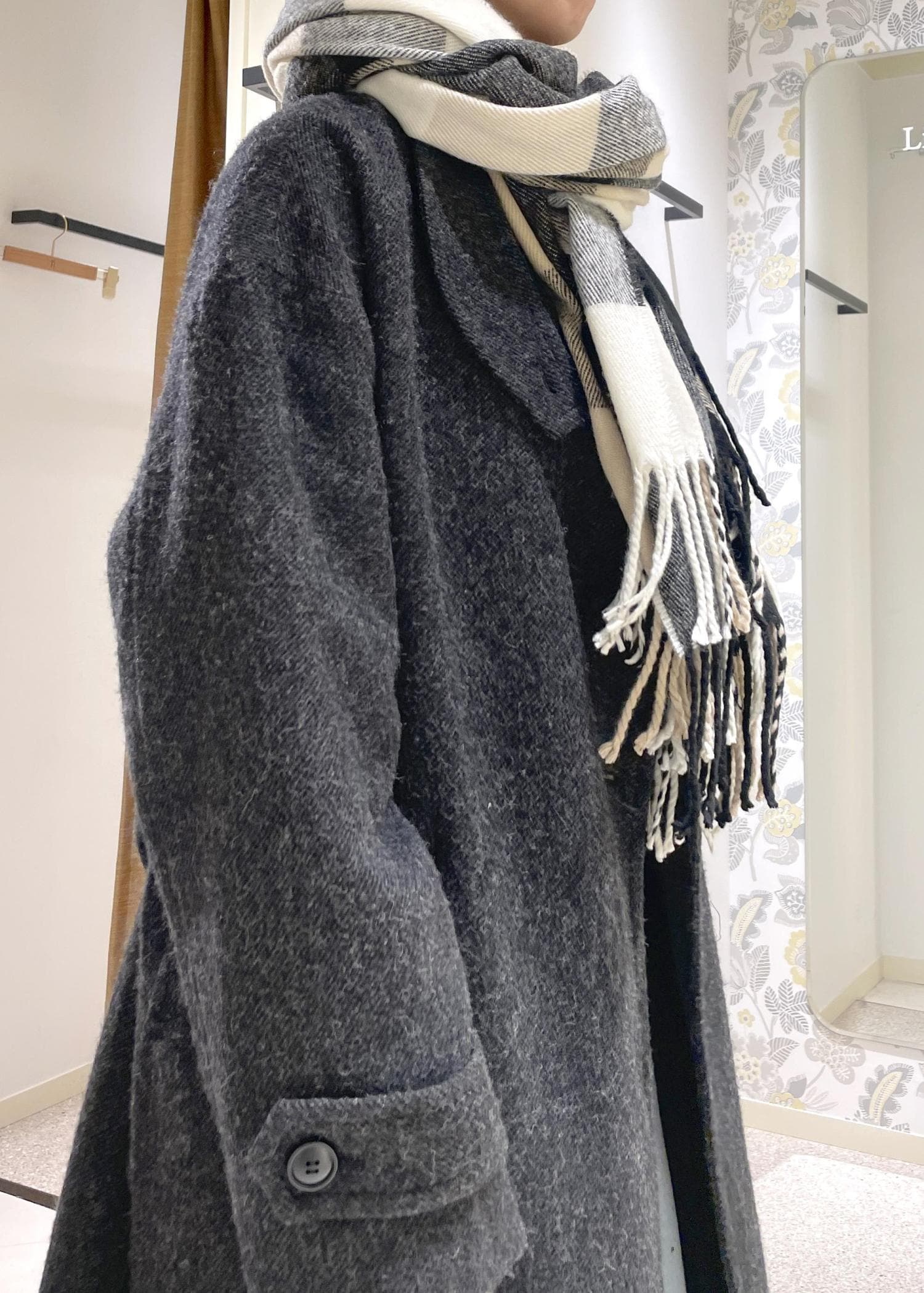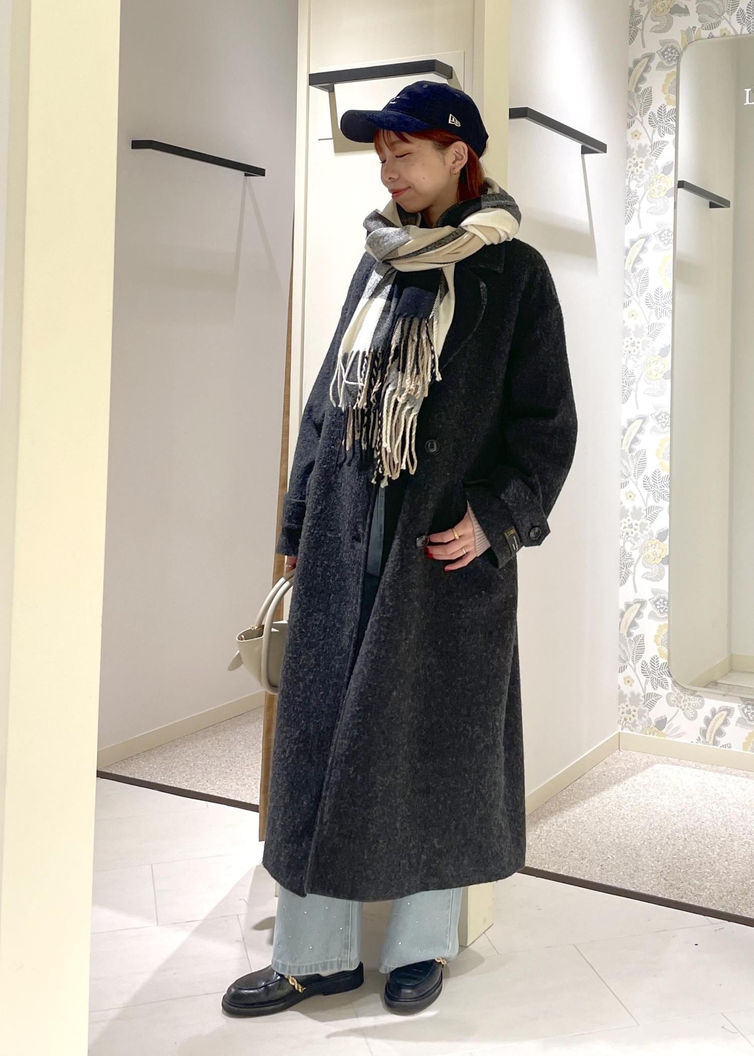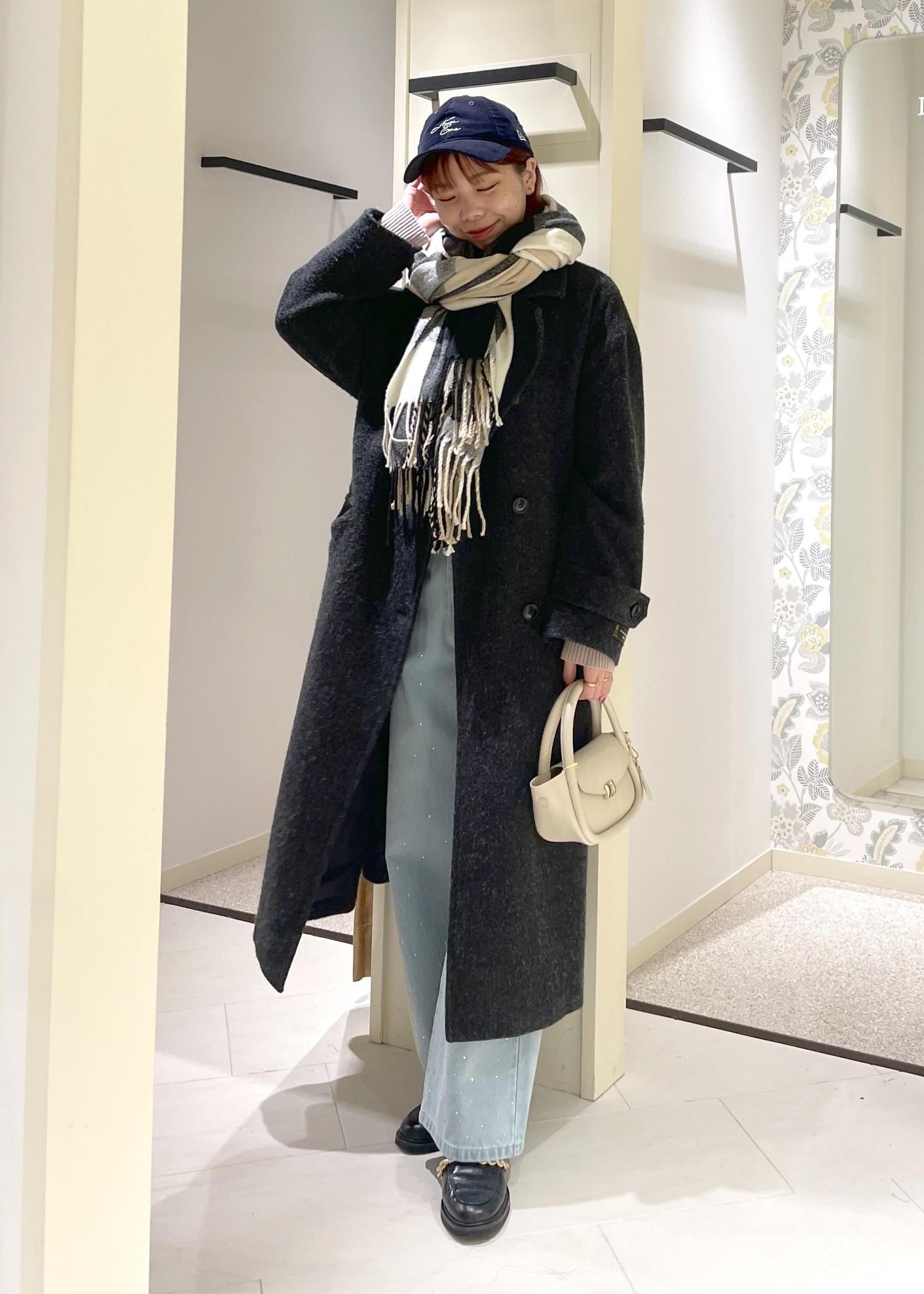ロングコートを羽織っても重たく見えないよう、キャップやストールで目線を上げてバランスも意識してみたのがポイントです。