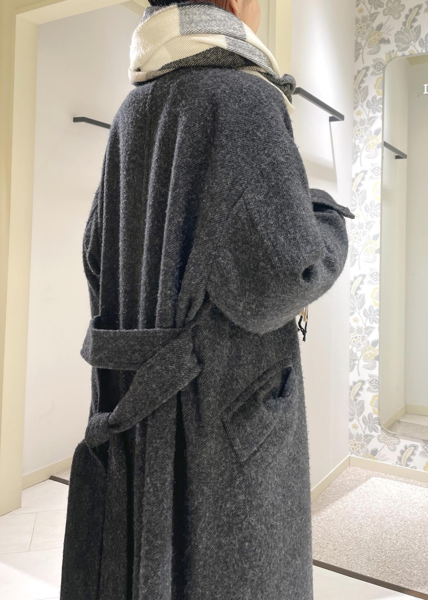 着丈は、膝下でロング丈ですが、ボタンやポケット位置が高く、ネックのデザインもあり、重量感を感じずバランス良く着て頂けます。
