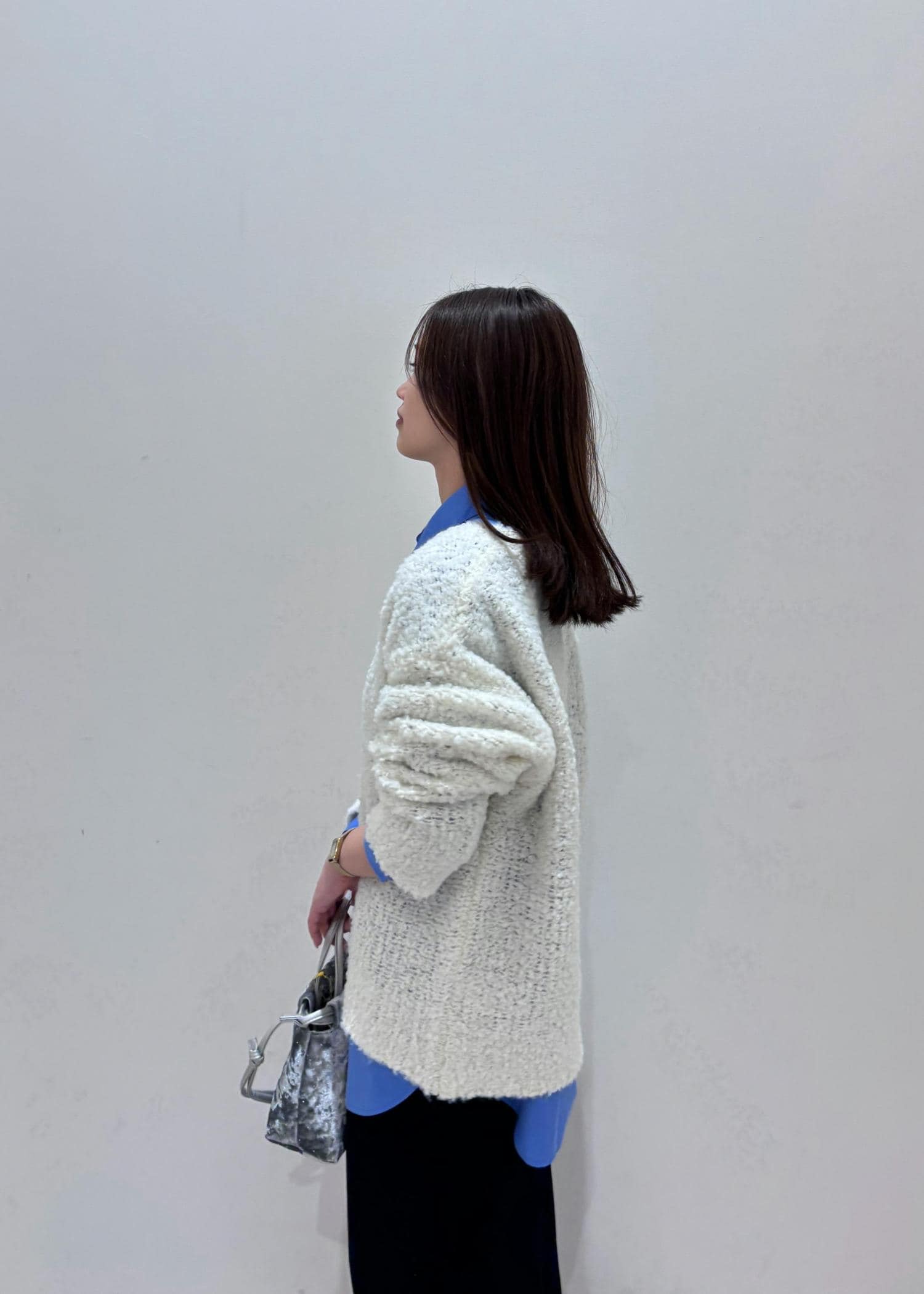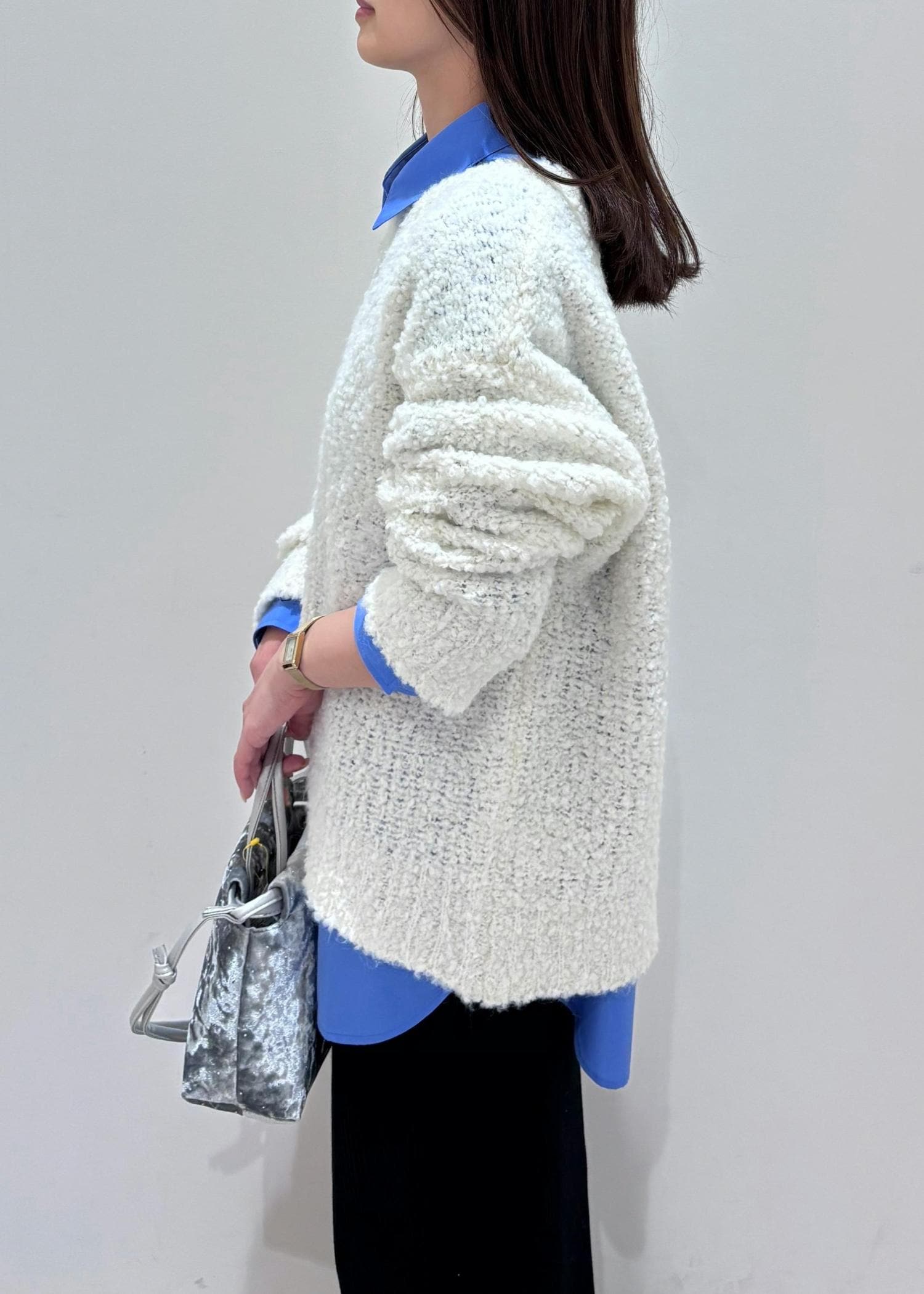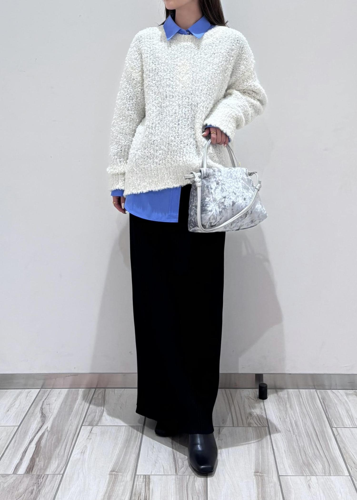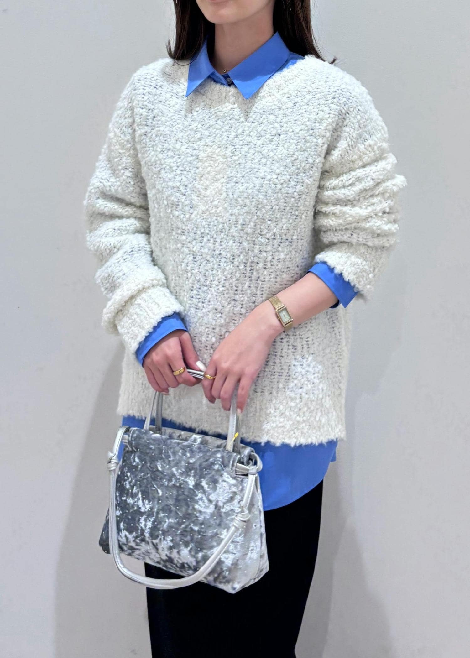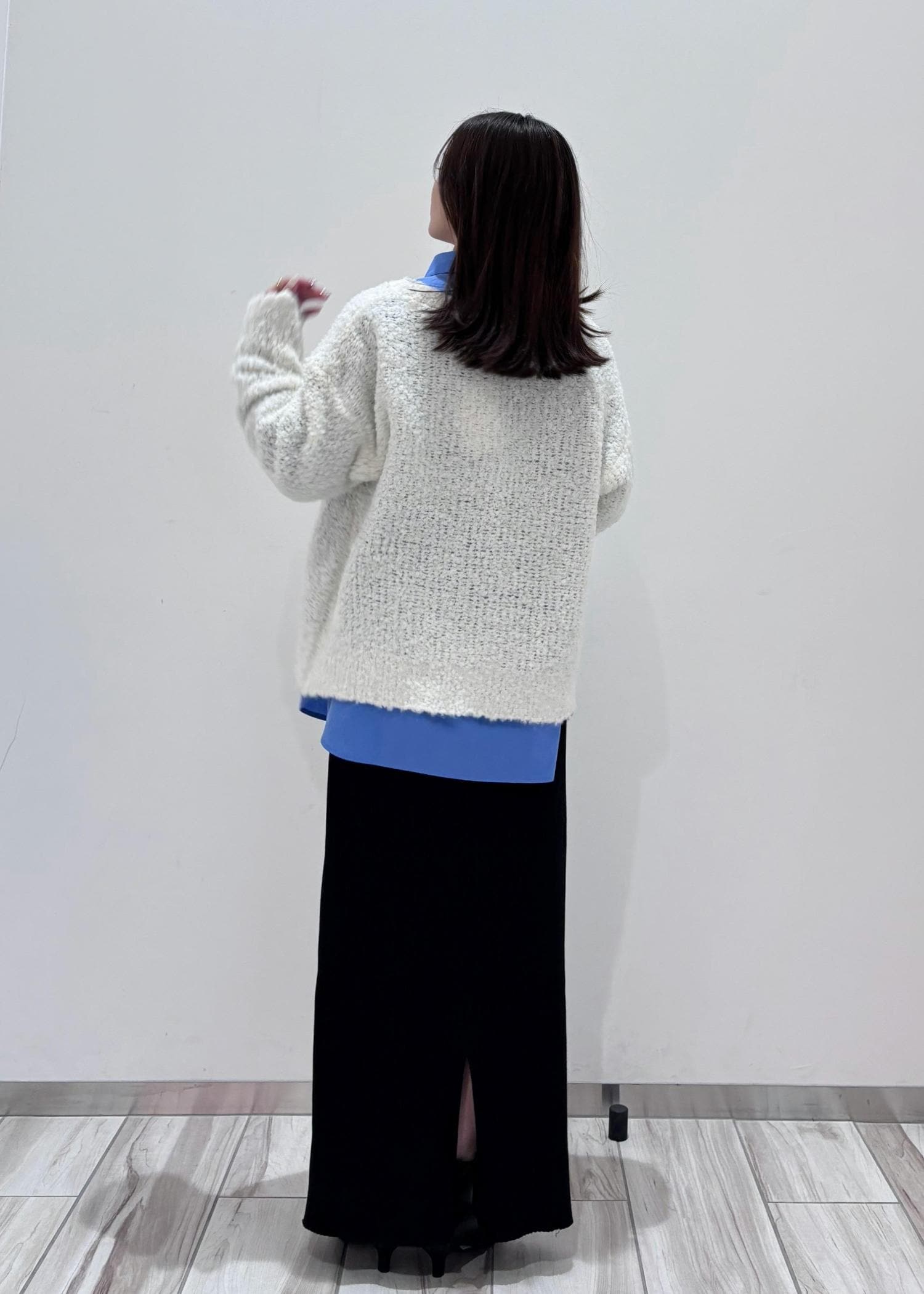 ブルーシャツと、ポコポコ感が可愛いブークレニットをレイヤードし、Iラインタイトスカートでバランス良く綺麗め、カジュアルに着てみました♪