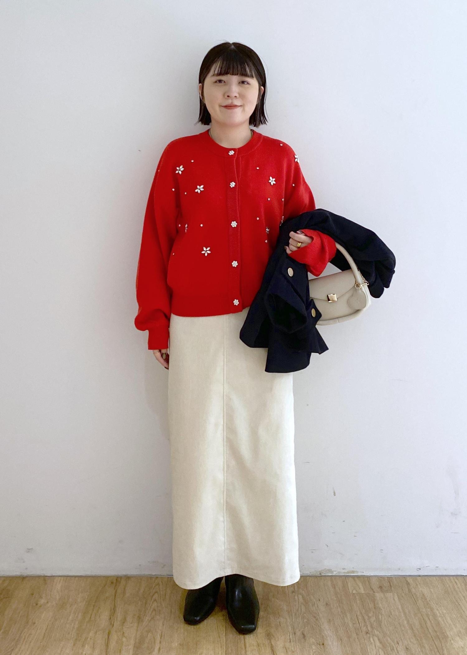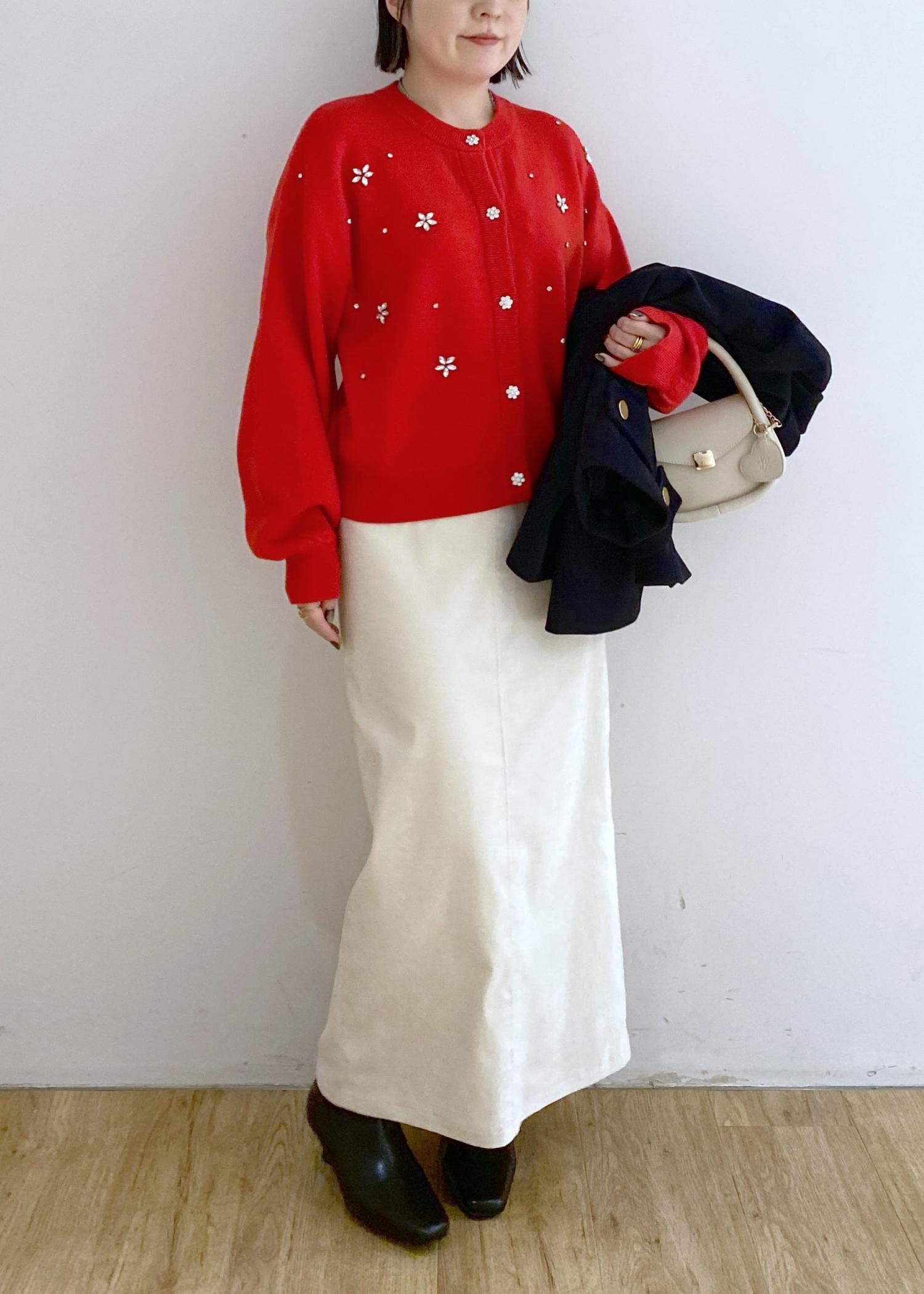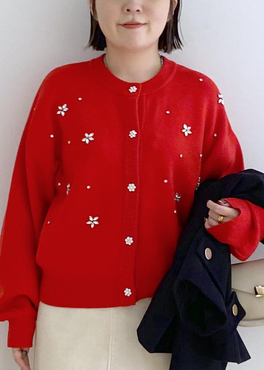 赤ビジューのカーディガンに
