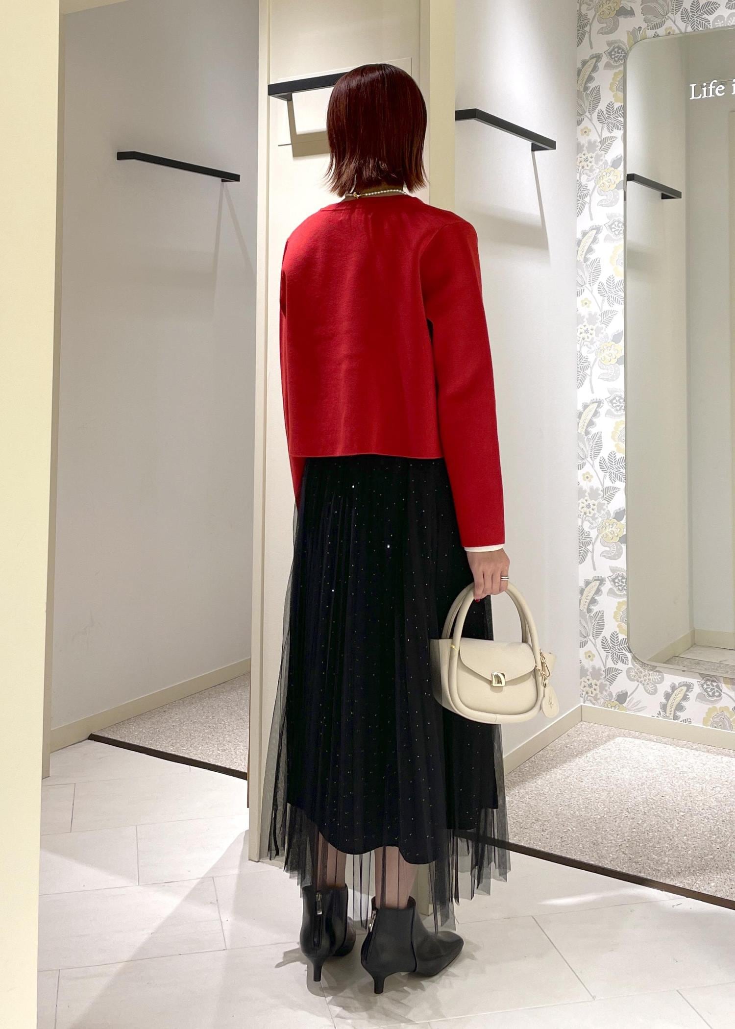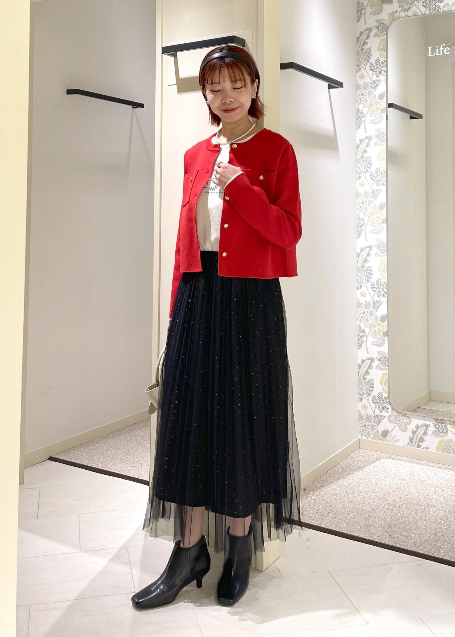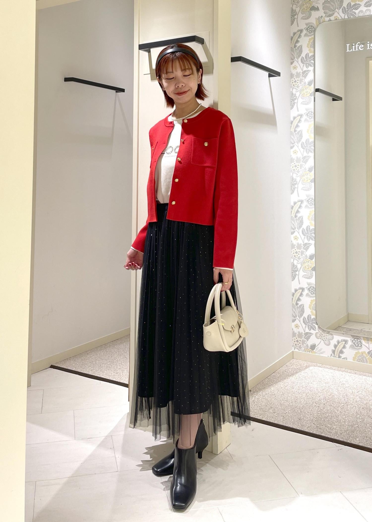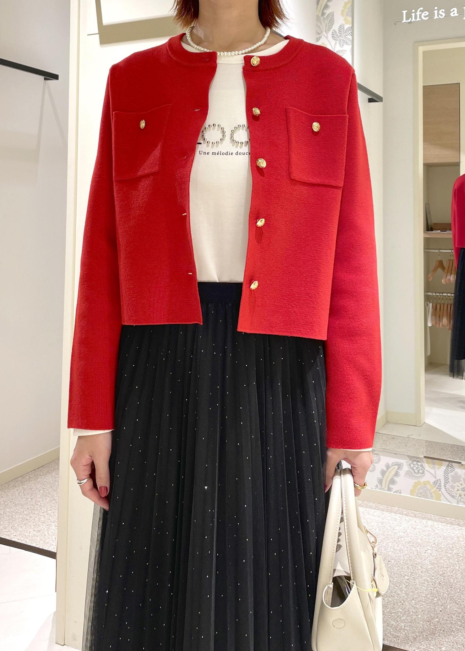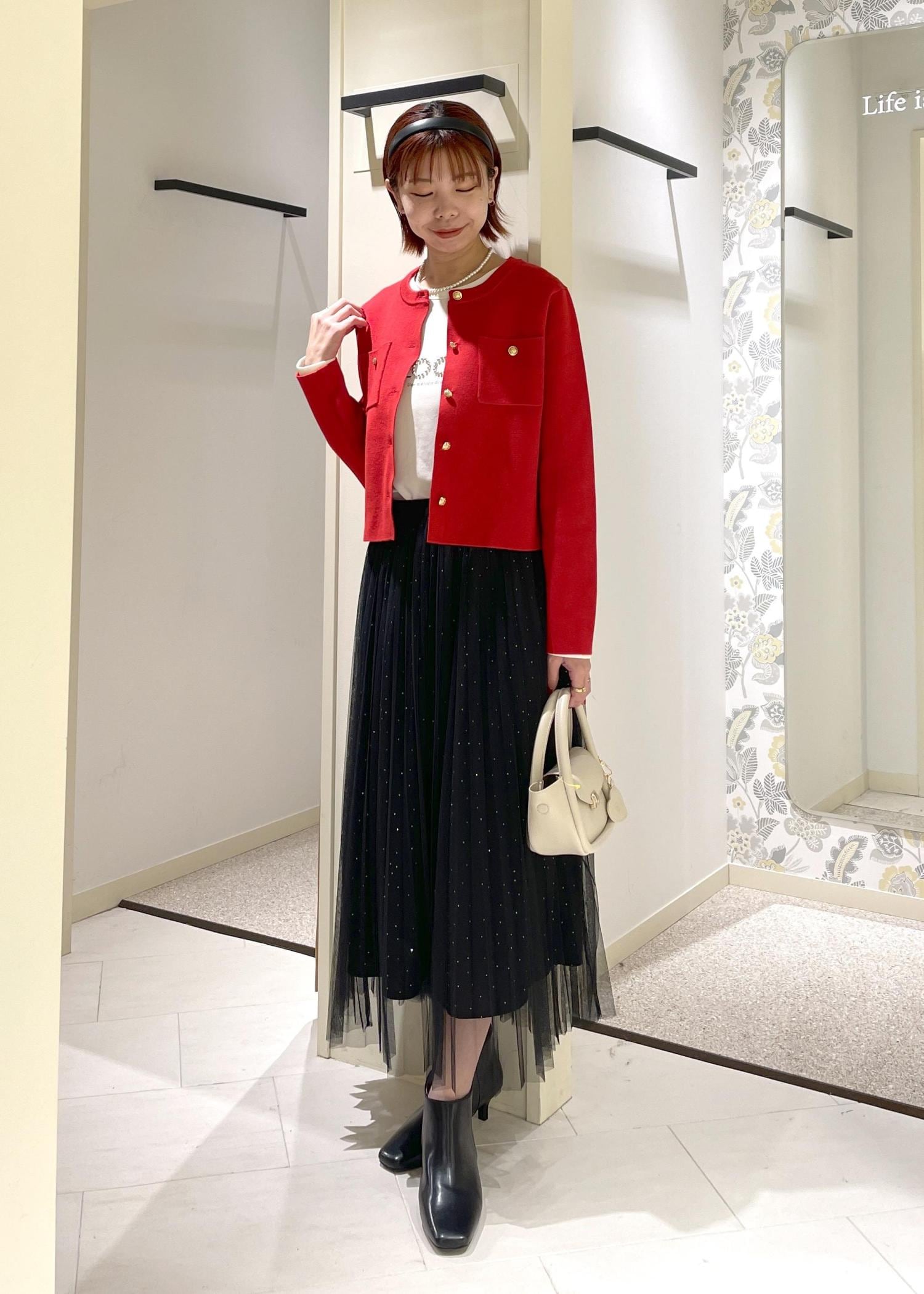 ゴールドボタン×レッドの華やかなカーディガンにチュールスカートを合わせた大人カジュアルコーデ。