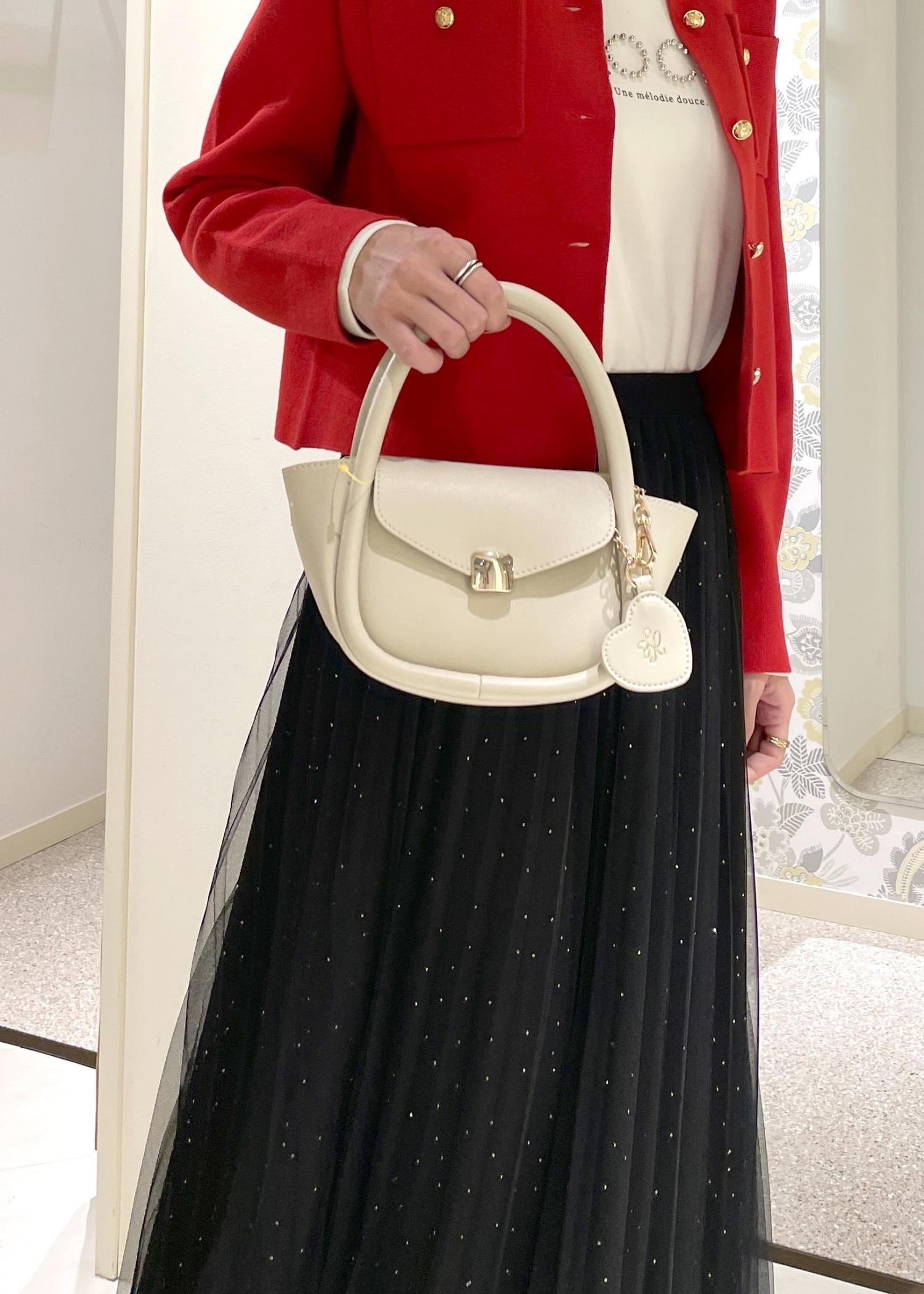 間口が広いので物の出し入れもしやすく、ショルダーベルトも付いている為、デイリーにもパーティーバッグとしてもお使い頂けそうです。 -