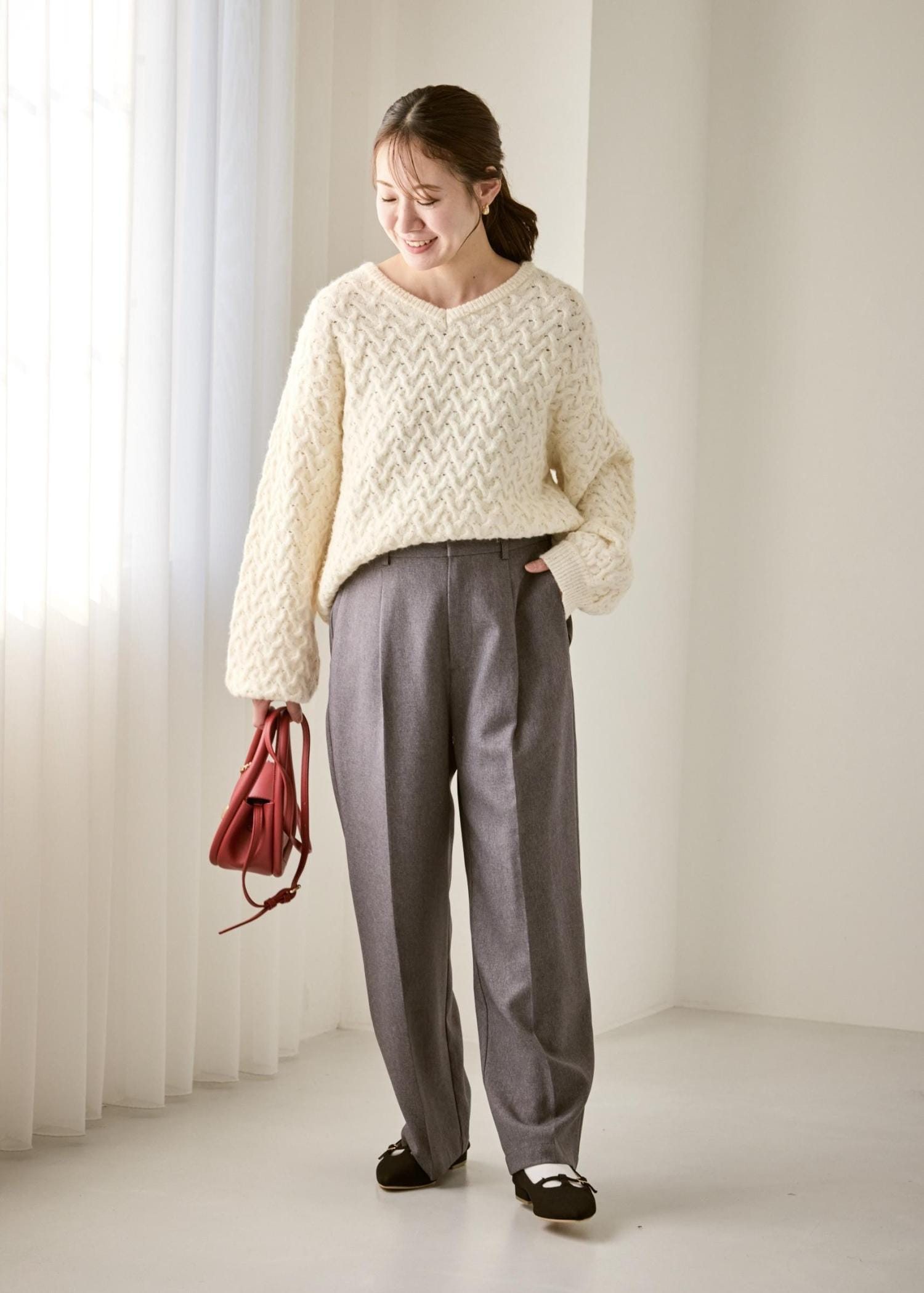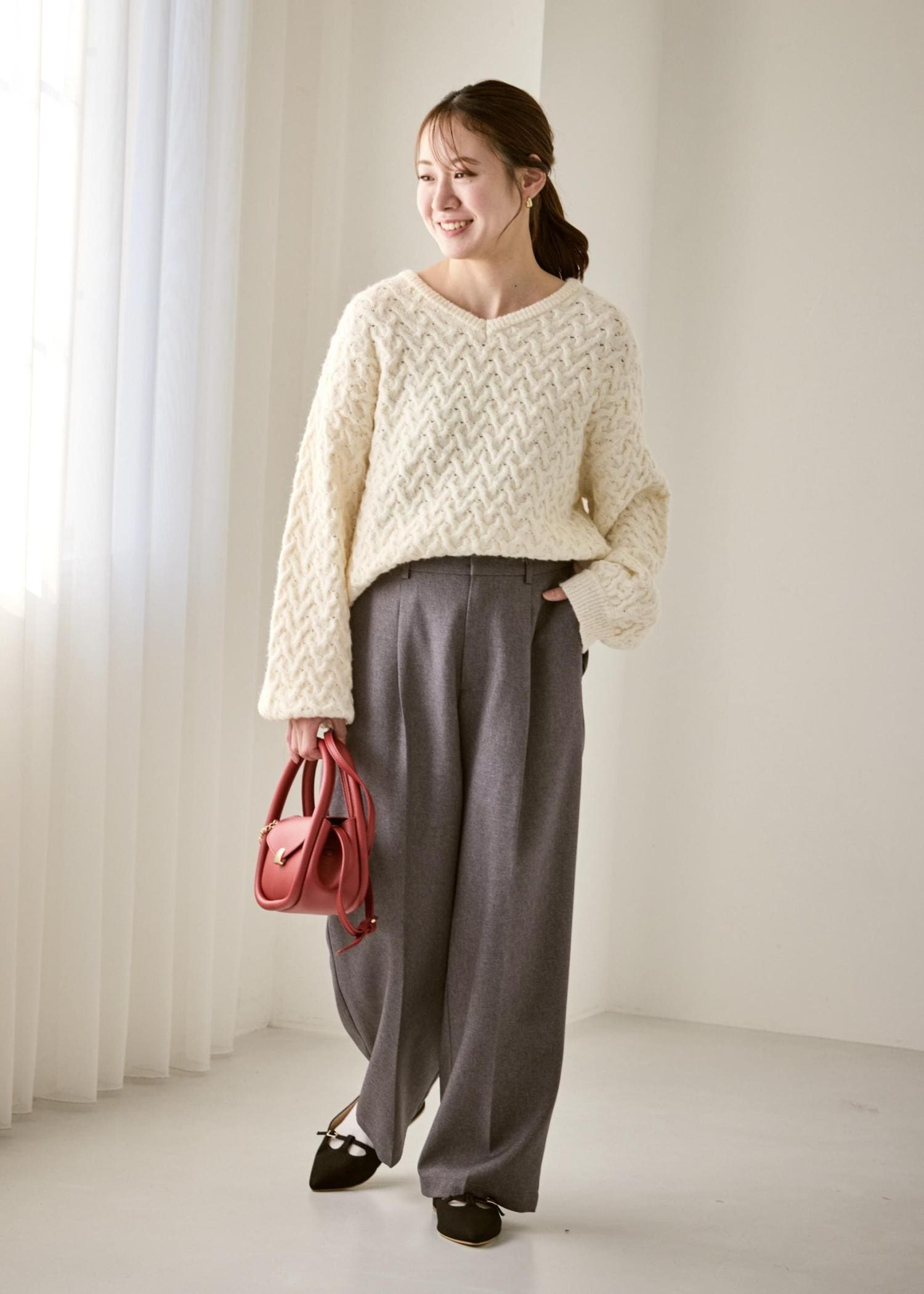 ニットとパンツのシンプルなコーディネートですが、ニットにはスパンコールが散りばめられていて、着るだけで可愛らしい印象に!